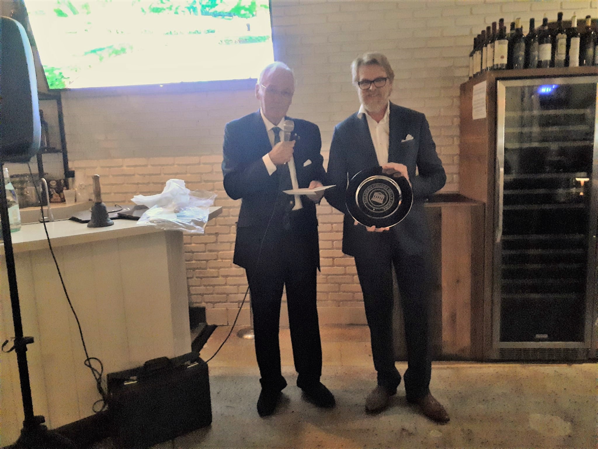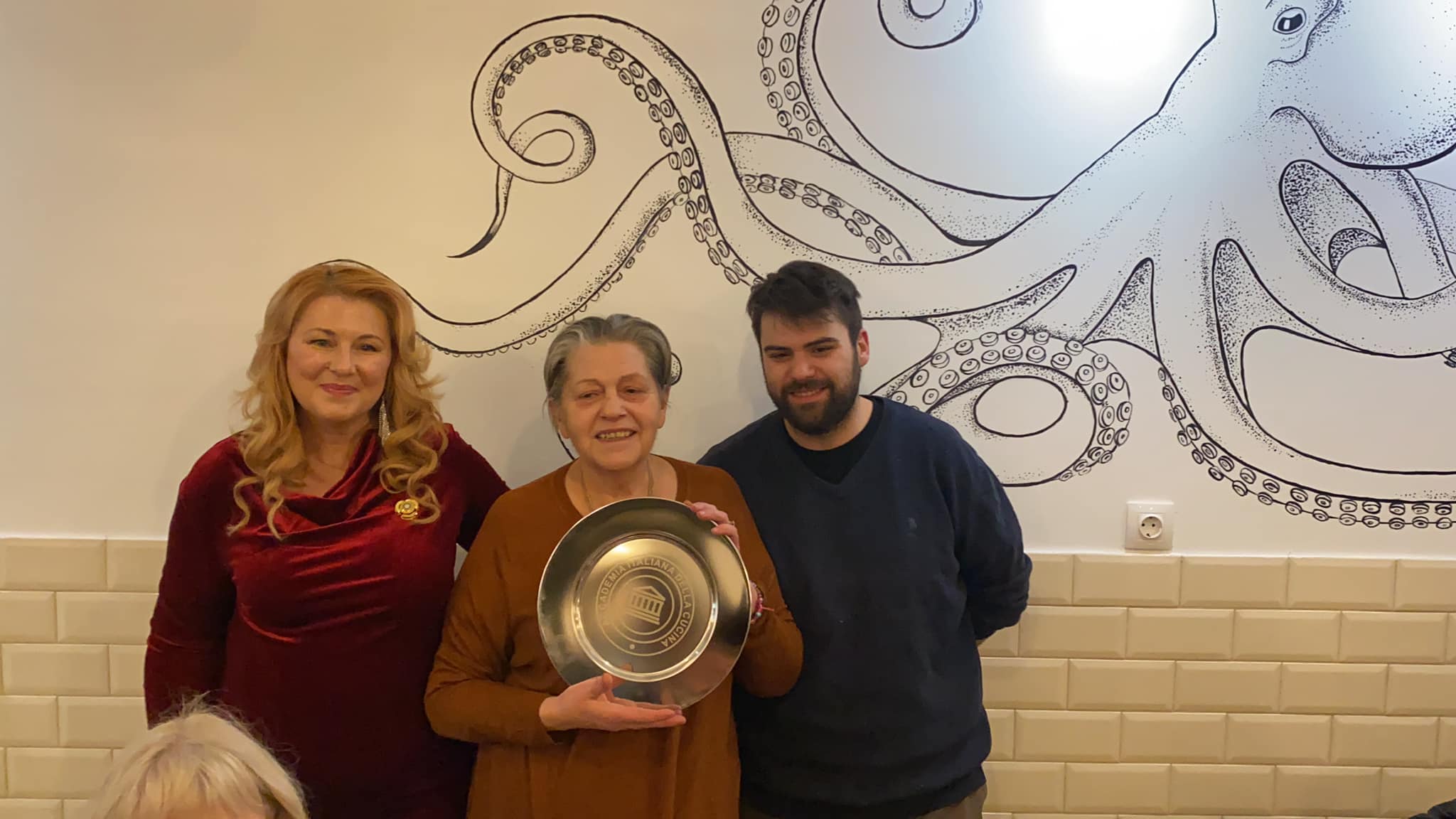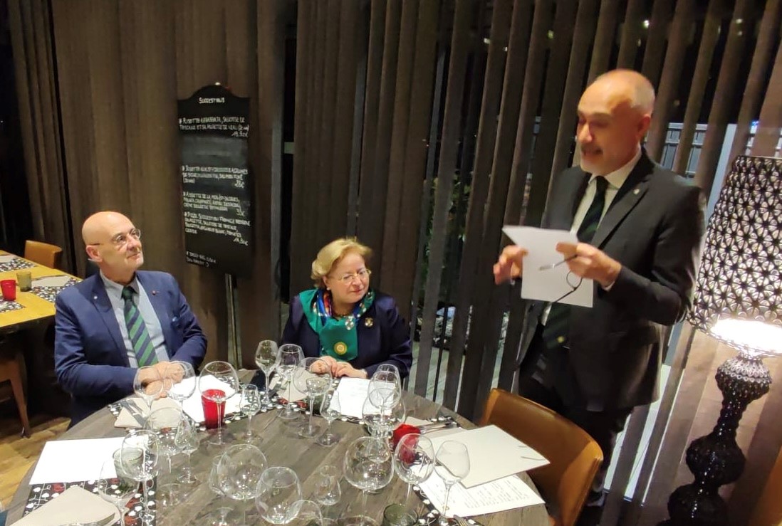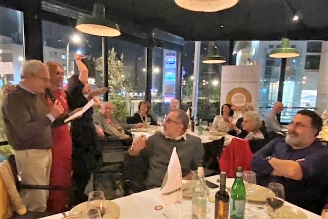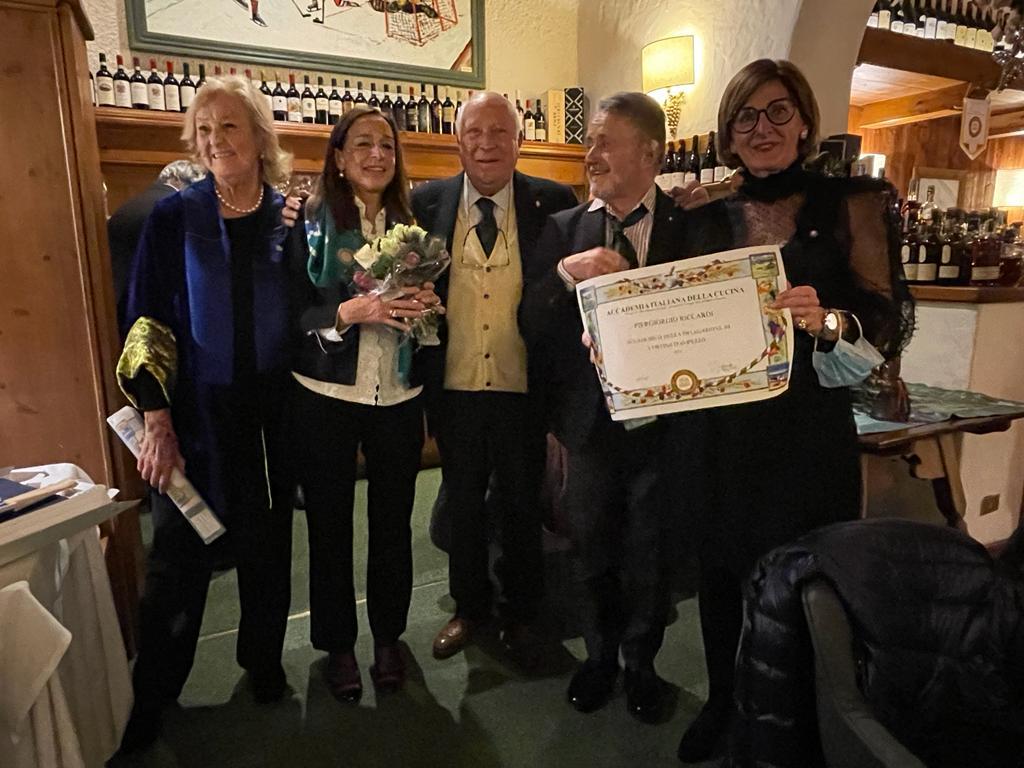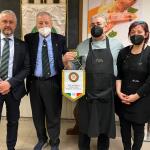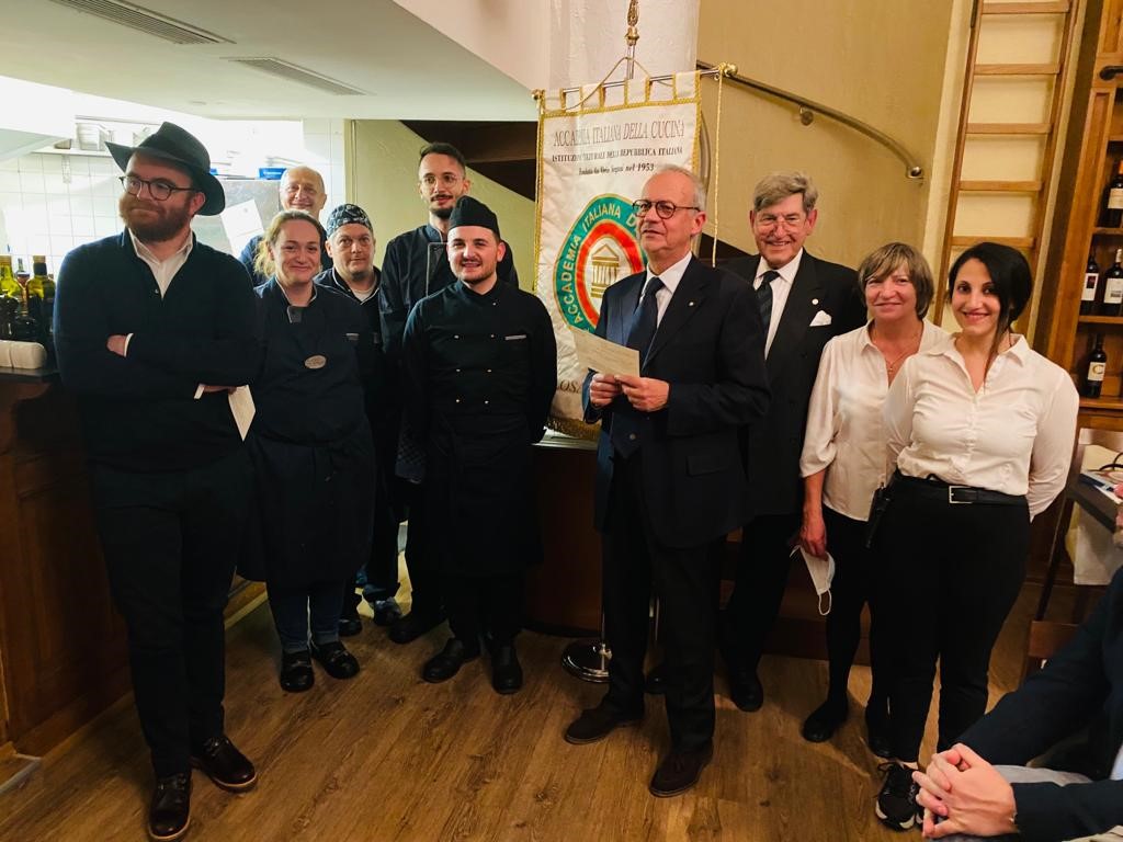 Si è tenuta al ristorante “Antica trattoria” di Alberto Alloro a Losanna, la quinta tappa del Giro d’Italia delle cucine tradizionali delle sue Regioni organizzata dalla Delegazione di Losanna-Vennes. Per la riunione conviviale degli auguri di fine anno è stata scelta la tradizione natalizia laziale, in particolare romana. Sul tema ha relazionato il Delegato Alessandro Caponi che ha ricordato ricette e prodotti tipici laziali. Sono stati serviti i cappelletti alla romana, realizzato seguendo la ricetta tradizionale dei laboratori di Mauro Traiteur, premio Massimo Alberini 2021, che ha fornito anche il pane e la focaccia, particolarmente fragranti. Ottima la pasta e ceci servita con un filo d’evo della Sabina; leggera e molto apprezzata la frittura; da sogno i cappelletti cotti a puntino in un brodo dal profumo straordinario; eccellente il cappone col suo ripieno. Molto apprezzati anche i vini in accompagnamento. Il servizio è stato rapido e sorridente, la critica brillante e simpaticissima, lungamente applaudita, davanti al gestore, alla brigata di cucina ed al servizio di sala, fieri del loro successo e felici del piacere che hanno preso nel preparare il menu concordato, come hanno tenuto a testimoniare ai presenti. Foto 1. Il momento della critica fatta dal Vice Delegato Renzo Baldino e dall’enologo Guillaume Pucci. Foto 2. La consegna del piatto d’argento al gestore Roberto Alloro.