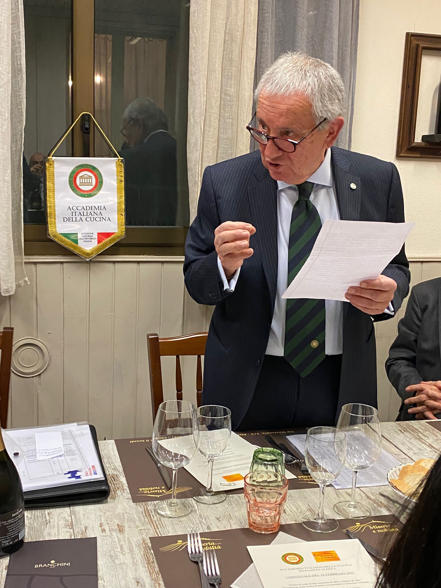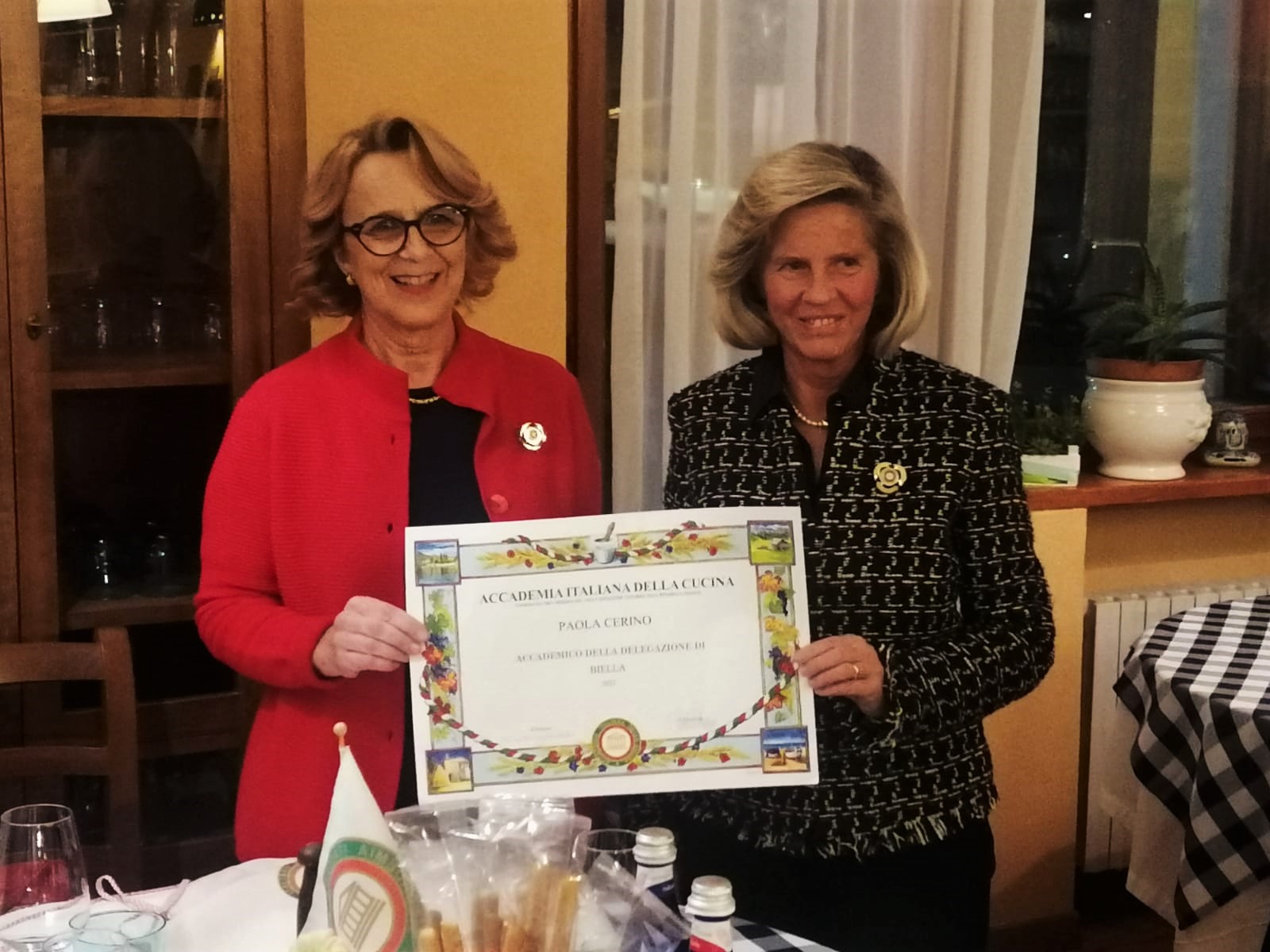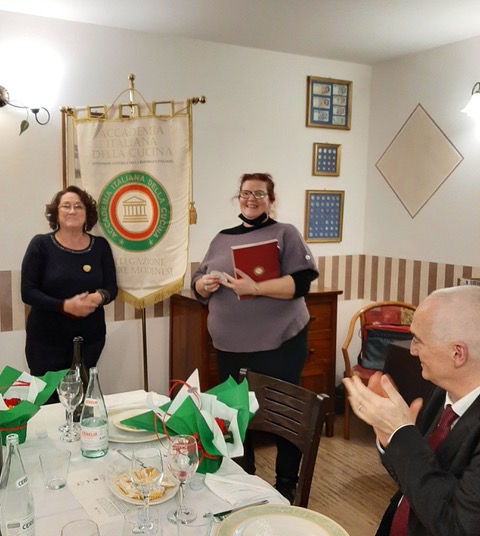 Tra passato e futuro in una serata di carnevale. Una tavola festosa con i colori dell’Accademia, quelli della identità italiana, giocati da bandierine e beneauguranti rosse primule vestite di bianco verde, per una serata istituzionale con resoconti del 2021 e progetti per i primi mesi del 2022. Solo a fine febbraio la Delegazione ha potuto riprendere i convivi, rassicurati dalla migliore situazione pandemica generale. E gli Accademici hanno festeggiato il giovedì grasso con un menu invernale, giocato tra fritti e lessi, ben preparati da Antonella (in foto 2 con la Delegata Rosalba Caffo Dallari) e Luca del ristorante Zoello di Castelvetro di Modena, che vanta una tradizione di accoglienza, simpatia, buona cucina casalinga e piacevole atmosfera familiare. Tra lambrusco di Sorbara e Grasparossa, racconti di piatti e prodotti alla ricerca di tipicità attraverso i diversi nomi, anche dialettali, e facezie, la serata si è svolta in un clima di armonia collettiva. Un inizio di buon augurio.