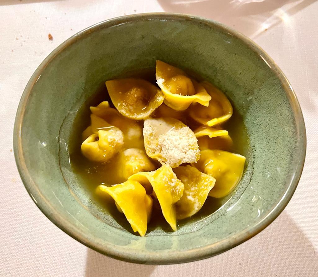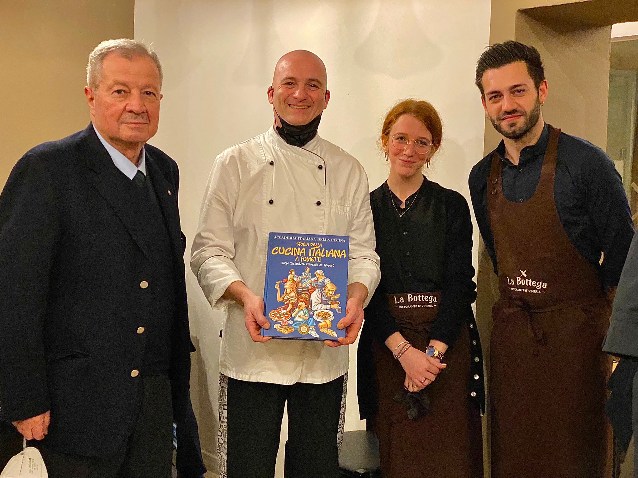 La ripresa dell'attività accademica per il nuovo anno è avvenuta nell’accogliente ristorante La Bottega situato nel centro storico di Dozza, uno dei borghi più belli d'Italia. In avvio di riunione, dopo una breve verifica sull'operato dello scorso anno e la presentazione del programma per i prossimi mesi, i presenti hanno accolto con un convinto plauso la neo Accademica Sabina Ferlini. La cucina, guidata da Pierpaolo Nanni, ha risposto alle aspettative degli Accademici che hanno apprezzato in particolare i tortelloni ripieni di carbonara e la guancetta di maialino. Servizio condotto in modo eccellente. Foto 1. La nuova associata Sabina Ferlini con il Delegato Antonio Gaddoni e gli Accademici presentatori. Foto 2. Accademici a tavola. Foto 3 Il Delegato con la brigata di cucina. Foto 4. I tortelloni ripieni di carbonara.