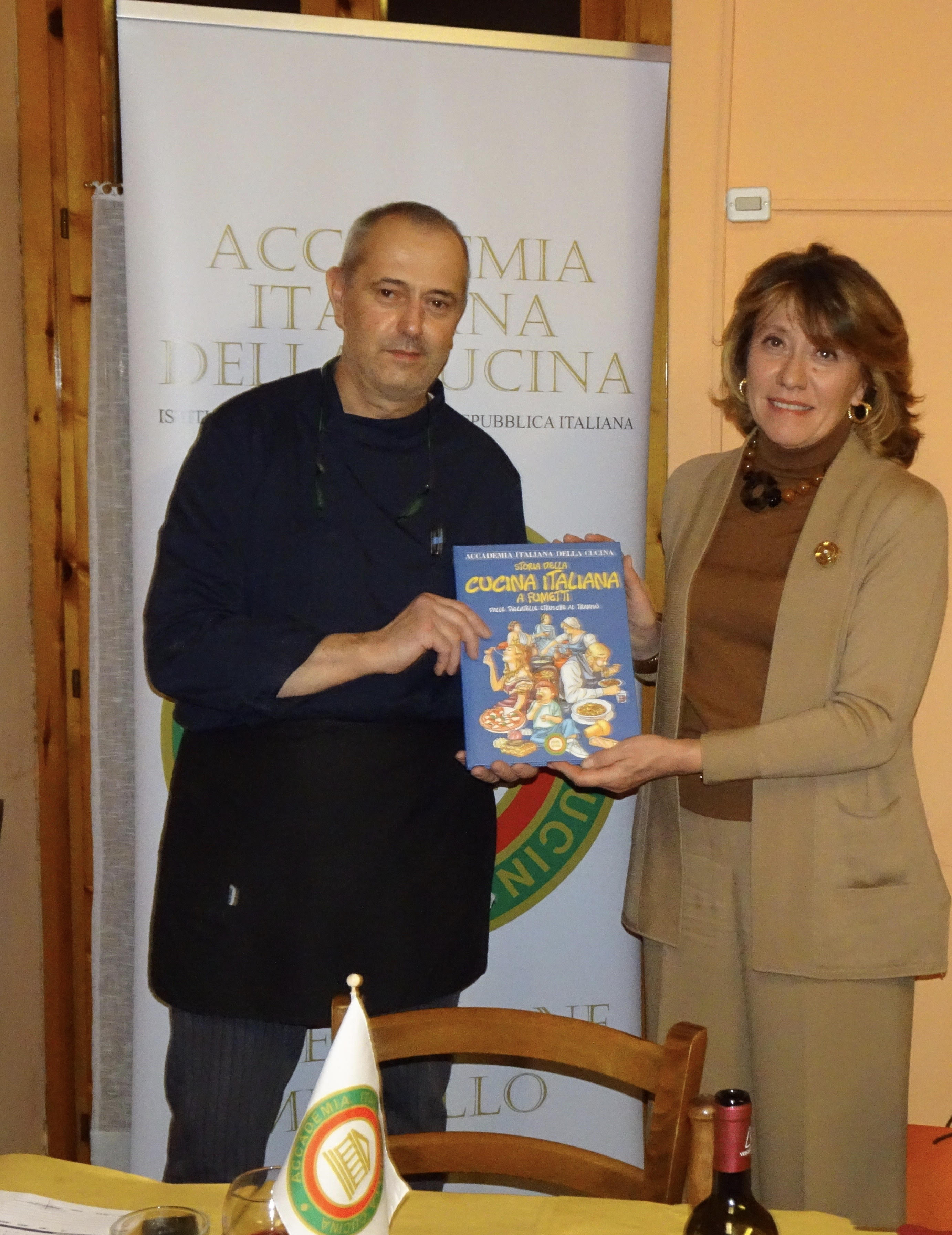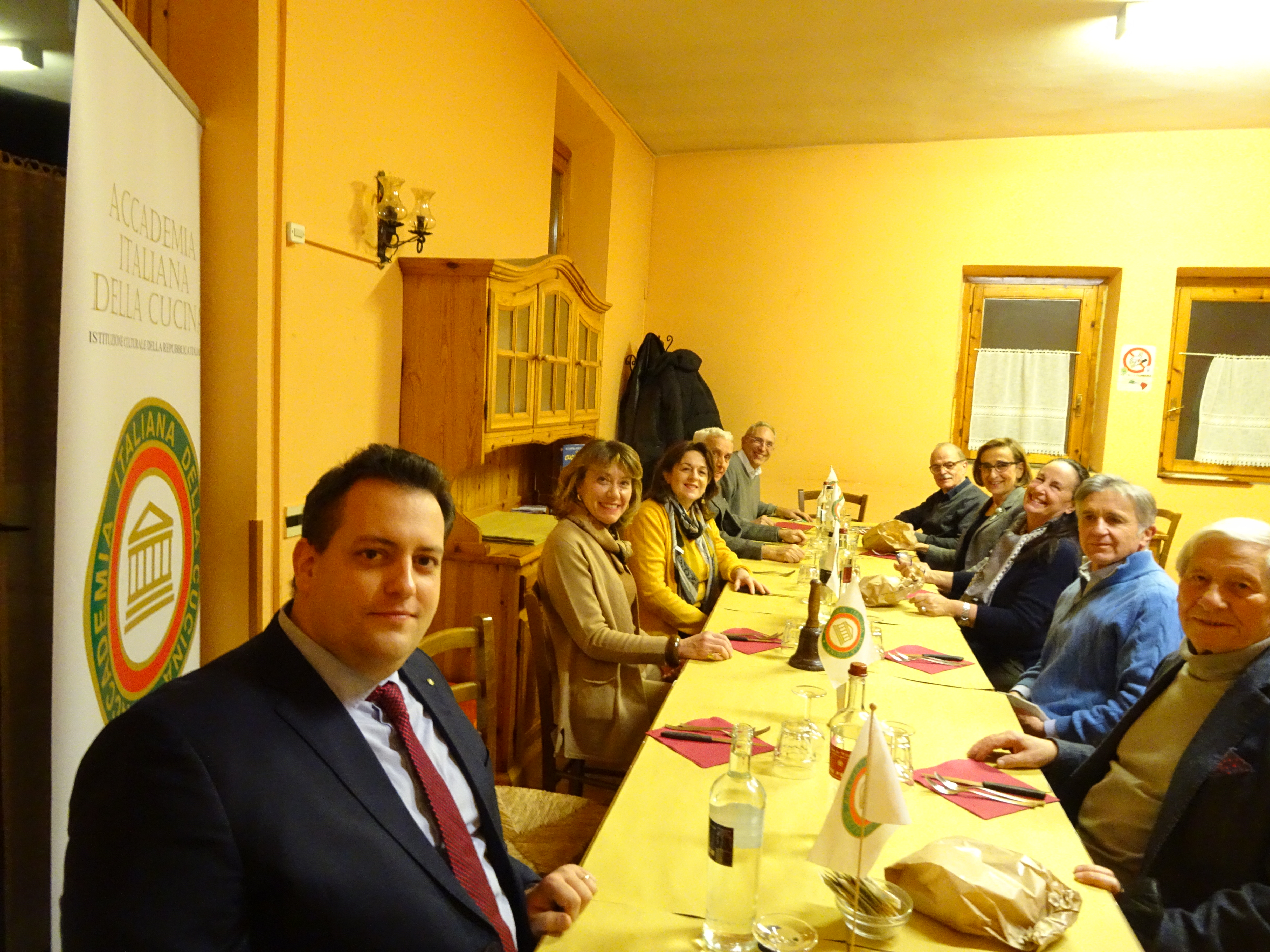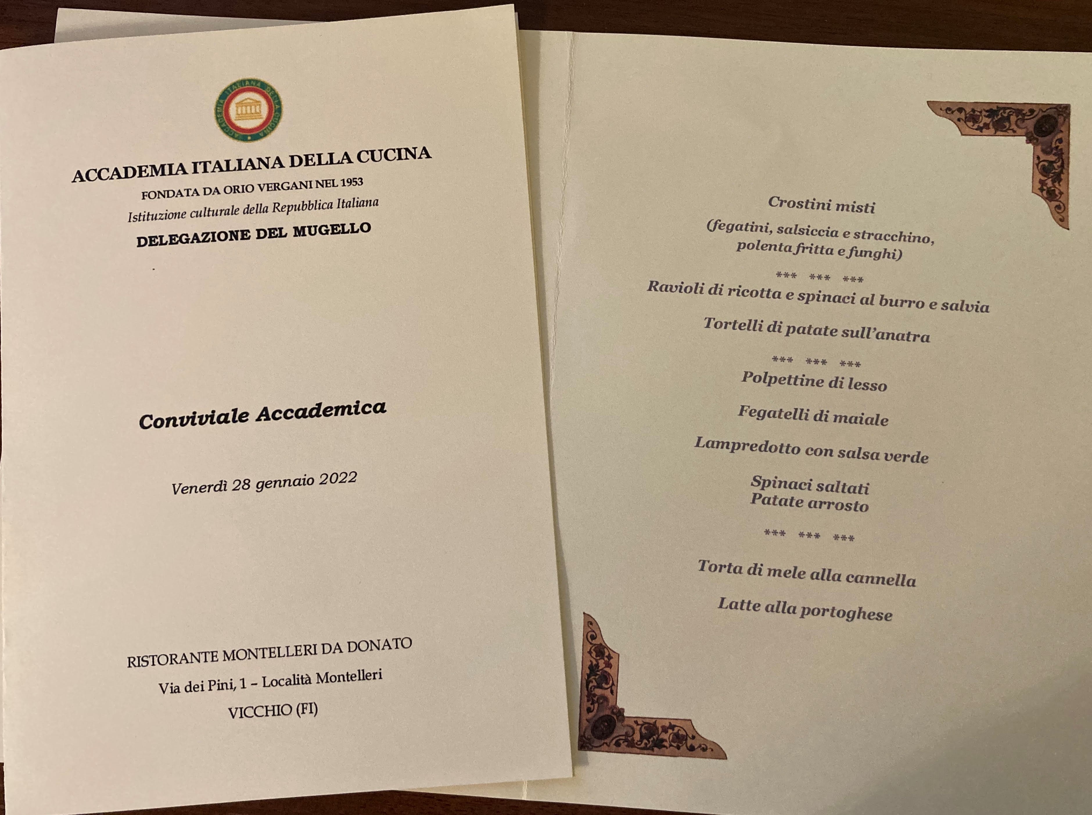 La Delegazione si è ritrovata per la prima riunione conviviale dell’anno presso il ristorante Da Donato sul lago di Montelleri a Vicchio (FI). Una serata piacevolissima, trascorsa in amicizia e arricchita dalla testimonianza resa dall’Accademico Giacomo Volpi, a seguito di una ricerca personale, su la vita e le tradizioni intorno alla tavola di una famiglia di contadini del secolo scorso in un podere dell’Alto Mugello (foto 1, un momento conviviale, a sinistra l'Accademico Volpi). Donato Petri ha preparato piatti semplici della tradizione locale, espressione di una cucina casalinga, realizzati con ingredienti di prima qualità accuratamente selezionati, che hanno ricevuto un altissimo gradimento da parte di tutti gli Accademici (foto 2, la Delegata Monica Sforzini consegna il volume "Storia della cucina italiana a fumetti" a Donato Petri; foto 3, il menu).