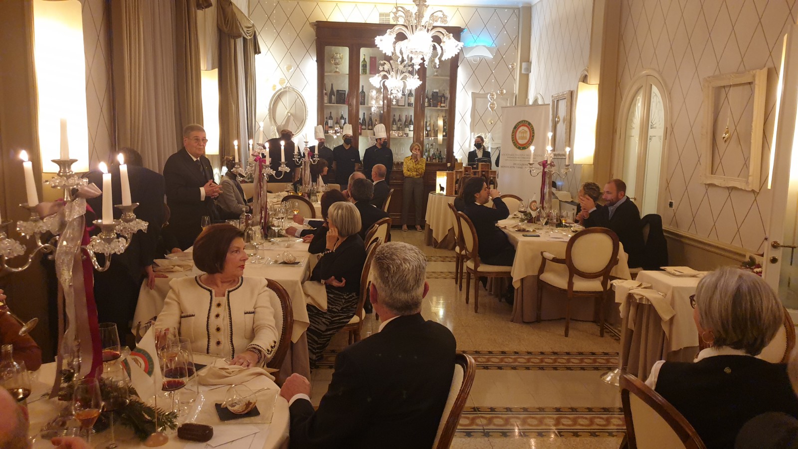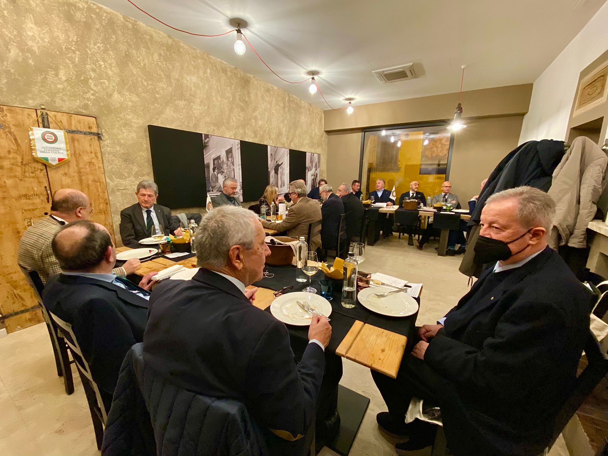 Ottimo risultato della cena degli auguri, grazie anche alla rinnovata, folta partecipazione degli Accademici all’appuntamento ormai tradizionale al ristorante Pecora Nera di Montecatini Terme, che non conosce routine, proponendo sempre piacevoli novità. Organizzatori della serata gli Accademici Gemma Puccini e Andrea Giovannini, che hanno curato l’elegante decorazione dei tavoli, oltre alla definizione del menu, interessante e centrato su ingredienti tradizionali, lavorati con accostamenti originali e stimolanti. Lodevole la scelta dei vini, molto buoni tutti i piatti, presentati con eleganza, serviti con sollecitudine e alla giusta temperatura. Particolarmente apprezzati sia i tortelli di carne con jus di vitello sia la guancia di vitello cotta a bassa temperatura con polenta al mascarpone e castagne al Porto; lodatissima la presentazione del tradizionale Mont Blanc. All’elogio per la cucina va affiancato quello per il servizio, che ha mostrato ottima professionalità, sicché entrambe le brigate hanno avuto complimenti e applausi, che hanno coinvolto anche la titolare Luciana Cenni. Con brevi parole il Delegato Alessandro Giovannini ha infine espresso il compiacimento per la bella serata, augurando ai numerosi Accademici ed ai loro cari delle serene festività.