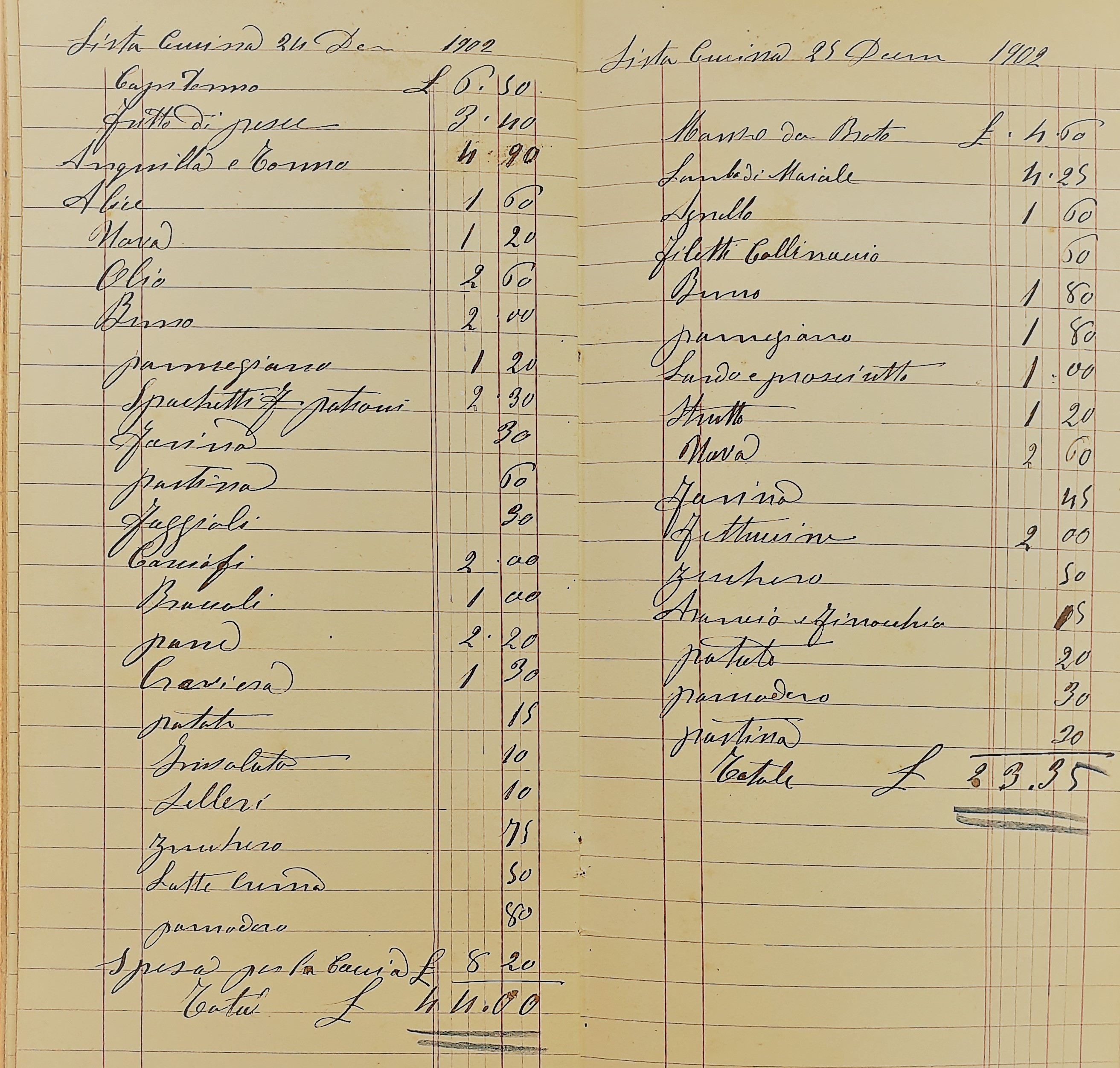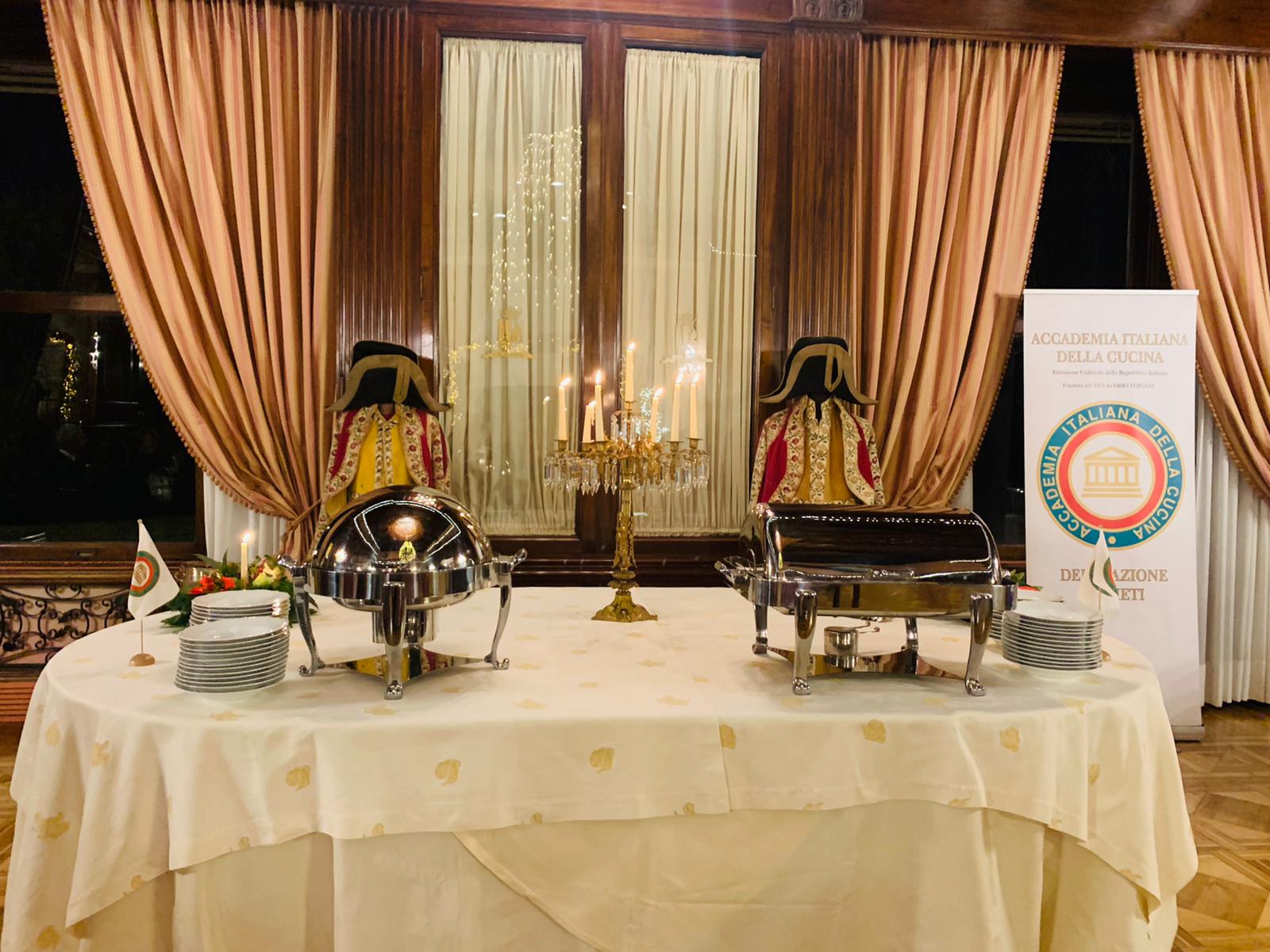 Nella splendida cornice di Villa Potenziani, a Rieti, si è tenuta la riunione conviviale per lo scambio degli auguri natalizi della Delegazione reatina. Il tema della serata - il pranzo del Natale del 1902 a casa del Principe Lodovico Potenziani – è stato frutto di una ricostruzione operata sulla base delle liste della spesa del 24 e 25 dicembre del 1902, rinvenute nel fondo Potenziani, presso l'Archivio di Stato di Rieti, dal Delegato Francesco Maria Palomba (foto 1), che ha eseguito la ricerca aiutato dall’Accademica Valeria Lettera. Il percorso è stato illustrato dallo stesso Delegato, che ha svolto anche la funzione di Simposiarca. La serata ha riscosso unanimi consensi, per l'opera di ricerca, per il luogo scelto, per il menu e per la realizzazione dei piatti. Giada Balzerani, proprietaria del Park Hotel Villa Potenziani, si è messa a disposizione per la migliore riuscita della serata. Un grande tavolo (foto 2) è stato allestito per il servizio alla francese, dovutamente rimodulato nel rispetto della normativa vigente, con i camerieri che hanno servito gli ospiti a tavola. Lo chef Andrea Angelucci ha eseguito alla perfezione tutti i piatti serviti a tavola ed il grande camino del salone acceso hanno reso magica l’atmosfera natalizia. Foto 3. Lista della spesa del 1902 sulla cui base è stato realizzato il menu.