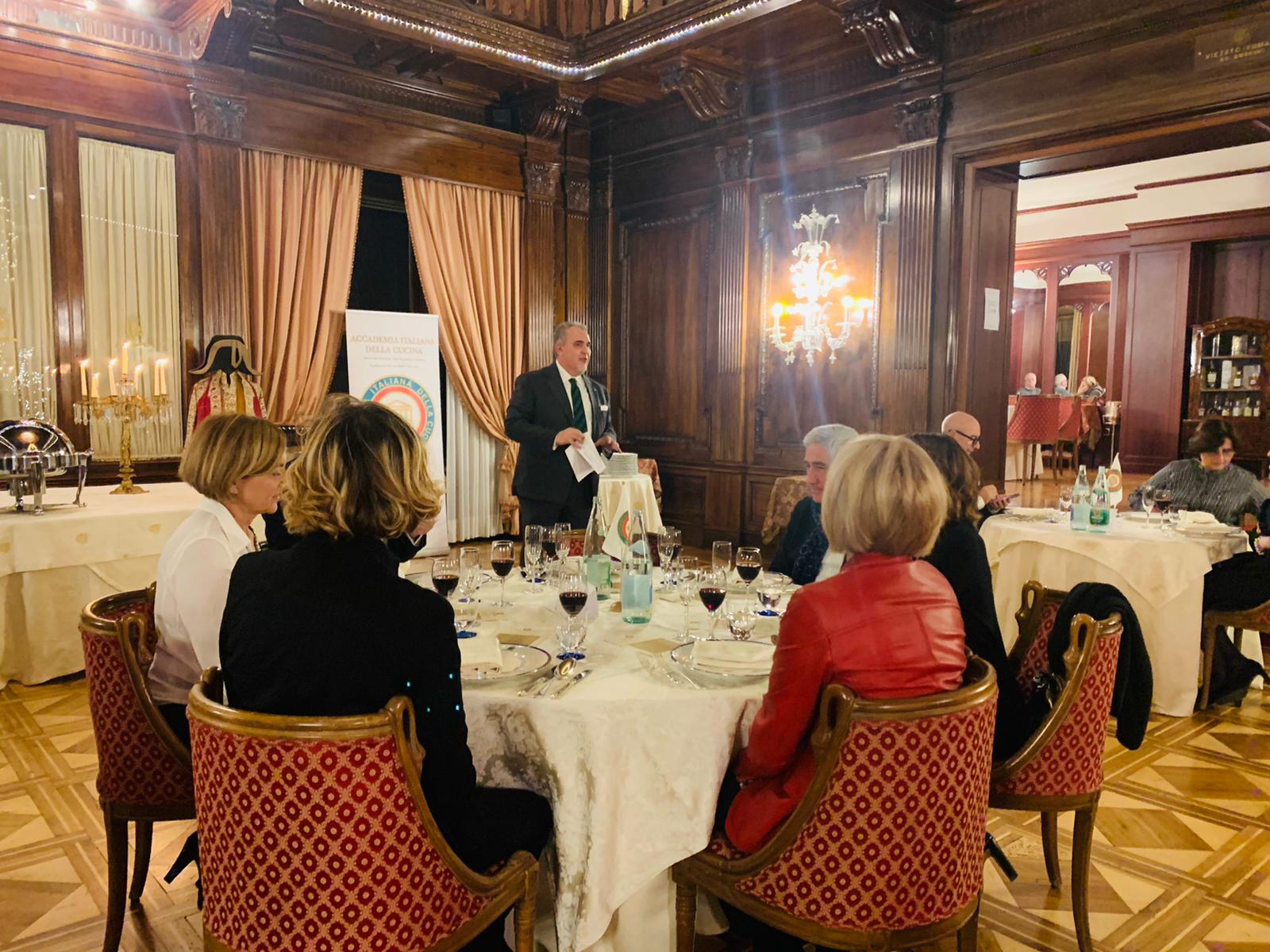 Pochi giorni prima delle feste natalizie, le due Delegazioni di New York e New York Soho si sono ritrovate per una elegante cena presso il noto ristorante “Il Gattopardo." I due Delegati, Roberta Marini de Plano e Berardo Paradiso (entrambi in foto 1 in piedi), hanno dato un caloroso benvenuto agli Accademici e loro ospiti, alla Vice Console Irene Asquini, al nuovo rappresentante della Banca D’Italia a New York Carmine Porello e a Gabriella Lorenzotti, moglie di Guido Lorenzotti che ha guidato per venti anni la Delegazione di New York poco dopo la fondazione nel 1959. Una riunione conviviale molto partecipata, con sessanta ospiti riuniti nella sala privata, un bellissimo e storico atrio noto come il luogo dove è stato ideato il MoMA. Dopo il brindisi augurale, è stato servito un menu con piatti tipici natalizi: insalata di baccalà con olive Castelvetrano e giardiniera, cavatelli ai frutti di mare, brasato di vitello al barolo e, per concludere, panettone.