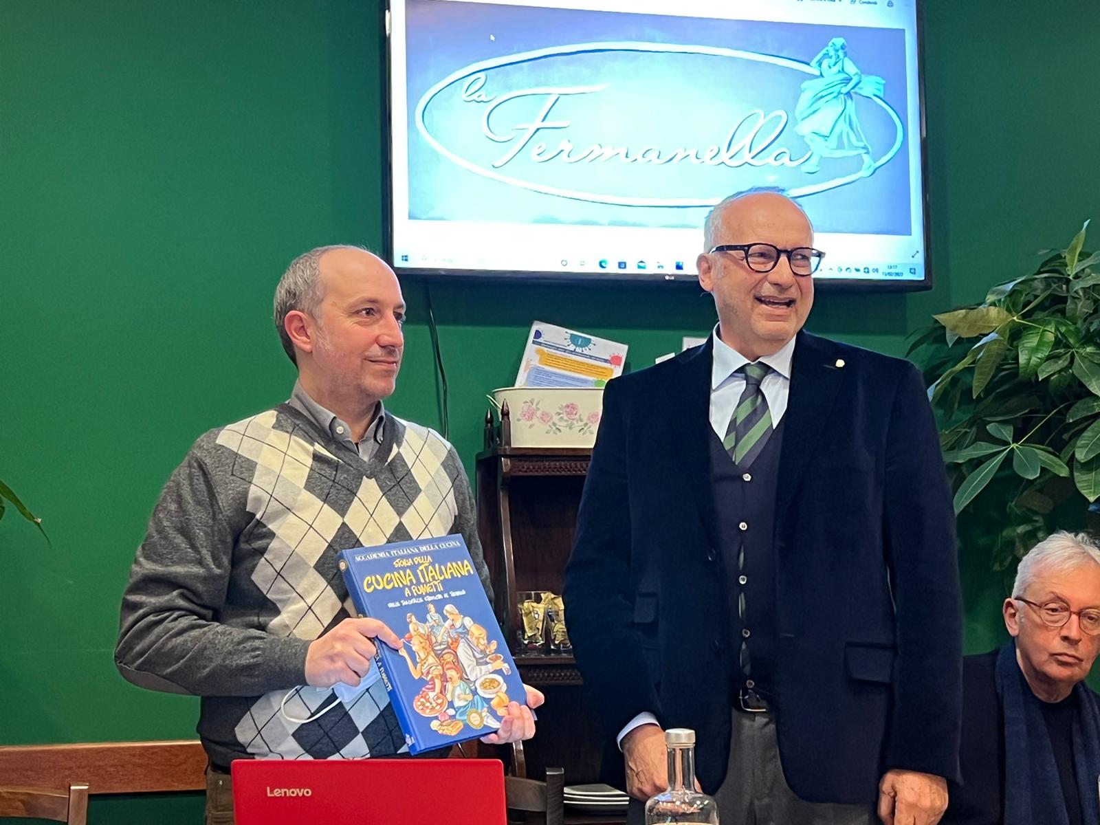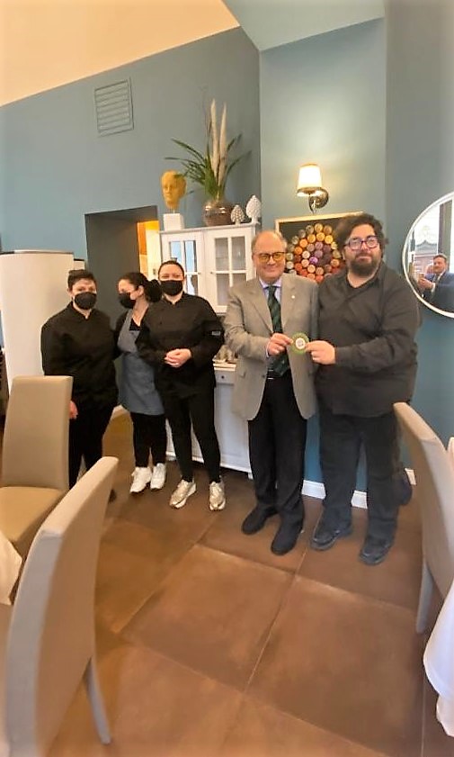 Per la seconda riunione conviviale dell’anno, la Delegazione ha raggiunto la frazione di Ponticelli per incontrare la cucina di Stefano Falzoni, un cuoco con molte esperienze in vari ristoranti, che da alcuni anni ha riavviato la trattoria "Miseria e Nobiltà". Il Simposiarca Alessandro Costa ha illustrato i piatti riflettendo appieno l'offerta della cucina tra terra e mare. I maggiori consensi sono stati espressi sulle polpette in umido, sulla tartare di coda di bue e sul baccalà mantecato, con plauso alla zuppa inglese. Molto interesse hanno suscitato le parole del Segretario della Delegazione, Danilo Grilli, pronipote del letterato e studioso Alfredo Grilli, nativo di Ponticelli. Foto 1. Il Delegato con il Simposiarca consegna il guidoncino dell'Accademia al cuoco Stefano Falzoni e alla responsabile di sala Mirella. Foto 2. Una panoramica di una delle due sale. Foto 3. Il Segretario Danilo Grilli illustra le opere del prozio Alfredo Grilli. Foto 4. Polpette in umido con sugo di piselli.