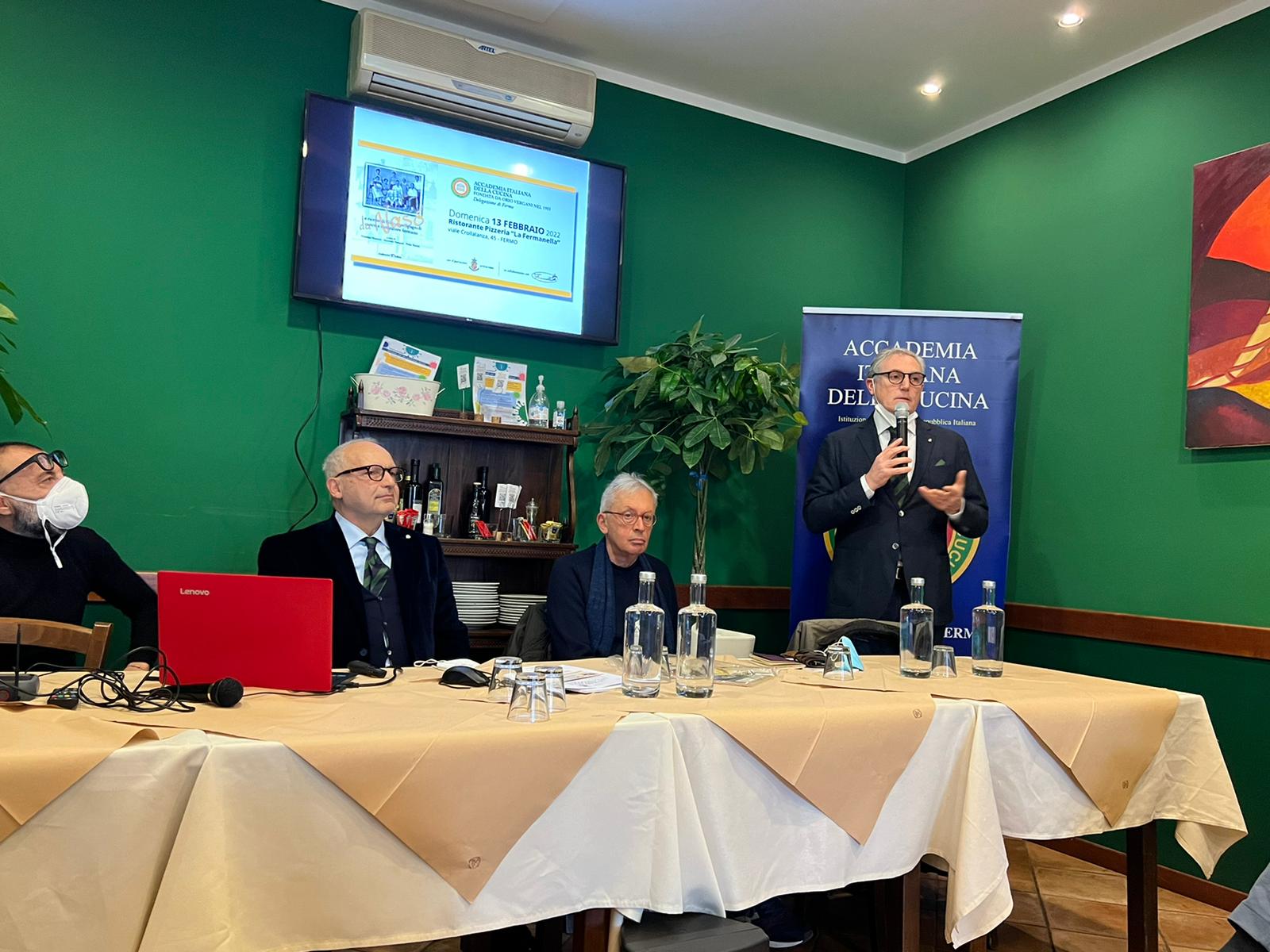 Accademici e ospiti si sono ritrovati a Fermo presso il ristorante-pizzeria Fermanella, già ristorante da Nasò negli anni ’80-‘90, per celebrare colui che maggiormente ha segnato la ristorazione fermana dell’epoca innestando su una base della più pedissequa tradizione qualche piatto di “innovazione”. La Fermanella, tra questi, ma il suo piatto più celebrato e diffuso è lo stoccafisso alla Nasò che ha dato ispirazione alla locale “Accademia dello stoccafisso alla Fermana”, presente all’incontro con il suo presidente dott. Saturnino Di Ruscio. In apposito convegno patrocinato dal Comune di Fermo, è stato presentato il volume “Da Nasò - le ricette di Giuseppe Spagnoli, cuoco e ristoratore fermano” curato da G. Mariucci, G. Rongoni e F. Torresi. Tra le testimonianze di alcuni collaboratori e ospiti, tra cui il sindaco avv. Paolo Calcinaro, pronipote del cuoco, la mattinata è stata impreziosita dall’intervento del prof. Antonio Attorre che ha presentato Nasò nel più ampio quadro dell’evoluzione della cucina nazionale in quegli anni rapportandolo soprattutto alle ispirazioni di Gualtiero Marchesi sino alla figura di Aurelio Damiani, assegnatario del premio “Nuvoletti” 2020 dell’Accademia. Il menu del convivio è stato incentrato sul celeberrimo stoccafisso alla Nasò declinato nelle due ricette eseguite dal personale della Fermanella sotto la supervisione dei depositari delle stesse: Giuseppe Mariucci e Checco Montanini. La conviviale è stata presentata dal dott.Paolo Foglini, dietologo e fondatore del Laboratorio Piceno per la Dieta Mediterranea, che ha dissertato sul mangiare di magro e lo stoccafisso nella Dieta Mediterranea. L’evento ha visto la partecipazione della Delegazione di Ancona Riviera del Conero rappresentata dal Delegato e CT Marche Sandro Marani che ha coadiuvato il suo Accademico Michele Maccione nella preparazione di una favolosa salsa allo stocco, perfetto condimento per una pizza preparata come antipasto da Andrea Francavilla, entusiasta titolare della Fermanella.