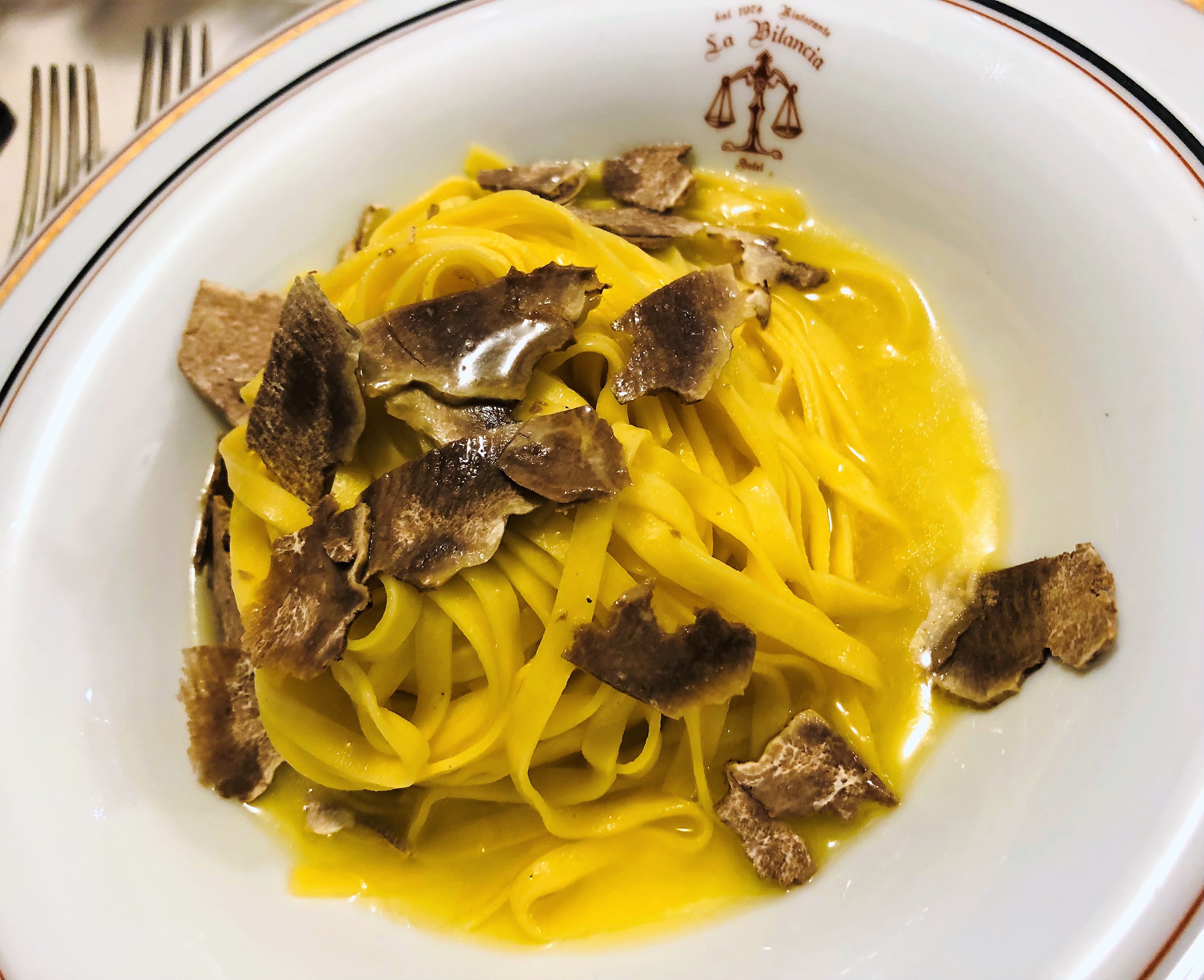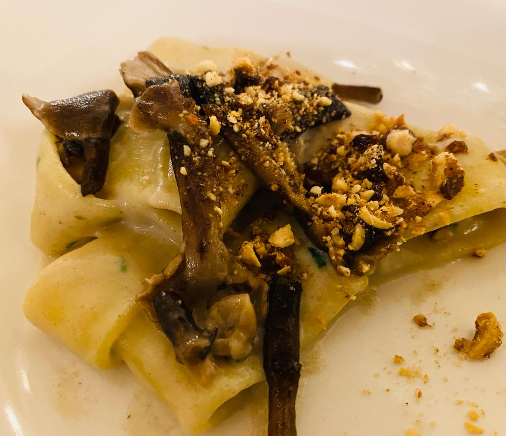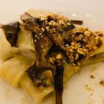 La Delegazione di Pescara anche quest’anno ha scelto il Ristorante “La Bilancia” di Loreto Aprutino, premio “Giovanni Nuvoletti”(2019), per celebrare l’Ecumenica sul tema “il bosco e il sottobosco”. Ospite della serata ed eccellente relatore è stato Augusto Verando Tocci, agronomo, botanico, studioso di gastronomia, conduttore e ospite televisivo. Il Simposiarca Giuseppe Di Croce, esperto conoscitore del bosco e dei suoi prodotti, ha scelto piatti della tradizione locale, esaltati da materie prime di ottima qualità. Il menu è stato impreziosito anche da alcuni omaggi portati da Augusto Tocci direttamente dalla sua terra toscana: radici di barbe di becco, boccioli di tarassaco, infuso di pimpinella e “spinello”, un liquore officinale a base di olivello spinoso. Il tema della serata è stato interpretato in modo eccellente dalla brigata di cucina, guidata dalla famiglia Di Zio, da sempre vicina alla Delegazione di Pescara. Foto 1. Augusto Tocci e il Simposiarca Giuseppe Di Croce. Foto 2. Di Croce e il Delegato Giuseppe Fioritoni con i titolari. Foto 2 e 3. Menu e tagliatelle al tartufo bianco.
