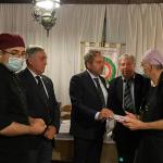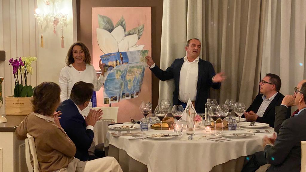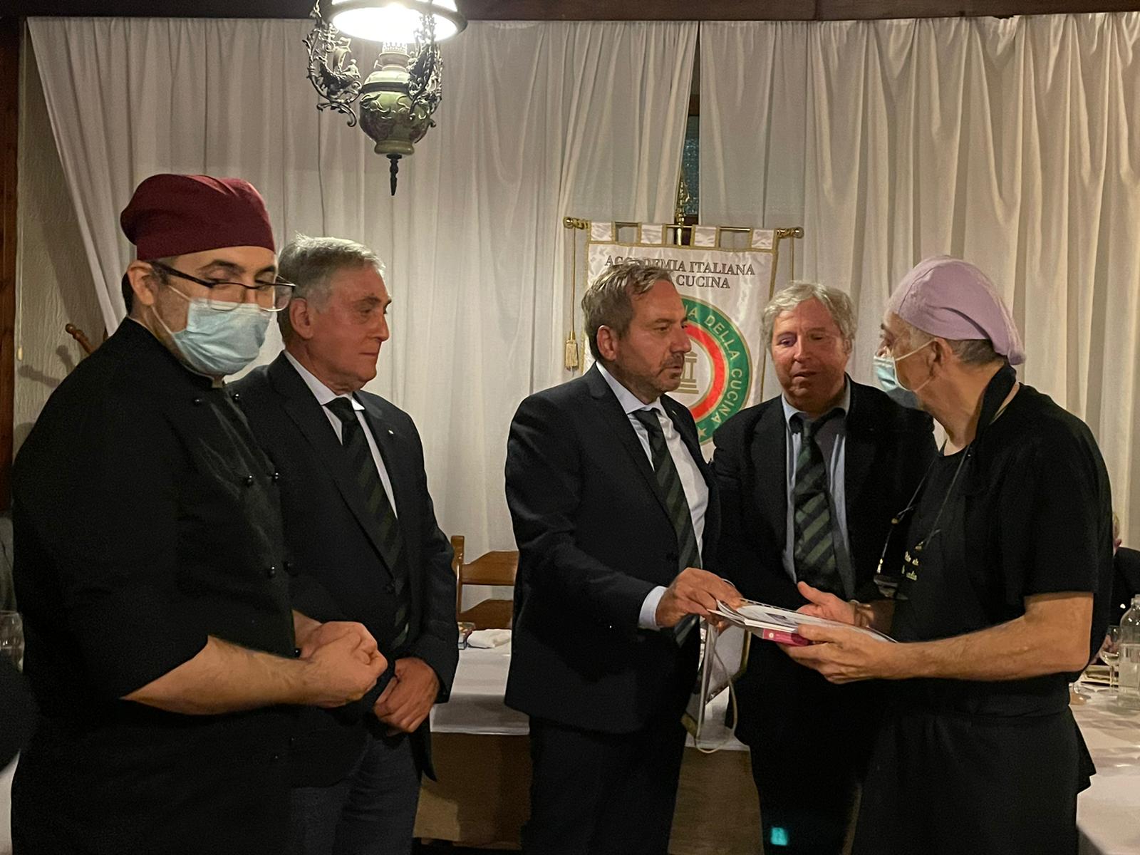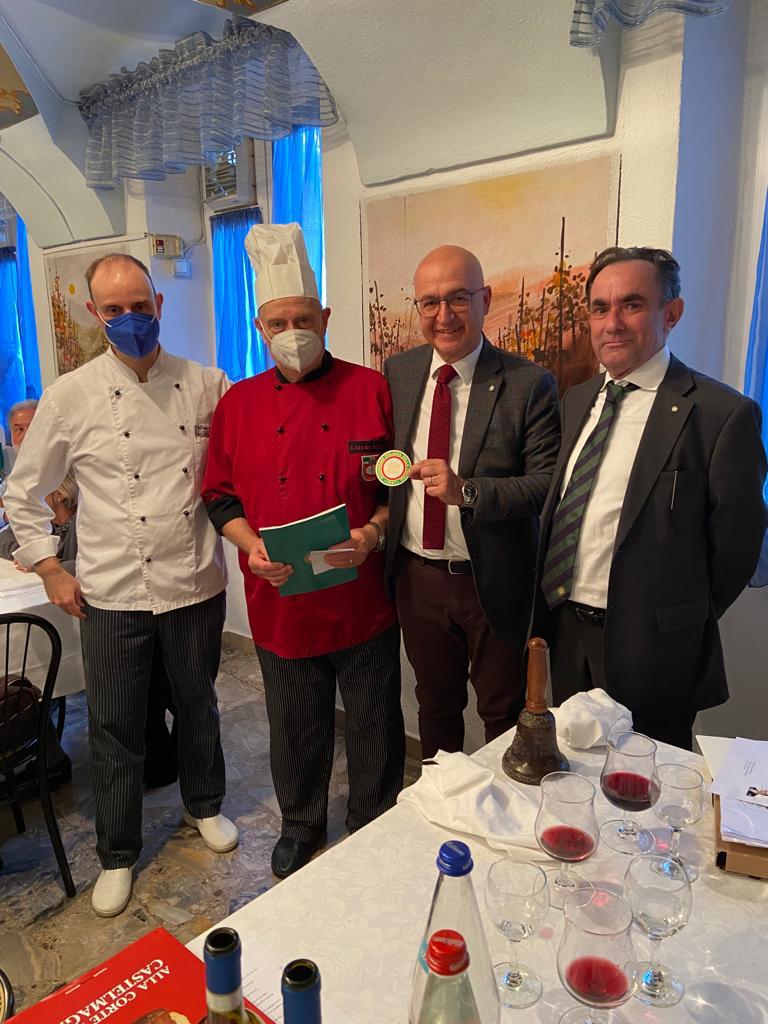 La Delegazione di Macerata ha tenuto la Cena Ecumenica 2021 nel cuore della zona terremotata della provincia e cioè a Camerino, nello storico ristorante “Villa Fornari” (foto 1). Sono stati graditi ospiti della Delegazione l’arcivescovo di Camerino, Mons. Francesco Massara, e il prof. Gianni Sagratini, docente dell’Università camerte, direttore del corso di laurea in Scienze Gastronomiche e della Scuola di Scienze del Farmaco e dei Prodotti della Salute, il quale ha portato il saluto del rettore prof. Claudio Pettinari, impossibilitato ad intervenire. Entrambi gli ospiti sono stati omaggiati con alcuni volumi dell’Accademia Italiana della Cucina, molto apprezzati (foto 2). Il Delegato Ugo Bellesi ha poi consegnato all’Accademica Simonetta Varnelli l’attestato e il distintivo inviato dalla Presidenza in riconoscimento della sua pluriennale iscrizione e dedizione all’Accademia (foto 3). A tutti gli Accademici è stato poi consegnato il volume “Il bosco e il sottobosco” dedicato al tema dell’anno 2021.