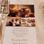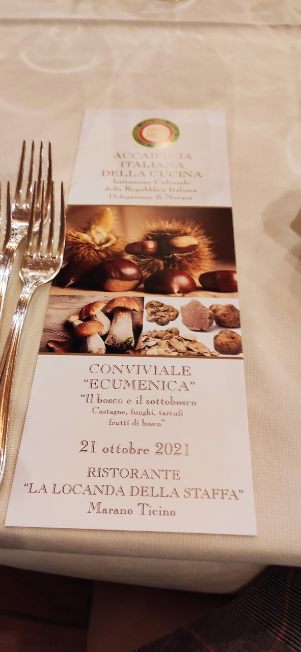 La riunione conviviale ecumenica della Delegazione di Novara si è tenuta alla “Locanda della Staffa”, ristorante già conosciuto ed apprezzato sia per la buona cucina sia per la bella location e l’eccellente servizio. Tutti i piatti concordati e serviti rispecchiavano il tema dell’anno 2021 sulla cucina del bosco e sottobosco. Il Delegato ha tenuto una relazione sui prodotti oggetto del tema ecumenico riportando alla memoria di tutti soprattutto le castagne che abbondano nei boschi del territorio e che sono state un sostegno in tempi difficili. Notevole la presenza di Accademici e consorti. Vini tutti del territorio a sostenere le cantine del Novarese. Foto 1. Il Delegato con i titolari e lo staff di cucina. Foto 2. Menu. Foto 3. Il dolce, Montebianco. Foto 4. Il castagnaccio.