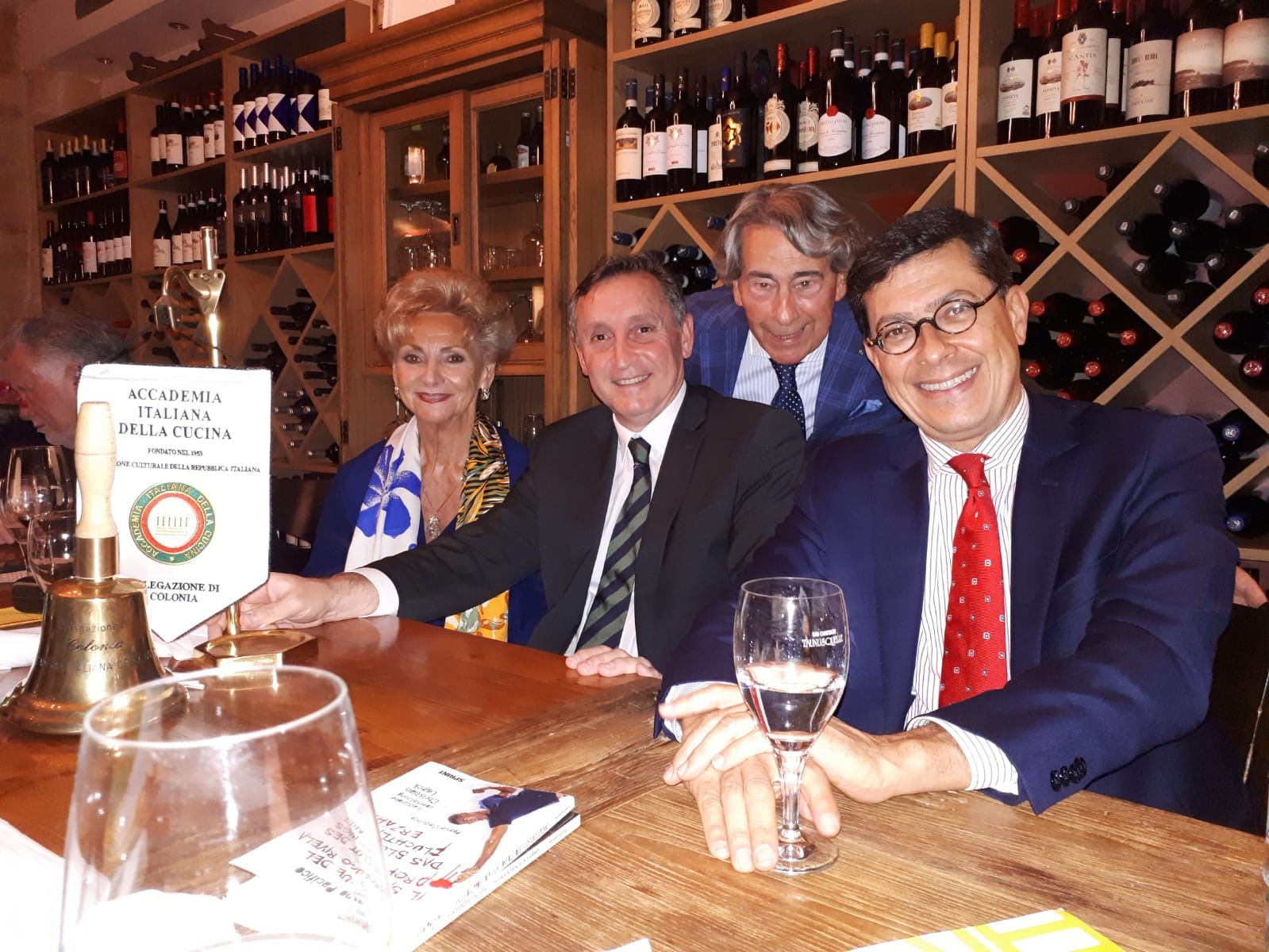 Dopo più di un anno la Delegazione si è riunita, questa volta, al ristorante "Da Damiano" per una serata speciale contrassegnata anche dal passaggio della campana da Maryann Palm al nuovo Delegato Vincenzo Pennetta (foto 1). Simposiarca dell’importante evento accademico, la past Delegata Palm ha confermato una encomiabile capacità organizzativa e uno spirito di servizio che dimostrano il suo leale affetto verso l'Accademia. Il nuovo Delegato Pennetta, nel suo discorso programmatico, ha evidenziato l'importanza di continuare a essere degli ambasciatori della cucina italiana all'estero; l'Italia possiede un patrimonio di beni enogastronomici unico al mondo caratterizzato da una differenziazione di gusto derivante da un insieme di fattori storici e geografici e questo sarà uno dei temi che il Delegato cercherà di sviluppare con il supporto degli Accademici. L'occasione è stata allietata, inoltre, dalla presenza del Console Generale di Colonia, il Dott. Luis Cavalieri, non nuovo nel mondo dell'Accademia (in foto 2, primo da destra). Lo chef Damiano Pizzichetti (in foto 3 con il Delegato) ha reso onore al tema della serata "Il Bosco e il Sottobosco" cercando di avvicinare e amalgamare i molteplici ingredienti in un ricco menu (foto 4).