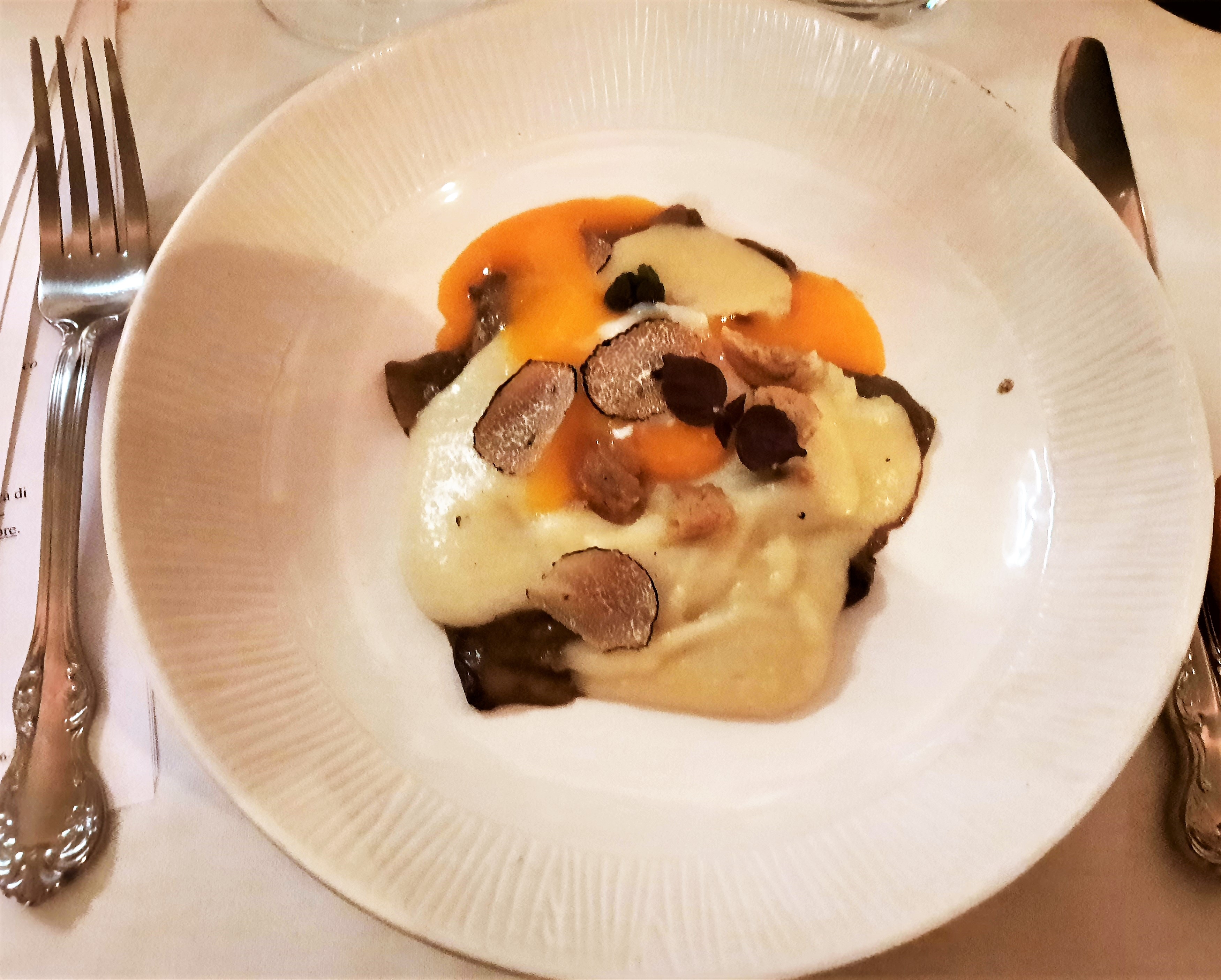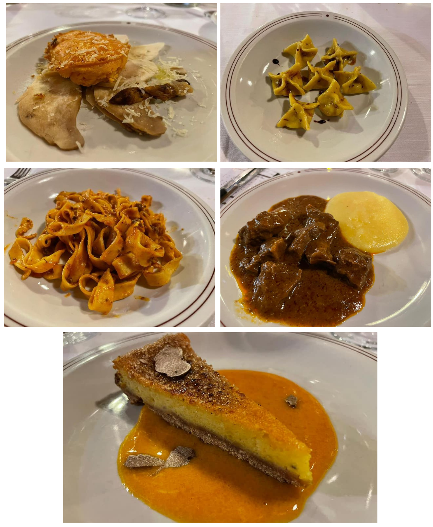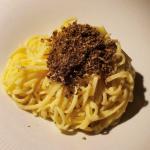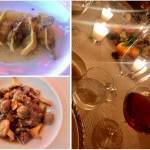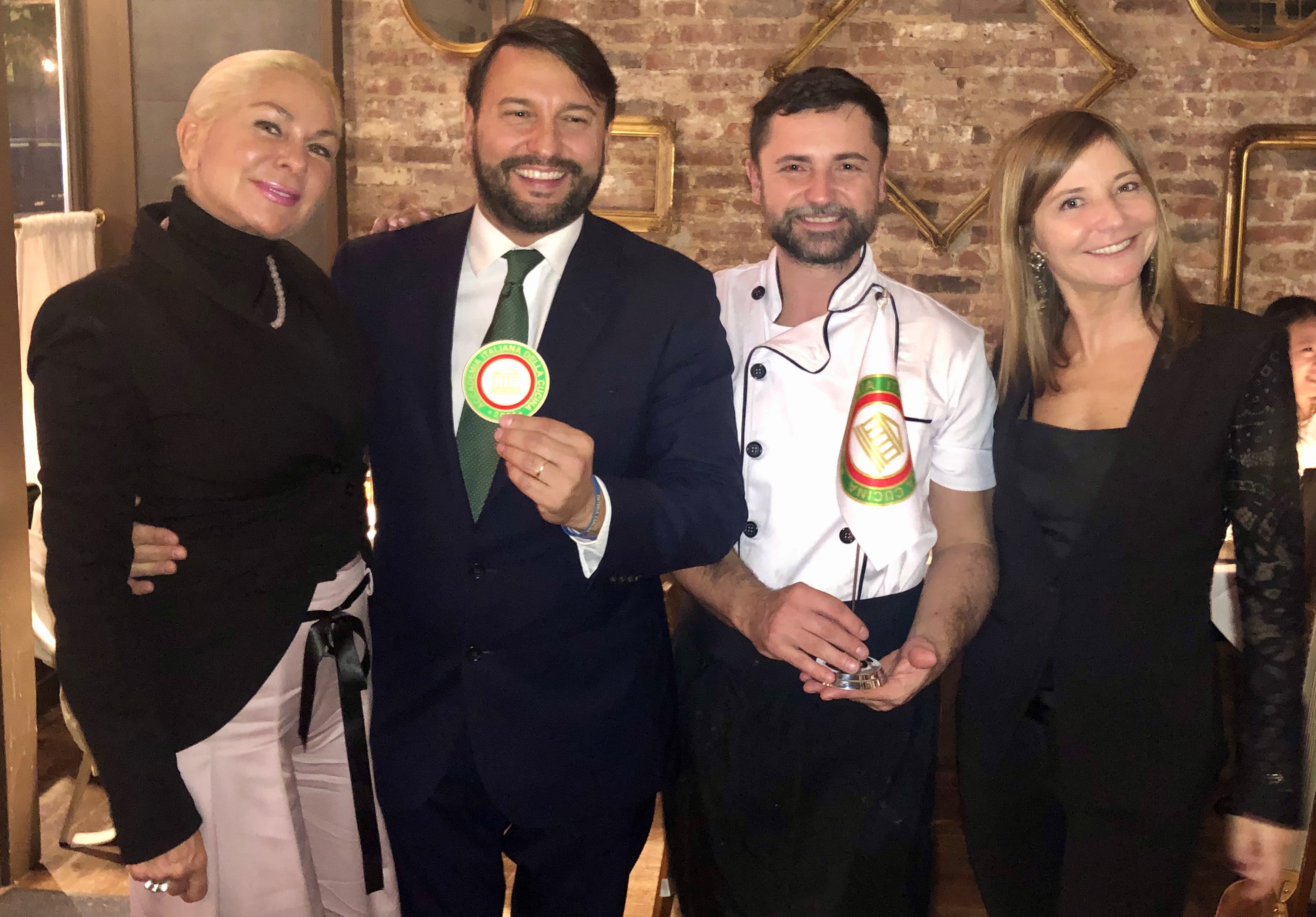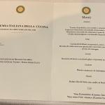 Serata Ecumenica svolta presso “L’Osteria Carlina” di Moreno Cerutti con chef in cucina Claudio Pienti. Un ristorante piemontese nel West Village di New York. Simposiarca della riunione conviviale è stata Elena Pirondini che ha svolto egregiamente le sue funzioni. Durante la serata è stato consegnato agli Accademici il volume dedicato al tema dell’anno “Il bosco e il sottobosco. Castagne, funghi, tartufi, frutti di bosco nella cucina della tradizione regionale” (foto 1). Foto 2. Roberta Marini de Plano (Delegata), Moreno Cerutti (proprietario), Claudio Pienti (chef), Elena Pirondini (Simposiarca). Foto 3. Ricciola in carpaccio con salsa di castagne, foto 4. Tajarin della tradizione ai 40 rossi d’uovo con tartufo nero.