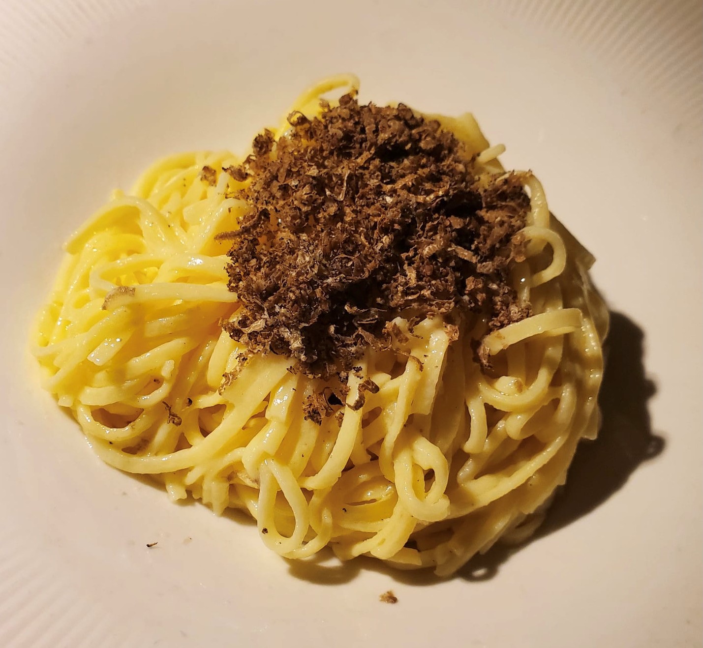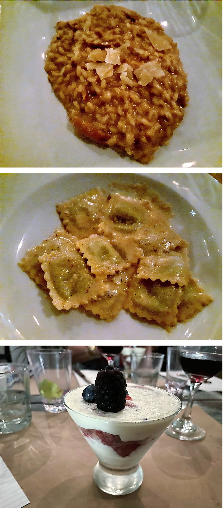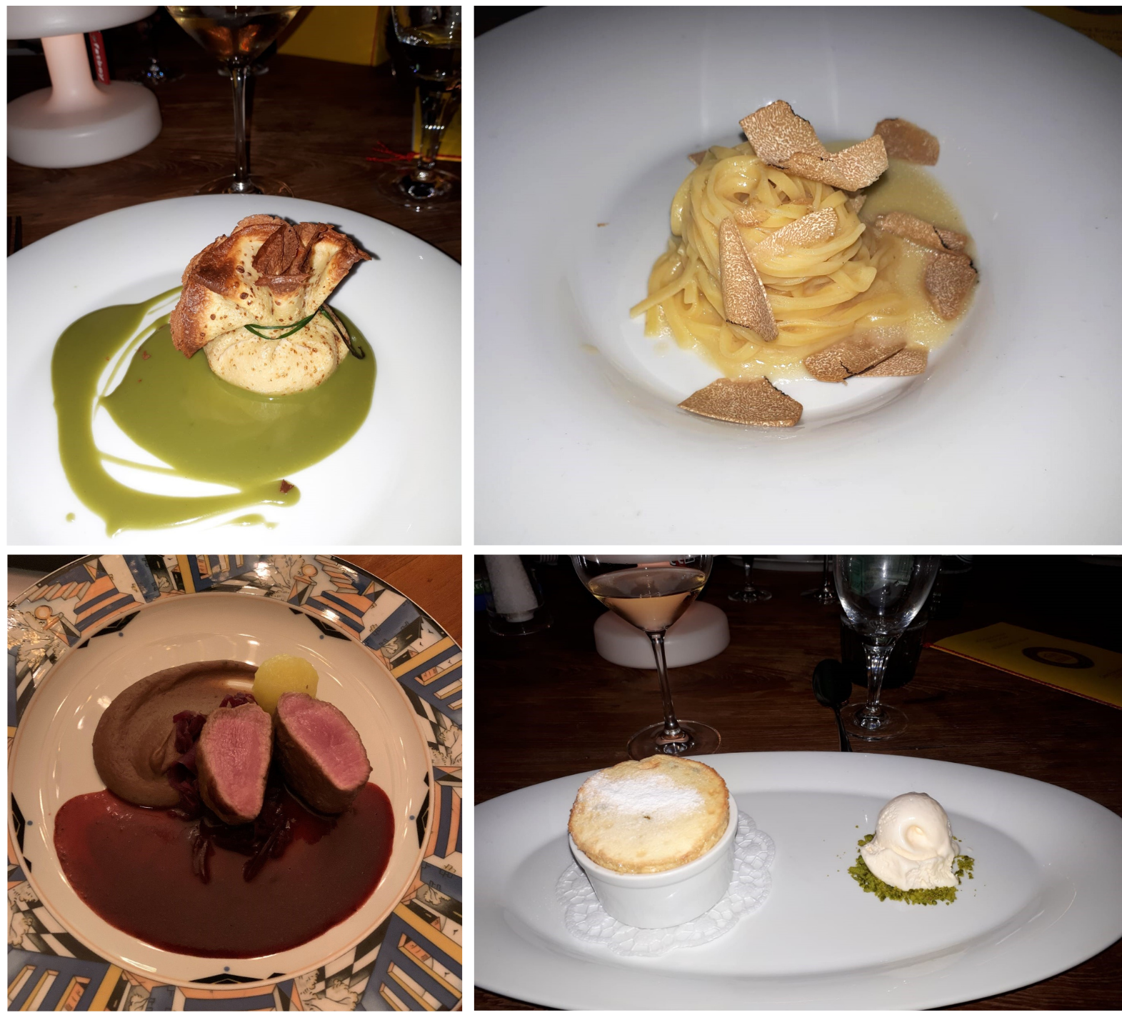 Serata Ecumenica svolta presso “L’Osteria Carlina” di Moreno Cerutti con chef in cucina Claudio Pienti. Un ristorante piemontese nel West Village di New York. Simposiarca della riunione conviviale è stata Elena Pirondini che ha svolto egregiamente le sue funzioni. Durante la serata è stato consegnato agli Accademici il volume dedicato al tema dell’anno “Il bosco e il sottobosco. Castagne, funghi, tartufi, frutti di bosco nella cucina della tradizione regionale” (foto 1). Foto 2. Roberta Marini de Plano (Delegata), Moreno Cerutti (proprietario), Claudio Pienti (chef), Elena Pirondini (Simposiarca). Foto 3. Ricciola in carpaccio con salsa di castagne, foto 4. Tajarin della tradizione ai 40 rossi d’uovo con tartufo nero.