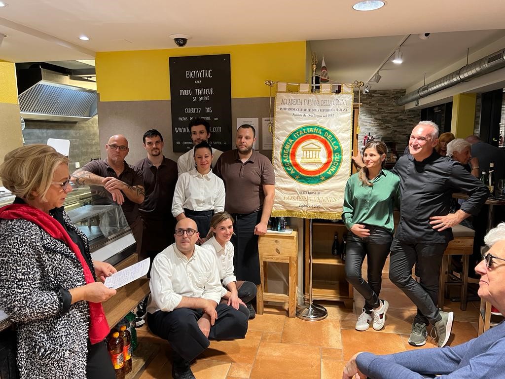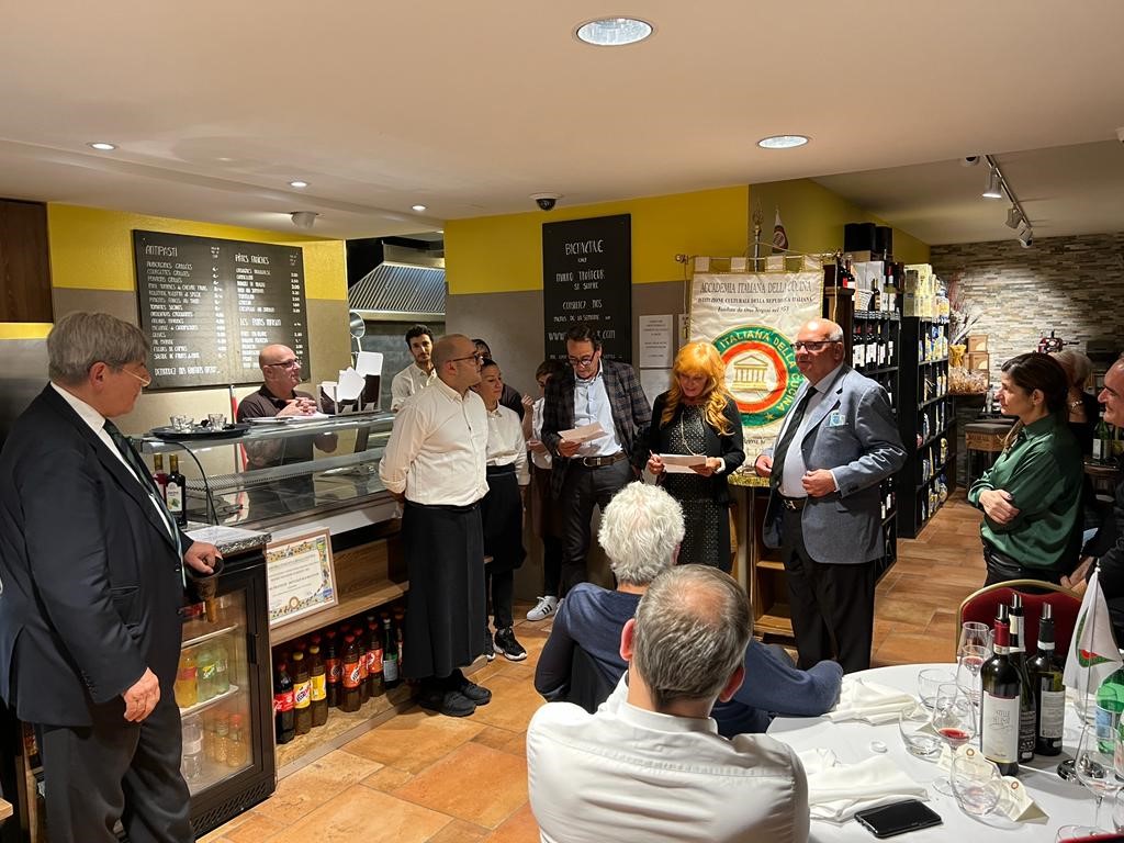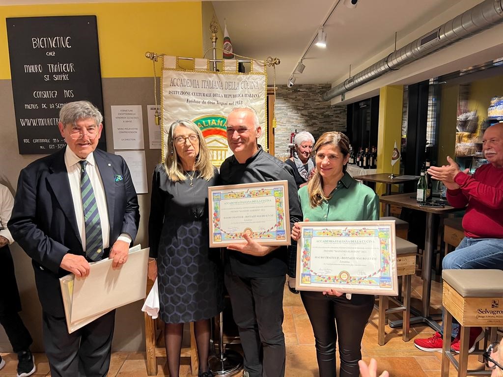 Le Delegazioni della Suisse Romande e di Losanna-Vennes, Simposiarchi rispettivamente Mara Marino e Alessandro Caponi, hanno celebrato insieme la Conviviale Ecumenica 2021, cogliendo l'occasione per consegnare a “Mauro traiteur&Cie” il premio Massimo Alberini 2021, proposto congiuntamente dalle due Delegazioni per la qualità della pasta fresca, del pane e delle specialità italiane che producono da lustri per ristoranti, alberghi e per vendita al minuto nei loro due commerci di Losanna e Saint-Sulpice. È nel negozio di Saint-Sulpice VD che è stata servita la Cena Ecumenica preparata dalla sua brigata di cucina, preceduta dalla lettura da parte della Delegata della Suisse Romande Zena Marchettini-Jeanbart della comunicazione che il Presidente Paolo Petroni ha inviato ai Delegati e Legati Esteri, da una relazione del Delegato Alessandro Caponi sulla cucina dei prodotti del bosco e del sottobosco nelle tradizioni regionali italiane e da un interessantissimo e documentato intervento del Consultore Fausto Giori sulla vita e le passioni di Massimo Alberini. In video collegamento da Parma, la figlia di Massimo Alberini, Carla, che ha seguito la consegna del premio a Carma e Mauro Bottazzi per le mani del Console aggiunto al Consolato generale di Ginevra, dott.ssa Roberta Massari, la quale ha avuto parole di encomio per la famiglia Bottazzi per l’onore che fanno all’Italia e alla sua cultura della tavola con la loro attività artigianale, commerciale e di catering di alta qualità.