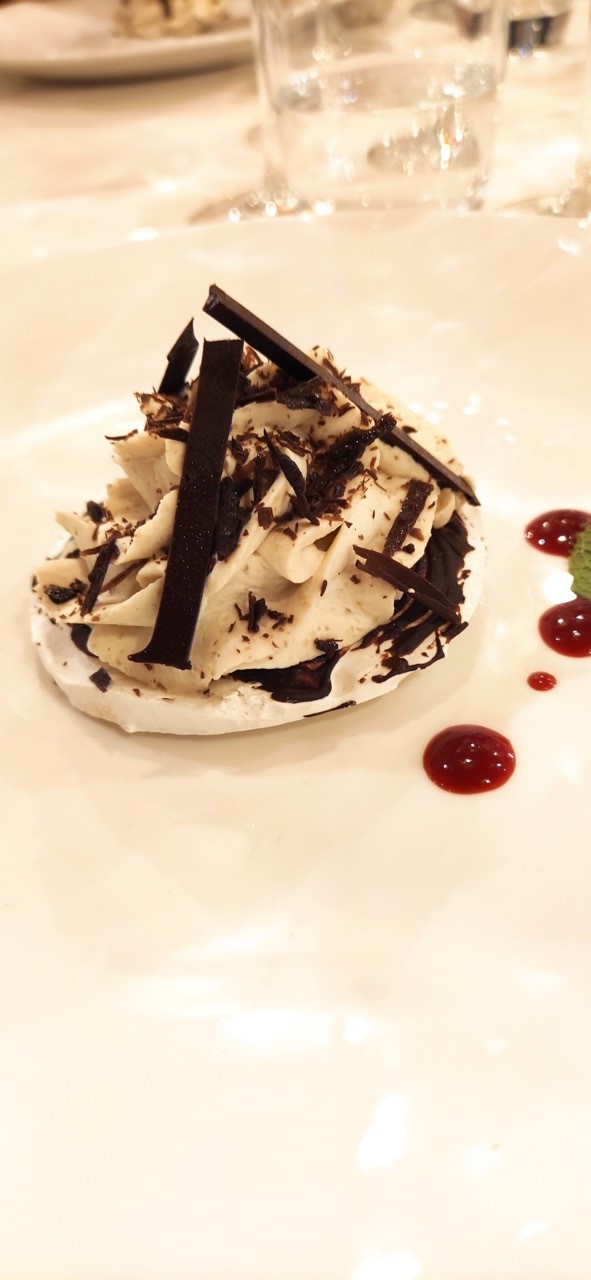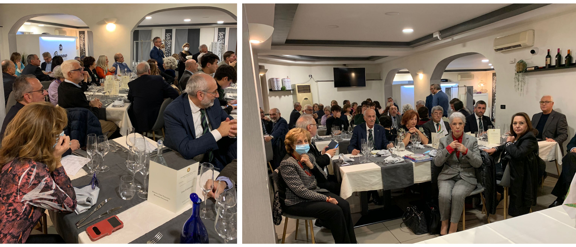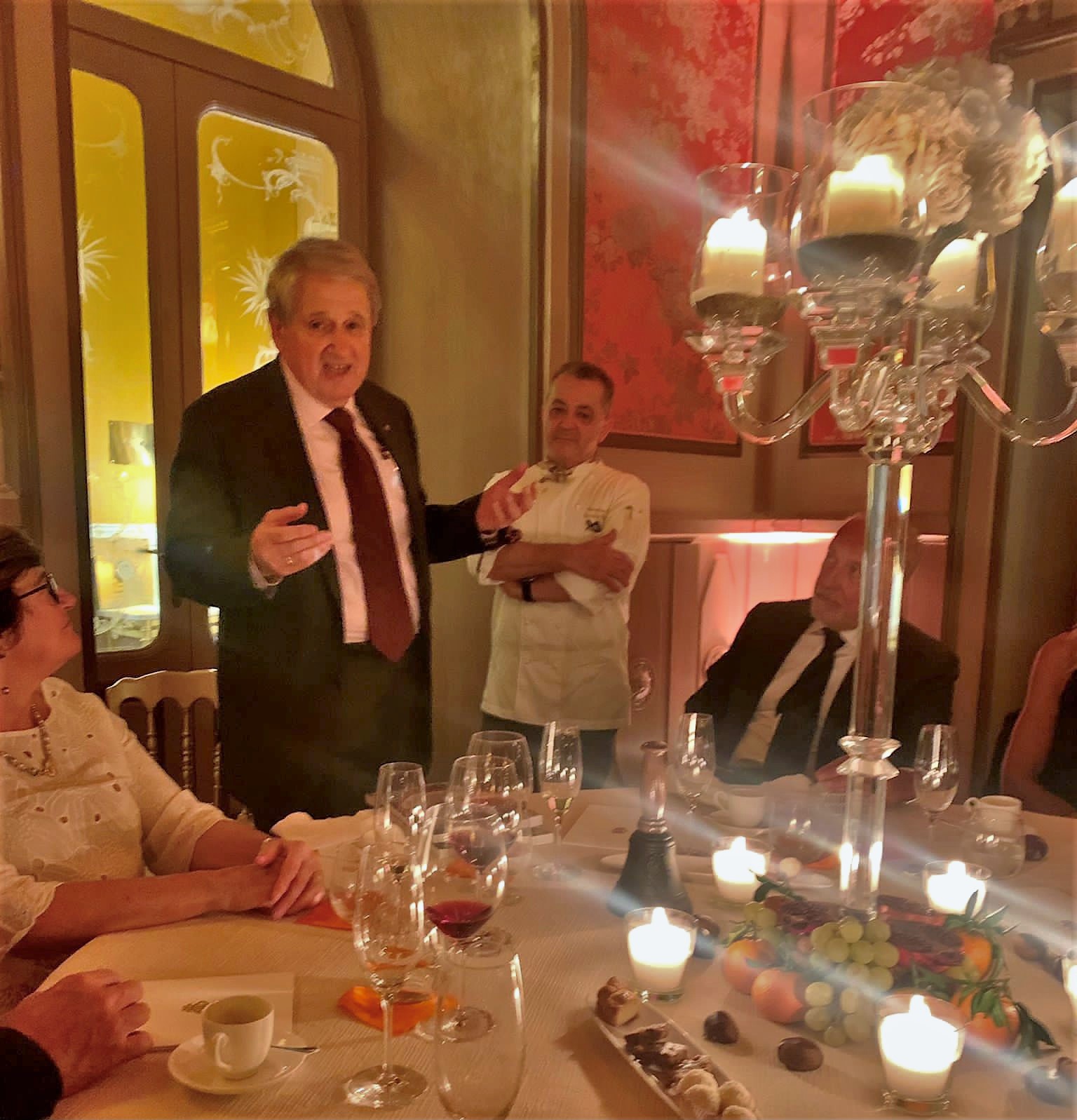 La Delegazione Lariana si è ritrovata per la Cena Ecumenica 2021 presso la Terrazza Gualtiero Marchesi del GH Tremezzo. Eccellenti i piatti serviti, cucinati con maestria dallo chef Osvaldo Presazzi, assistito da una compagnia carica di competenza ed entusiasmo. Il tema è stato rispettato per l'intero percorso della cena, caratterizzata da un perfetto servizio di sala, in un ambiente fiabesco, illuminato da un profluvio di candele e arricchito da frutti di bosco e mandaranci sapientemente "abbandonati" sulle mense. Presentazione e servizio impeccabili. Foto 1 e 2. Il Delegato Enzo Pomentale con lo chef Osvaldo Presazzi. Foto 3. Panoramica dell'elegante sala. Foto 4. Dal menu: tortelli di faraona mitrata stufata con burro e tartufo nero; guancia di vitello con finferli e castagne.