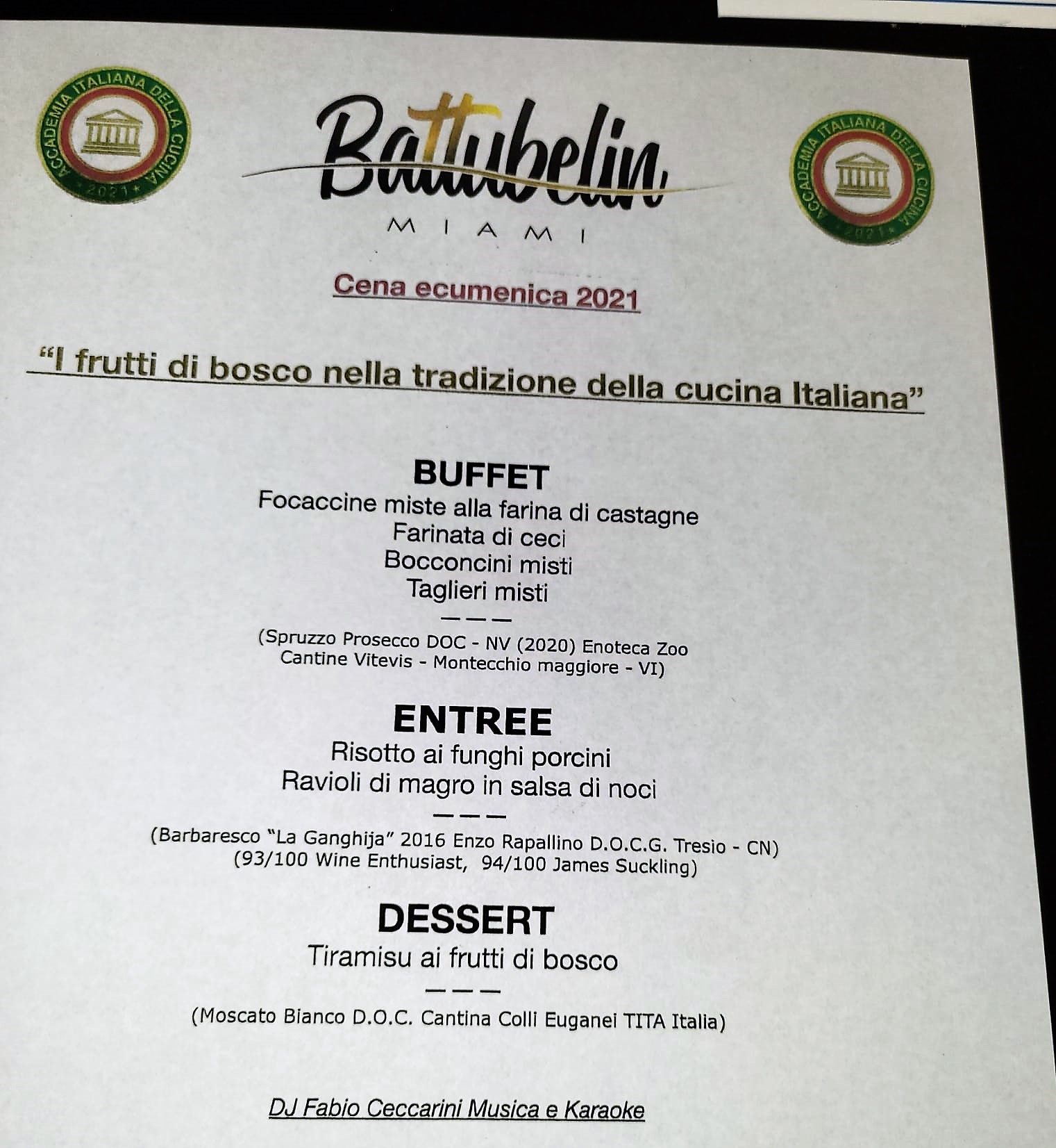 Profumi di autunno italiano, sapori di caldarroste funghi e mirtilli: questa è l'atmosfera a cui si sono ispirati i proprietari del locale Battubelin, Giulio Polidori e Giorgio Mariani, lo chef Paolo Gallotti e lo chef panettiere David Santos per la preparazione della Cena Ecumenica 2021. Il ristorante, sito nel Miami Modern District, è famoso per la cucina genovese e per le ottime pizze. I proprietari hanno accettato la proposta del Delegato Antonio Pianta e hanno allestito una cena ricca di prelibatezze, non facile da organizzare, considerando che gli ingredienti non sono normalmente reperibili in un paese a clima tropicale. Gli Accademici sono stati ospitati all'aperto, al riparo di un patio circondato da una ricca vegetazione, per trascorrere una serata unica e allegra grazie anche all’intrattenimento musicale.