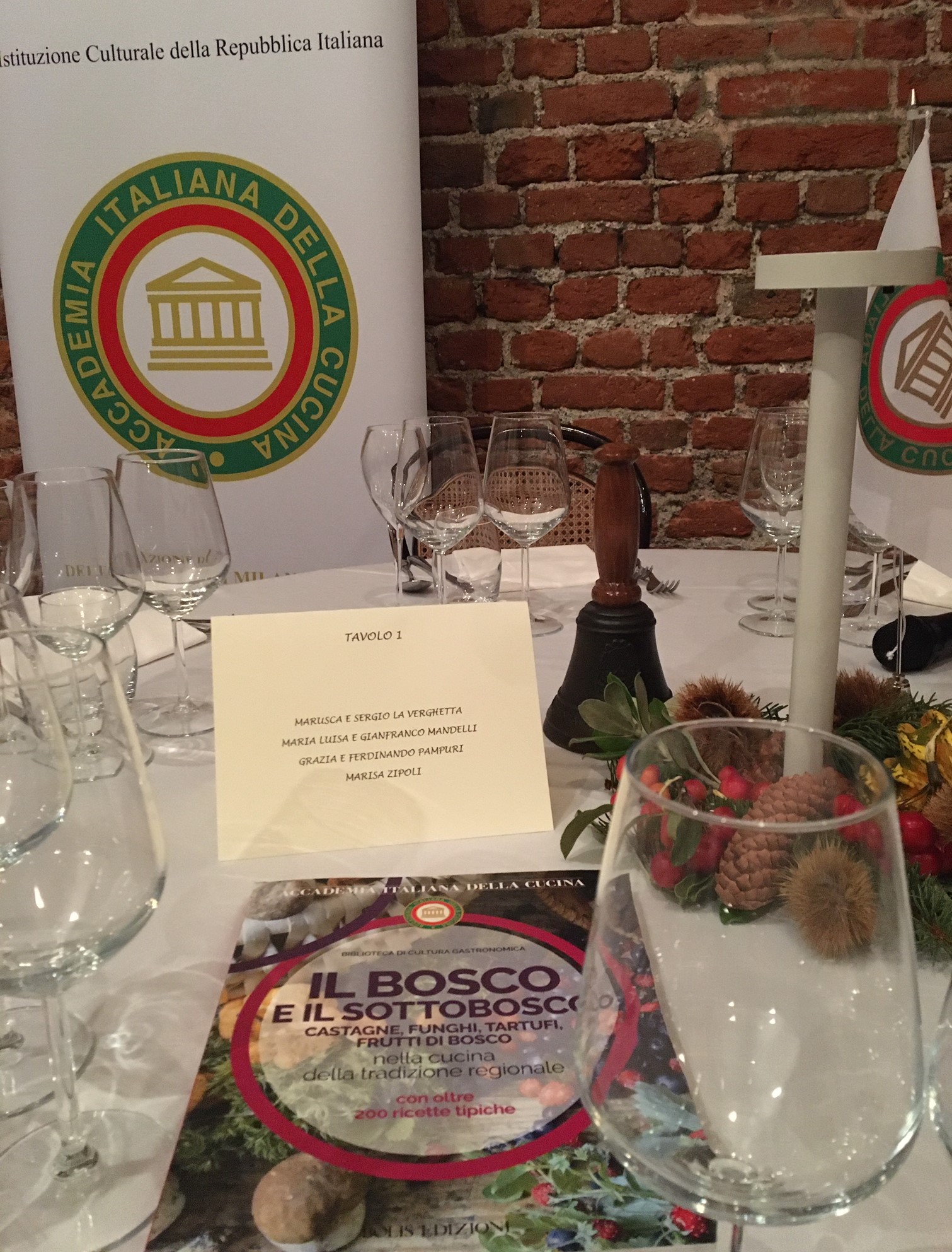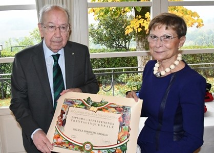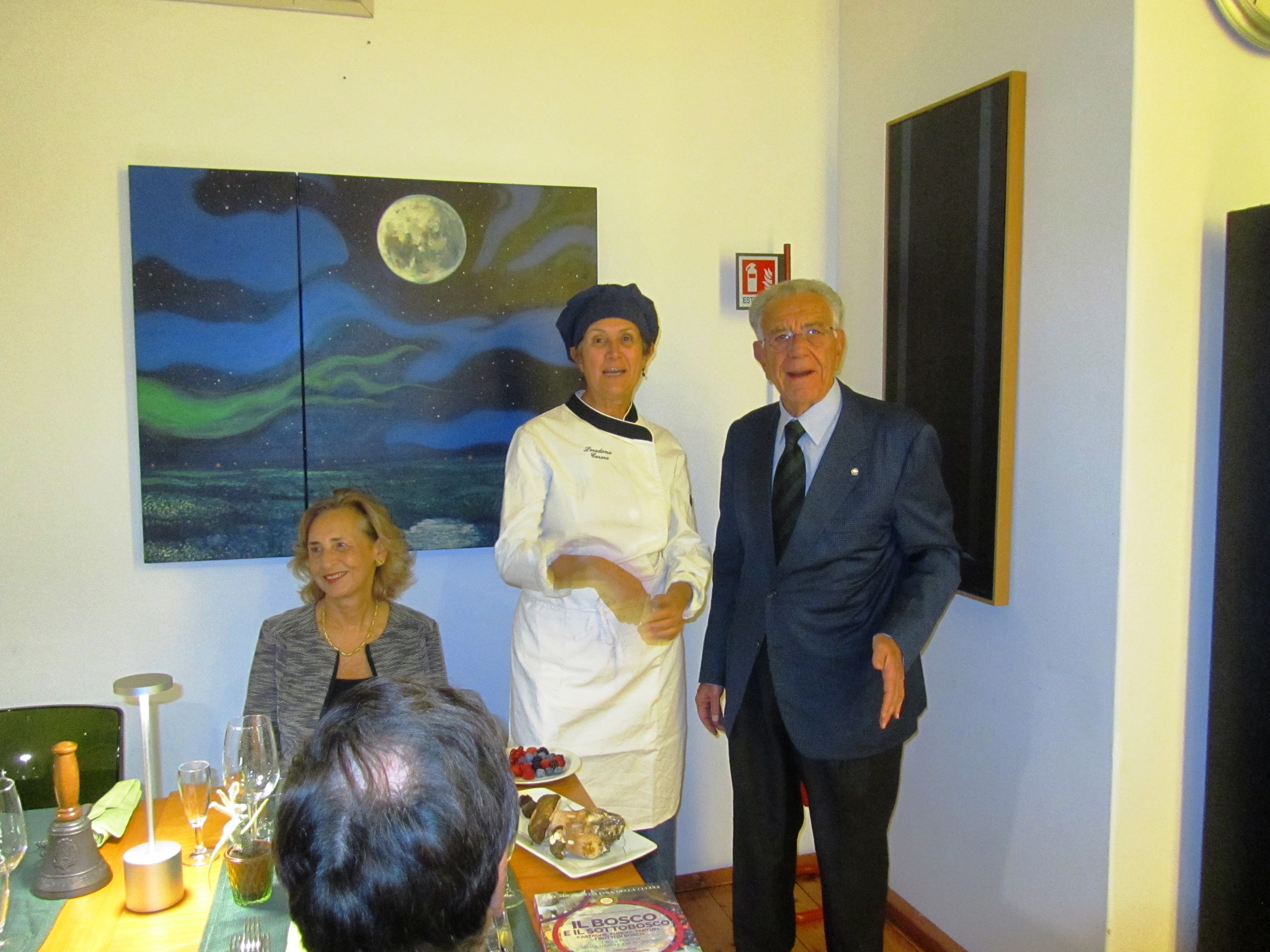 La Cena Ecumenica della Delegazione di Milano Duomo si è svolta presso il ristorante “Antica Osteria La Rampina”. Il calore dell’ambiente e la consueta cordialità e amicizia con cui sono stati accolti gli Accademici da Lino Gagliardi e dai figli Luca e Lorenzo ha creato immediatamente la giusta atmosfera per la riunione conviviale (Foto 1). È stato servito un ricco menu a base di funghi, tartufi e altri prodotti del bosco (Foto 2). Simposiarche della serata Anna Mattioli e Marisa Zipoli che hanno preparato il pane con farina di castagne che ha accompagnato la cena e che ha riscosso grande apprezzamento da parte dei commensali tutti. Durante il convivio, l’Accademica Laura Spini ha proposto una interessante relazione sul tema: “Il tartufo, storia e carattere del diamante della terra”. La Delegata Maria Luisa Mandelli ha presentato il recentissimo volume della Biblioteca di Cultura Gastronomica "Il bosco e il sottobosco. Castagne, funghi, tartufi, frutti di bosco nella cucina della tradizione regionale" e al termine della serata, molto riuscita e partecipata, ne ha consegnato una copia alla Famiglia Gagliardi unitamente al piatto celebrativo del tema dell’anno (Foto 3). In questa speciale occasione sono state consegnate anche le insegne associative al nuovo Accademico Sergio La Verghetta (Foto 4).