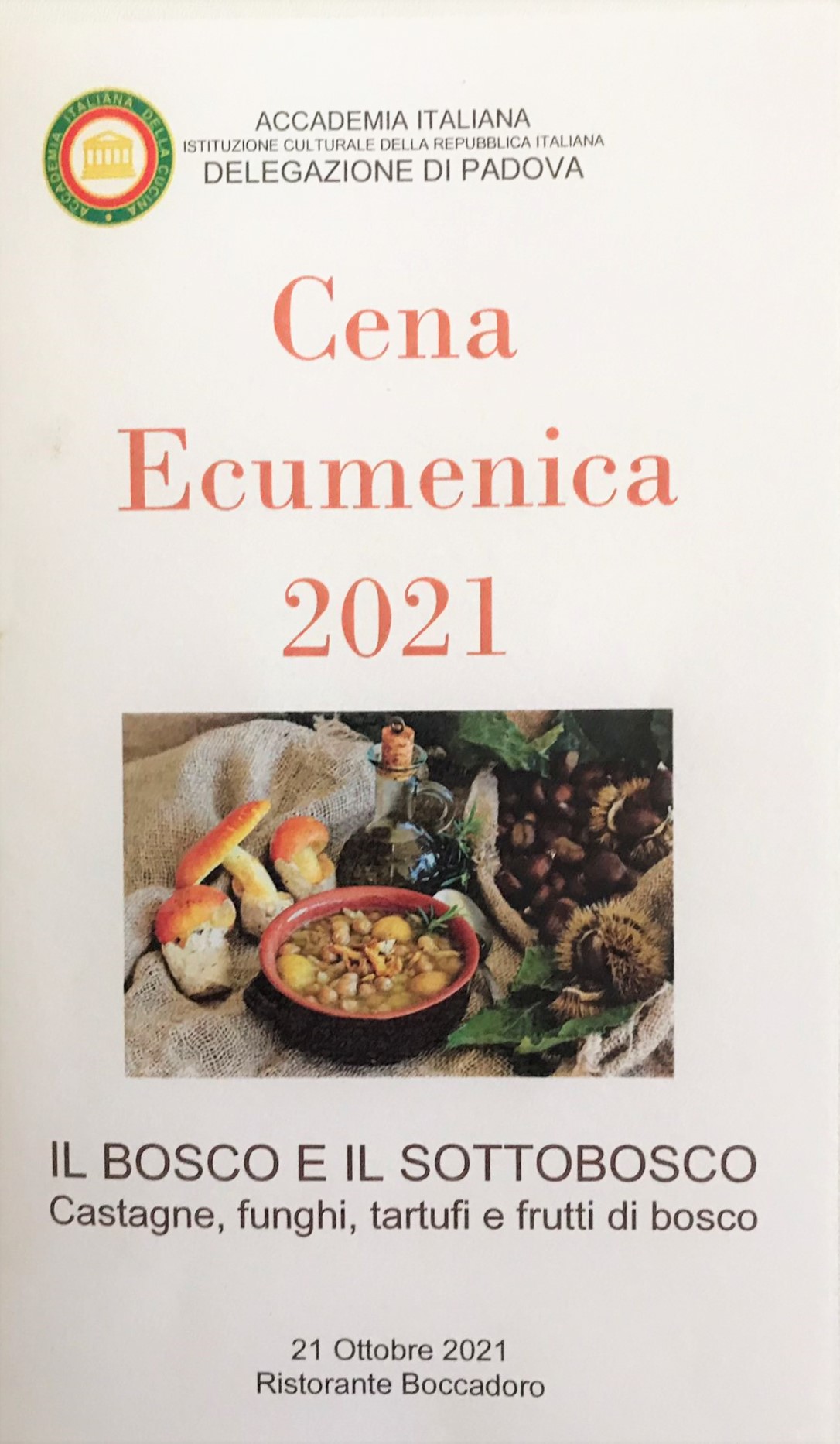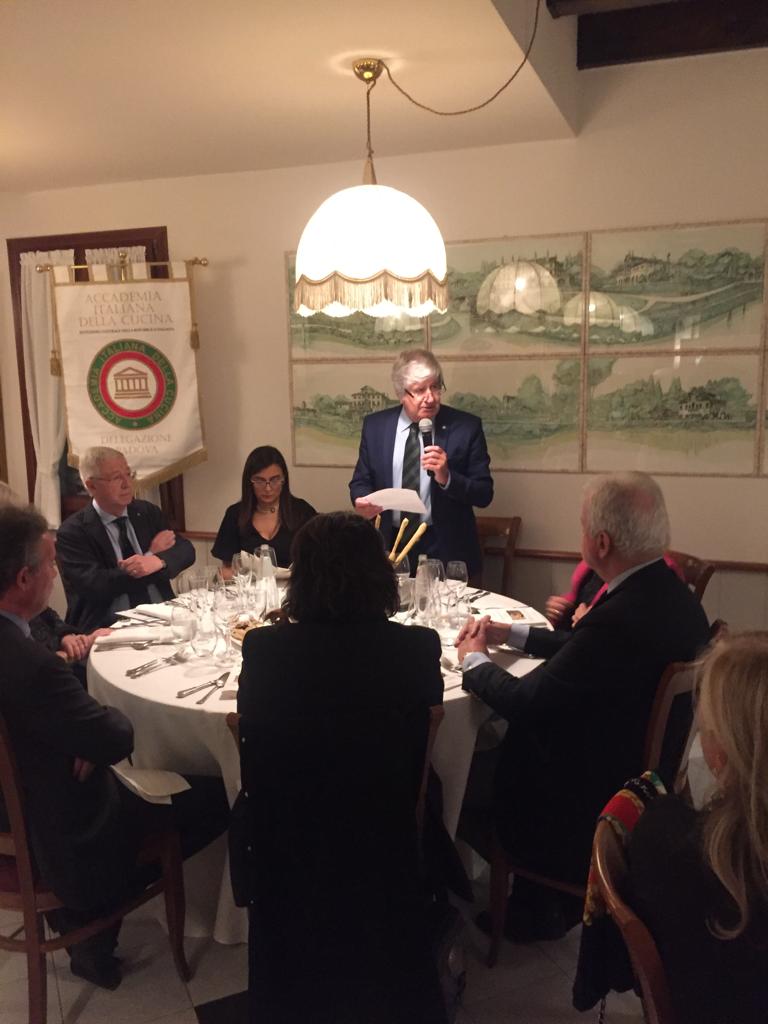 In occasione dell’annuale evento ecumenico la Delegazione di Padova, nelle figure dei Simposiarchi Giancarlo Burri e Paolo Frugoni, si è rivolta alla competenza della famiglia Piovan titolare del ristorante “Boccadoro”, una delle storiche e indubbiamente migliori insegne della ristorazione padovana dal 1974. L’applaudita relazione introduttiva di Giancarlo Burri ha trattato l‘argomento dell’anno contestualizzandolo con le tradizioni, le contaminazioni e gli usi del territorio consolidati nel tempo. Successivamente è stata omaggiata una curiosa ricerca dal titolo “I funghi, oggetti misteriosi: Falsi miti e credenze popolari” opera dell’Accademico Giampaolo Maria Guarnieri. Il menu ha pienamente soddisfatto il tema ecumenico e gli esigenti palati dei presenti, in particolar modo il risotto di fagiano e cinghiale con dadolata di funghi chiodini, ma anche le altre pietanze sono state di eccellente qualità. Abbinamento dei vini indovinato, con prodotti del territorio di alta qualità. Al termine, il Delegato Piero Dal Bello ha condiviso con la brigata di cucina e il personale di sala l’unanime soddisfazione espressa dagli Accademici.