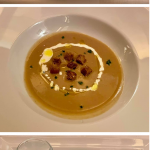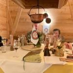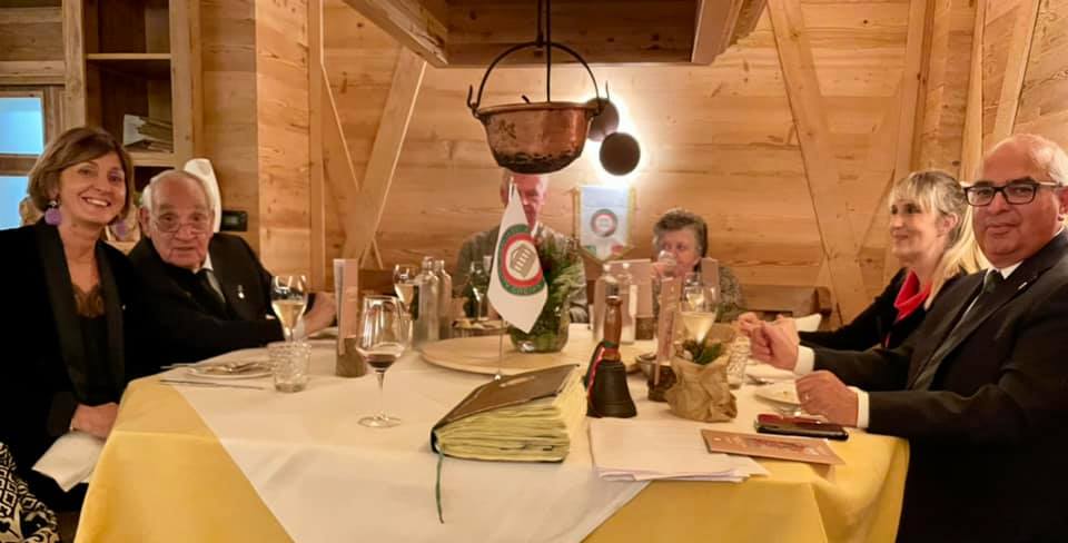 La Delegazione di Cortina d’Ampezzo ha scelto quest’anno la locanda “Al Capriolo” di Vodo di Cadore per celebrare la cena ecumenica: è questo uno dei ristoranti più tradizionali della zona che ha nella sua cucina una particolare predilezione per i prodotti del bosco e del sottobosco, tema della serata. Il menu in tavola, seguito dai Simposiarchi Renato Pesavento e Luigi Alverà, è stato un susseguirsi di aromi, profumi, sapori dei boschi. Ha inoltre partecipato alla serata il dott. Michele Da Pozzo, Direttore del Parco Naturale delle Dolomiti d’Ampezzo, che ha raccontato ai presenti di un bosco nuovo creatosi dopo la tempesta Vaia del 2018 che ne ha cambiato orizzonti e territori e che se l’uomo saprà operare saggiamente potrà ritrovare nel tempo l’equilibrio perduto. In questa occasione è stato attribuito il premio “Massimo Alberini” alla signora Rita della “Piccola Gastronomia” di Vodo di Cadore che prepara da sempre con passione i piatti della tradizione, con cura ed amore per i prodotti del territorio. Foto 1. Delegata Monica De Mattia, i Simposiarchi Pesavento e Alverà, dott. Da Pozzo, la signora Rita. Foto 2. La consegna del Premio Alberini. Foto 3-5. Le “fragranze del bosco”; crema di funghi di bosco con panna acida e crostini; tartelletta al saraceno, frutti di bosco e sorbetto al sambuco.
