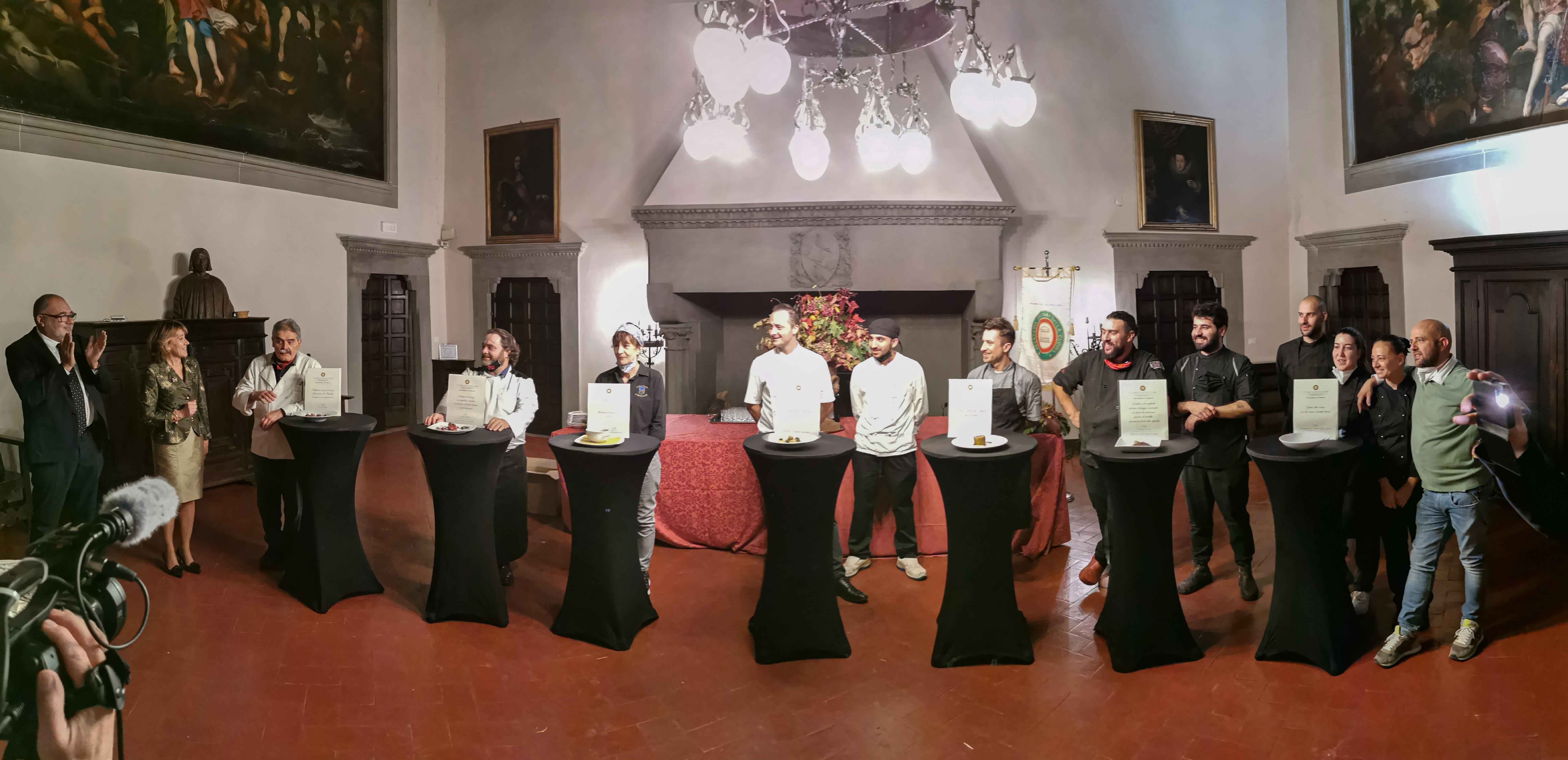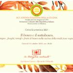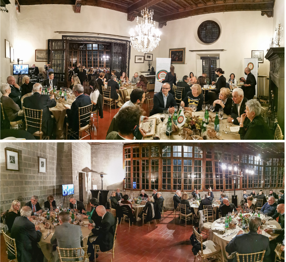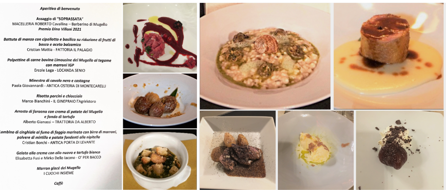 Le due Delegazioni toscane hanno celebrato la Cena Ecumenica nel Castello di Barberino affidando, come negli ultimi due anni, l’interpretazione del tema della serata ai cuochi di sette ristoranti del territorio con preparazione, da parte di ciascuno, di un piatto della tradizione. E così, dopo l’approfondita relazione dell’Accademico Tebaldo Lorini, si è assistito ad un susseguirsi di vere prelibatezze preparate con cura e passione, che hanno rievocato, con ricette anche molto antiche, i sapori e i profumi di dei preziosi frutti del bosco e del sottobosco (foto 4, menu e portate). Durante la serata, la Delegata del Mugello Monica Sforzini e il vicesindaco di Barberino Sara Di Maio hanno consegnato il Premio Dino Villani 2021 ai signori R. Ingenito e A. Bossoli della Macelleria Roberto (fraz. Cavallina) per l’eccellente soprassata, assaporata anche durante l’aperitivo (foto 1 in alto; in basso i due Delegati Monica Sforzini e Sandro Fusari). La Cena, alla quale hanno partecipato oltre agli Accademici delle due Delegazione anche moltissimi ospiti e autorità (foto 2), si è conclusa con la consegna, tra gli interminabili applausi, del piatto dell’anno a tutti i cuochi, che ancora una volta hanno dato una bellissima dimostrazione di elevata bravura e di grande coesione (foto 3).