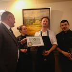 Grande successo per la Cena Ecumenica della Delegazione di Den Haag-Scheveningen grazie ai cuochi Benedetta Paolinelli, Mattia Piras, Danny Russo e al sommelier/gestore Tellis Muca del ristorante “La Passione”. Durante la serata è stato consegnato il Diploma di Buona Cucina, accolto dai ristoratori con orgoglio e gioia. Il ristorante “La Passione” ha dimostrato anche in questa occasione di meritare il prestigioso riconoscimento dell’Accademia confermandosi il miglior locale italiano dell’Aia. Foto 1. Il Delegato Ciro Pernice consegna il premio. Foto 2. Presentazione del tema “Funghi e frutti di bosco e dune nei Paesi Bassi”. Foto 3. Antipasto (petto di fagiano affumicato, gel di mirtillo, crumble di noci, spugna di erbe). Foto 4. primo piatto (funghi porcini, polenta mantecata al pecorino di grotta, uovo pochè).