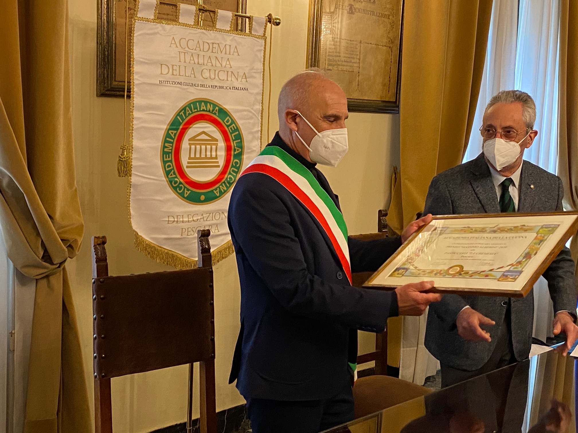 La Delegazione di Pescara ha assegnato il Premio “Massimo Alberini” edizione 2020 a Giacomo De Acetis titolare della trentennale pasticceria “La Cremeria”. Erede di una dinastia di pasticcieri, Giacomo non è più un artigiano, è un vero artista. Il più piccolo dei suoi pasticcini è un capolavoro. In ogni cosa che fa ci mette la sua esperienza, il suo amore, la sua firma. “La Cremeria” è una pasticceria della tradizione che non indulge al richiamo delle mode e non si è fatta tentare dal virtuosismo tecnologico esagerato. Nel laboratorio di De Acetis non si producono né cake design né cupcakes. Ogni cosa lì ha il suo sapore, nulla sa di finto: i pasticcini, le torte, le chiacchiere al rum e miele, le zeppole fritte e al forno o il semplice cornetto del mattino, preparati con prodotti di qualità, con tecnica e metodi antichi. A causa della perdurante situazione pandemica, la consegna del premio è avvenuta nella Sala Giunta del Municipio di Pescara, per mani del Sindaco Carlo Masci e del Delegato Giuseppe Fioritoni, alla presenza di una piccola rappresentanza della Delegazione pescarese composta dai Consultori Alessandro Atalmi, Giuseppe Di Croce e Licio Pardi e dagli Accademici Paolo Toppetti, Giampaolo Sciarretta, Alessandra D’Attilio e Rosanna Della Vecchia.