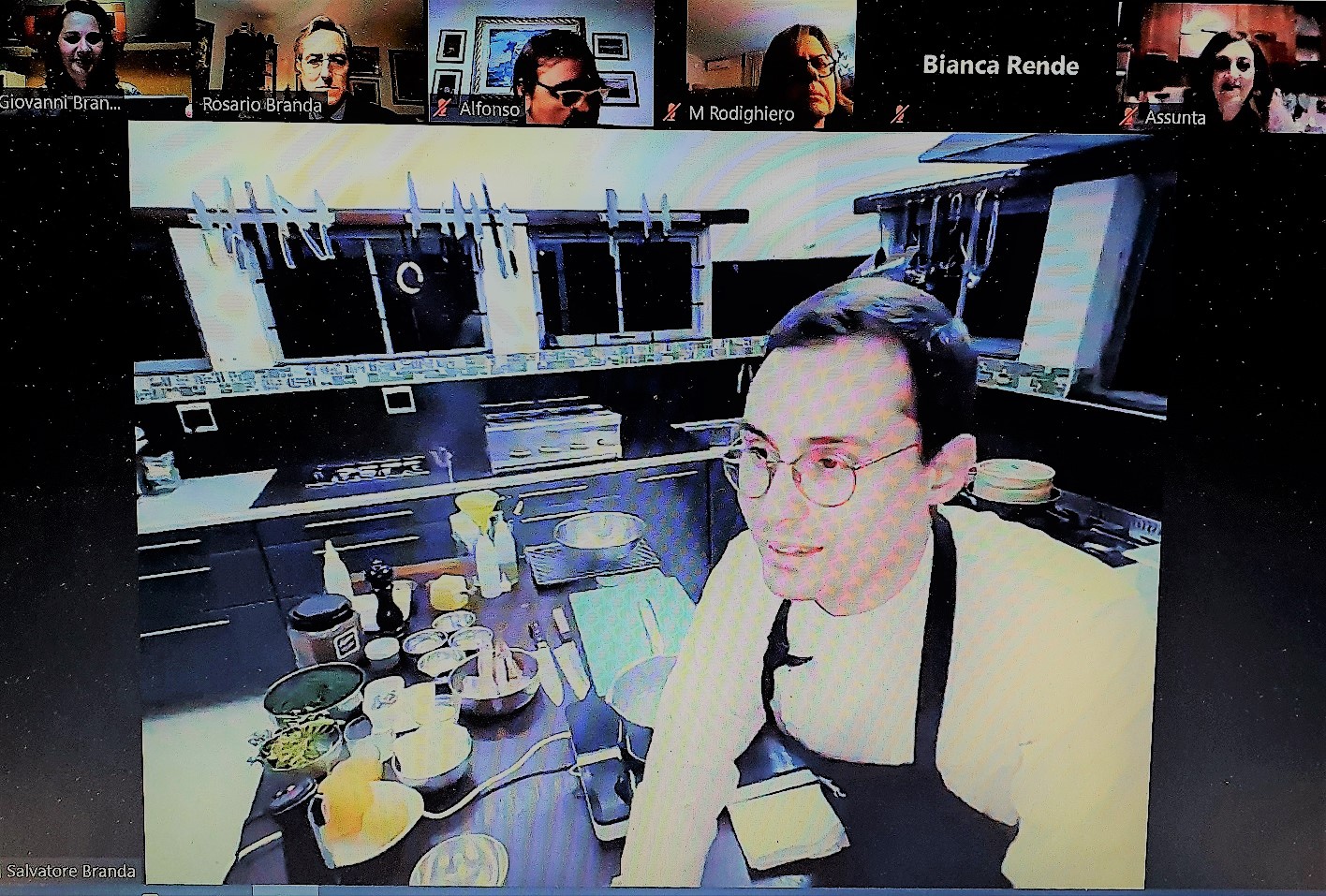 "Oggi si cucina a casa, in tandem con lo chef", è l'iniziativa della Delegazione di Cosenza dell'Accademia Italiana della Cucina che si è svolta in modalità a distanza. Salvatore Branda, chef del ristorante-guest house "La Sosta" Swellendam in Sudafrica (foto 1) ha preparato insieme agli Accademici in collegamento da casa (foto 2), una tartare di gamberi marinati agli agrumi e liquirizia di Calabria Amarelli, acqua di finocchietto selvatico, ricotta e cialda corallo allo zafferano (foto 3). Informati per tempo circa la lista degli ingredienti e gli utensili utili all’esecuzione della preparazione, sono stati numerosi gli Accademici che, seguendo i consigli dello chef, hanno realizzato il piatto in contemporanea. A conclusione della serata lo chef ha preparato anche un filetto d'agnello del Karoo con patata diversamente 'mpacchiusa, frigitelli e flan di spinacino selvatico (foto 4).