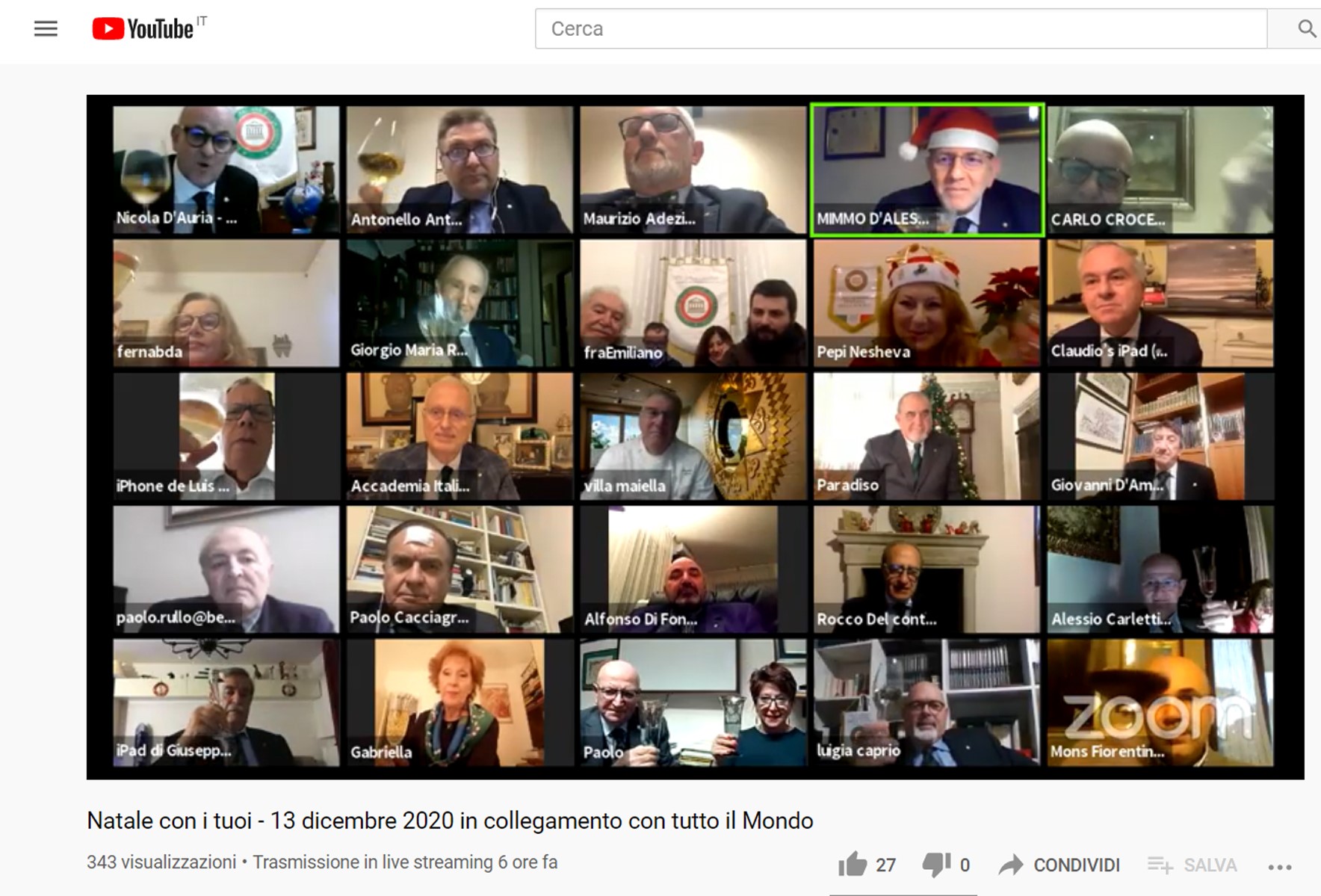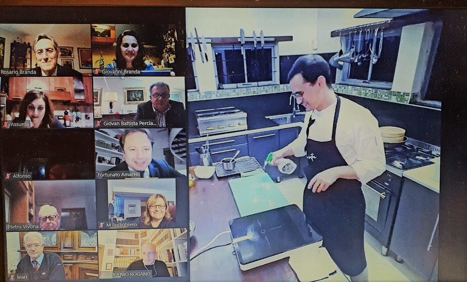 "Un grande abbraccio con la famiglia accademica per riunire i due emisferi e raccontare questo Natale dal punto di vista gastronomico": così il Delegato di Chieti, Nicola D'Auria, ha presentato "Natale con i tuoi", un incontro on-line (sulle piattaforme Zoom, YouTube e Facebook) sulle tradizioni natalizie a tavola, in cui sono intervenuti in diretta il Legato per lo Stato Città del Vaticano, i Delegati di San Francisco, New York, Rio de Janeiro, Lisbona, Sofia, Singapore, Brisbane, lo chef abruzzese Peppino Tinari e il presidente del Gruppo Virtuale Cuochi Italiani, Mario Caramella, in collegamento dalla Corea del Sud. Coordinati dal Vice Presidente Vicario Mimmo D'Alessio, e con il saluto del Segretario Generale Roberto Ariani, nelle due ore di incontro, gli intervenuti hanno delineato un quadro generale della cucina italiana delle feste in tutto il mondo, segnando anche idee e prospettive per il dopo-Covid. Un approfondimento culturale concluso con i bicchieri in alto per l'augurio di Buon Natale e di un più felice 2021. Foto 1. Delegati, Accademici e ospiti collegati sulla piattaforma. Foto 2. Il Segretario Generale Roberto Ariani. Foto 4. Il Delegato Onorario e Vice Presidente Vicario Mimmo D'Alessio conduttore dell'incontro. Foto 4. Mario Caramella in diretta da Jeju in Corea.