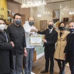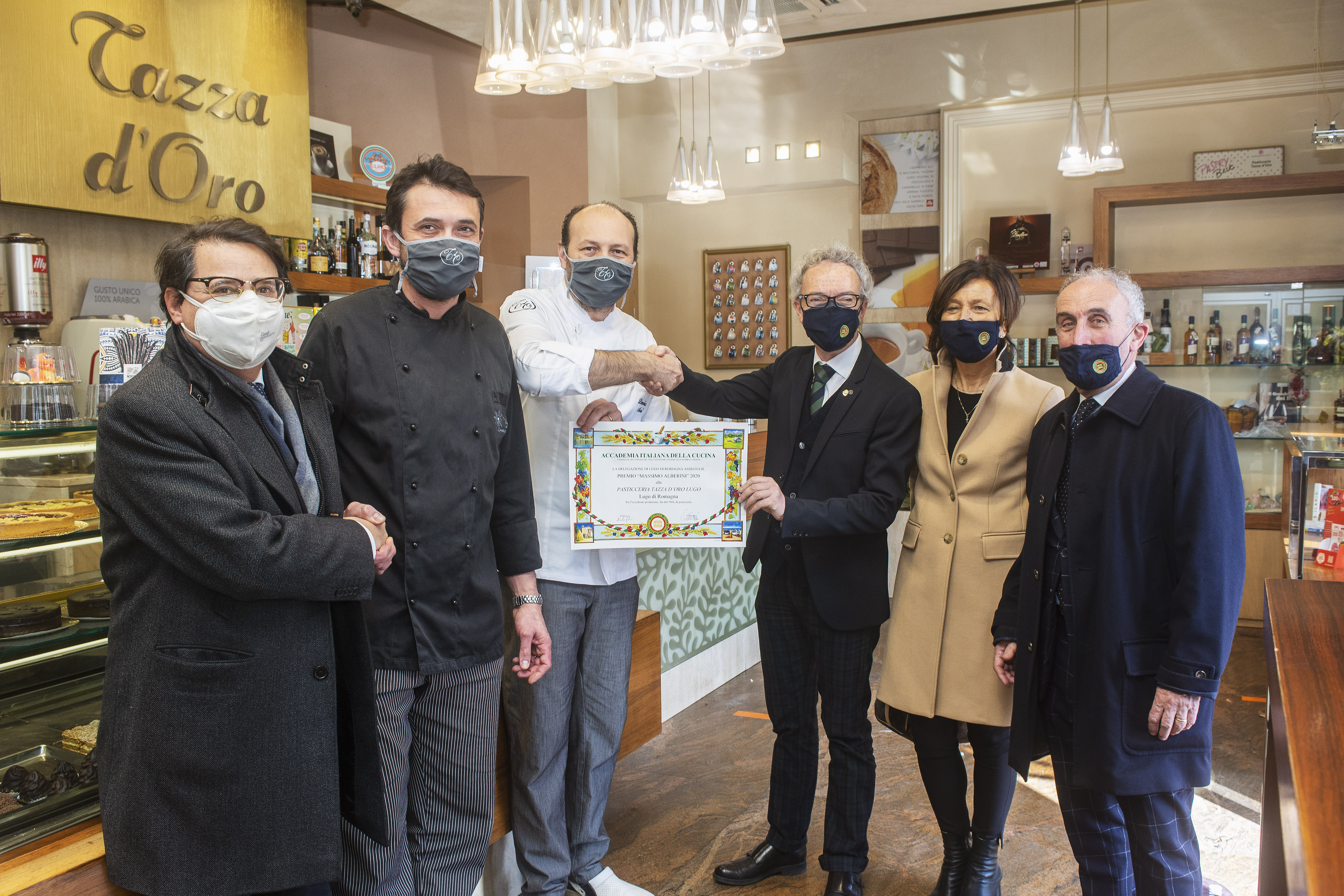 Il Delegato di Lugo di Romagna Fabio Monducci ha consegnato, con grande soddisfazione, il Premio Massimo Alberini al Bar Pasticceria Tazza d’Oro di Lugo. Si tratta di un riconoscimento riservato ad attività che offrono, da tempo, prodotti lavorati artigianalmente e di qualità, nel rispetto della tradizione del territorio. È la prima volta che la Delegazione di Lugo ha questa opportunità, ora riservata alla Tazza d’Oro, che fin dal 1968, nelle varie generazioni della famiglia Medri è sempre stata riferimento per un prodotto di elevato pregio, dove tradizione e innovazione si fondono con ottimi risultati nella produzione di paste dolci e salate e nei rinomati panettoni e uova di Pasqua. Un riconoscimento che assume un particolare rilievo nel particolare momento che stiamo vivendo, anche come segno di vicinanza da parte degli Accademici nei confronti di una realtà da tutti conosciuta e apprezzata, che è riuscita a crescere e svilupparsi senza mai abbandonare le radici lughesi. Nella foto il Delegato Fabio Monducci e gli Accademici proponenti Loredana Landi, Guido Rosi Bernardini e Giorgio Grandi insieme ai titolari Domenico e Cristian Medri.