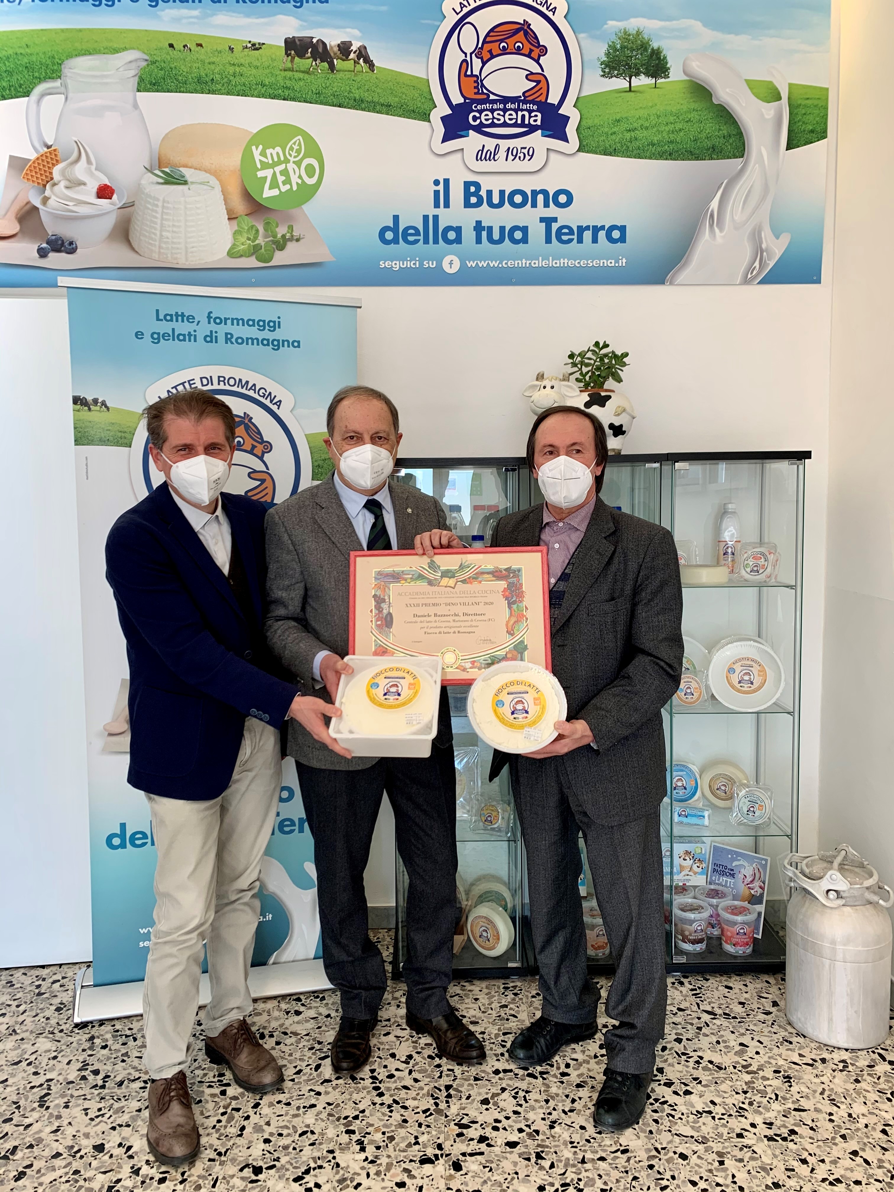 Una rappresentanza della Delegazione di Cesena ha consegnato il Premio Villani al Presidente e al Direttore della Centrale del latte di Cesena per il prodotto "Fiocco di Latte di Romagna". La ricotta “Fiocco di Latte” si è distinta per la rilevante e specifica qualità organolettica, lavorata con ingredienti locali, come il sale dolce delle Saline di Cervia e l’acqua salsobromoiodica delle Terme di Fratta, oltre all’utilizzo di solo latte vaccino del territorio. A causa della perdurante situazione pandemica, la cerimonia di consegna del diploma è avvenuta presso la sede aziendale. Foto 1 (da sinistra). Il Segretario della Delegazione Oreste Di Giacomo, il Direttore Daniele Bazzocchi, il Delegato Claudio Cavani, il Presidente della Centrale del latte Renzo Bagnolini, il past Delegato Gianluigi Trevisani, l’Accademico Marco Dalla Rosa. Foto 2. Bazzocci, Cavani, Bagnolini. Foto 3. Il “Fiocco di latte di Romagna”.