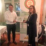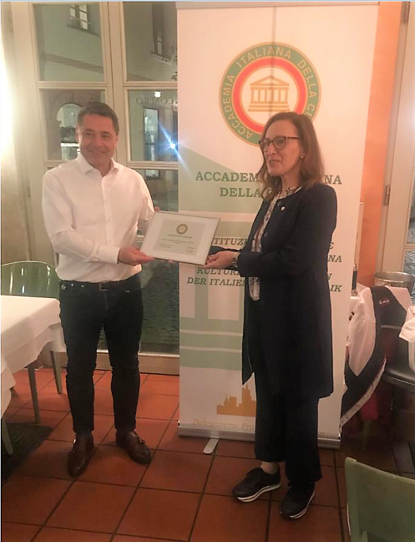 La Cena Ecumenica della Delegazione di Francoforte si è tenuta al ristorante "Incontro" di Magonza (Mainz) con una rappresentanza della Delegazione locale. I pochi fortunati Accademici presenti hanno potuto godere delle delizie che il proprietario del ristorante Giuseppe Dato e il suo team hanno preparato, risvegliando esperienze olfattive legate all’infanzia italiana dei convenuti. Gli ospiti sono stati accompagnati con professionalità nell’universo delle fritture: mozzarella di bufala in carrozza, carciofi fritti e frittata di zucca, arancino classico su passata di pomodoro, fritto di pesce con triglie, calamari, rana pescatrice, alici, gamberoni e verdure fritte, cannoli di ricotta e pagnuccata. Durante la Conviviale si è disquisito di olii e grassi animali, delle temperature e tecnica di cottura e ricercato le tracce di fritture nella letteratura approdando alla frittata celestiale di D’Annunzio con 33 uova e alle descrizioni delle zeppole napoletane di Johann Wolfgang von Goethe, quando, durante il soggiorno partenopeo, racconta, in occasione della festa di San Giuseppe, della sua esperienza gastronomica per le strade di Napoli. A conclusione della serata è stato conferito il riconoscimento di Buona Cucina: un momento commovente soprattutto per il signor Dato che non ha nascosto la sua preoccupazione per l’evolversi della situazione COVID-19 (in foto 1 con la Delegata Laura Melara-Dürbeck).