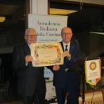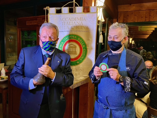 Per celebrare la Cena Ecumenica 2020 la Delegazione di Fermo ha scelto di ritrovarsi presso il ristorante Damiani e Rossi, regno dello chef Aurelio Damiani (in foto 1 con il Delegato Fabio Torresi), collaudato interprete della cucina tradizionale del Fermano che ha ricevuto il prestigioso premio Giovanni Nuvoletti. Coaudiuvato dalla Simposiarca Anna Maria Ciciretti, membro del CST Marche, lo chef ha stilato un menu sintesi di ciò che i Fermani sono avvezzi immergere in olii e strutti bollenti per estrarne sapori identitari e di memoria, per la piena soddisfazione degli Accademici convenuti. Tra questi, le polpette di borragine, la frittatina alla cipolla rossa di Pedaso e sapa, le animelle di agnello dei nostri Sibillini -degno coronamento di un sublime risotto al rosmarino - e il trittico di carni fritte. Anna Maria Ciciretti ha relazionato sull’attività del Centro Studi e sulla importanza di tale organo per il ruolo che la nostra Accademia svolge in Italia e nel mondo. Gli Accademici hanno trovato ampia sintesi del lavoro svolto dalla nostra Delegazione per il tema dell’anno nel volume "Fritti, frittate e frittelle nella cucina della tradizione regionale" distribuito a termine della Conviviale.