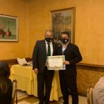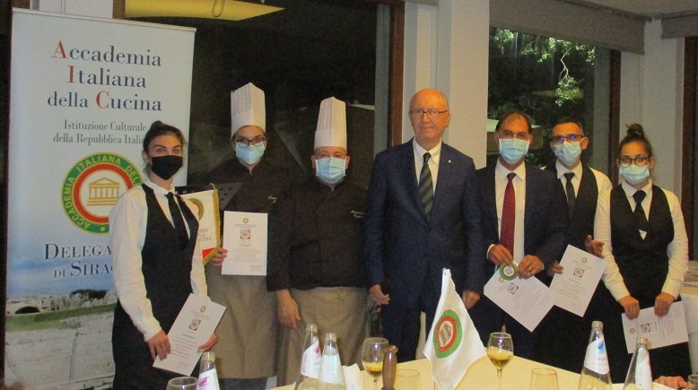 Nell'accogliente ed elegante cornice del ristorante "Eduardo" dell'Hotel Parco delle Fontane, nel rispetto della normativa sanitaria, si è tenuta la Cena Ecumenica 2020 della Delegazione di Siracusa (foto 1, Accademici a tavola). Il Delegato Angelo Tamburini ha presentato e dato il benvenuto al nuovo Accademico Enrico Maggi, recentemente trasferito dalla Delegazione di Merano. In questa importante occasione, l'Accademico Gaetano Mirmina (foto 1), con grande commozione ha invece ricevuto dal Delegato l'attestato e il distintivo di appartenenza trentacinquennale all'Accademia. Tamburini ha poi brevemente presentato e distribuito ai presenti il volume "Fritti, frittate e rrittelle" tema della Cena Ecumenica. A seguire sono state servite in tavola le pietanze ben preparate e presentate dal maestro di cucina Massimo Cappuccio ed in buon abbinamento i vini presentati dal maestro di sala e dei vini Antonio Mancarella (foto 2, il Delegato consegna il guidoncino alle brigate di cucina e sala). Tra i piatti proposti: l'arancina, la siciliana tuma e acciuga, la parmigiana, il gran fritto dello Jonio e l'immancabile cannolo. Gradito ospite ddlla serata, il Coordinatore Territoriale del Trentino Alto Adige Raul Ragazzi.