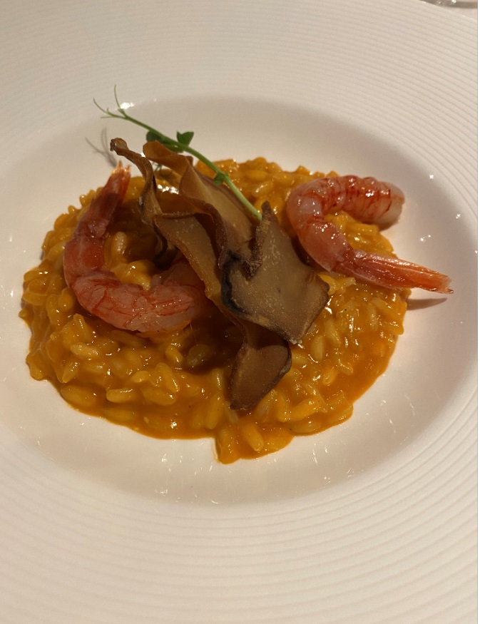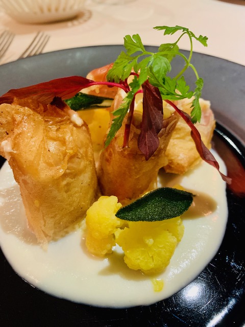 Gli Accademici della Svizzera Italiana si sono ritrovati in piena sicurezza per celebrare la Cena Ecumenica 2020 presso il ristorante “Al Faro”, accolti da Loredana Pia Bordogna, ristoratrice di lungo corso, proveniente da una delle famiglie simbolo della ristorazione in Ticino. Il menu, studiato dallo chef Pierfranco Abbondio con i Simposiarchi Frey e Ghirlanda utilizzando prodotti di prima qualità, è stato all’insegna delle varie tipologie e tecniche di frittura, tra piatti della tradizione marinara italiana e dei laghi insubrici. Lo stesso chef Abbondio ha illustrato, tra una portata e l’altra, queste varie tecniche e la scelta delle stesse a seconda della tipologia del piatto. Foto 1 (da sinistra). Il Delegato Emilio Casati, gli Accademici Giovanni Frey e Giancarlo Ghirlanda, la brigata di cucina e lo chef Pierfranco Abbondio. Foto 2 (da sinistra). Il Delegato e Loredana Pia Bordogna. Foto 3. Gambero in pastella con frutto della passione; calamarata soffiata con mousse di baccalà e pomodoro al lime; filetto di triglia al panko e lampone; bocconcino di tonno con maionese all’acciuga. Foto 4. Risotto con gamberi di Mazzara del Vallo e funghi porcini fritti.