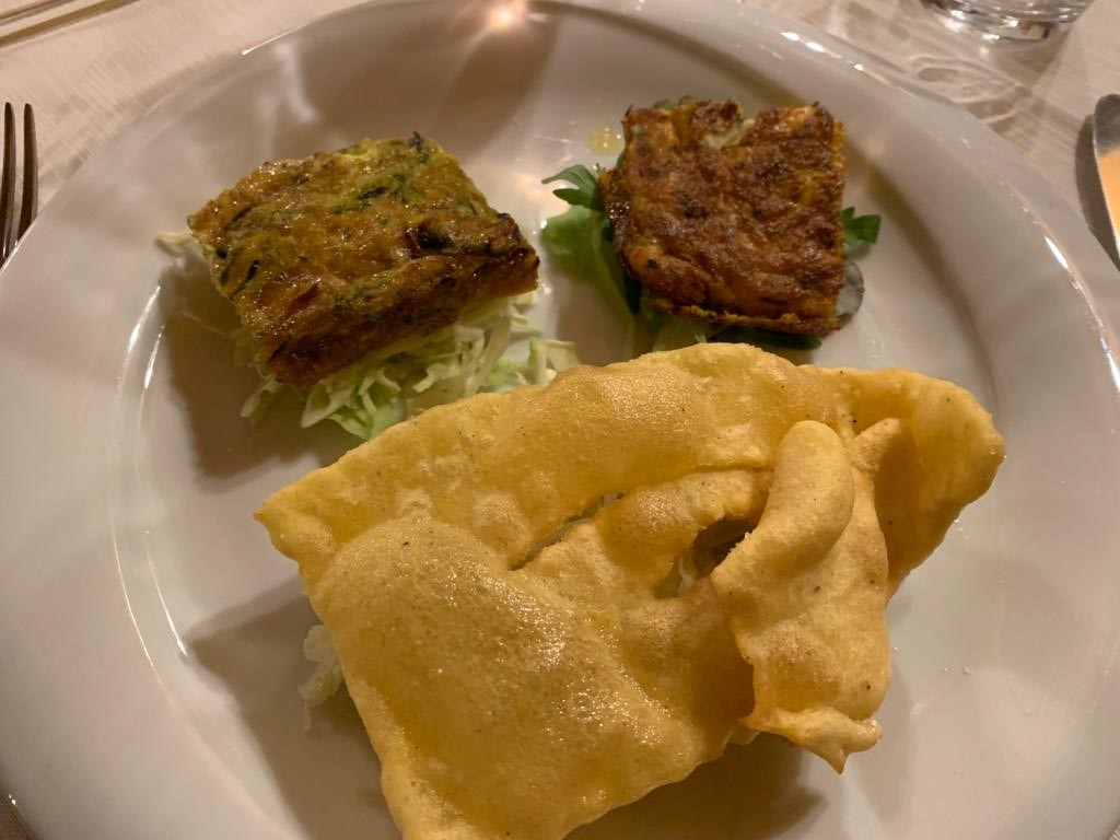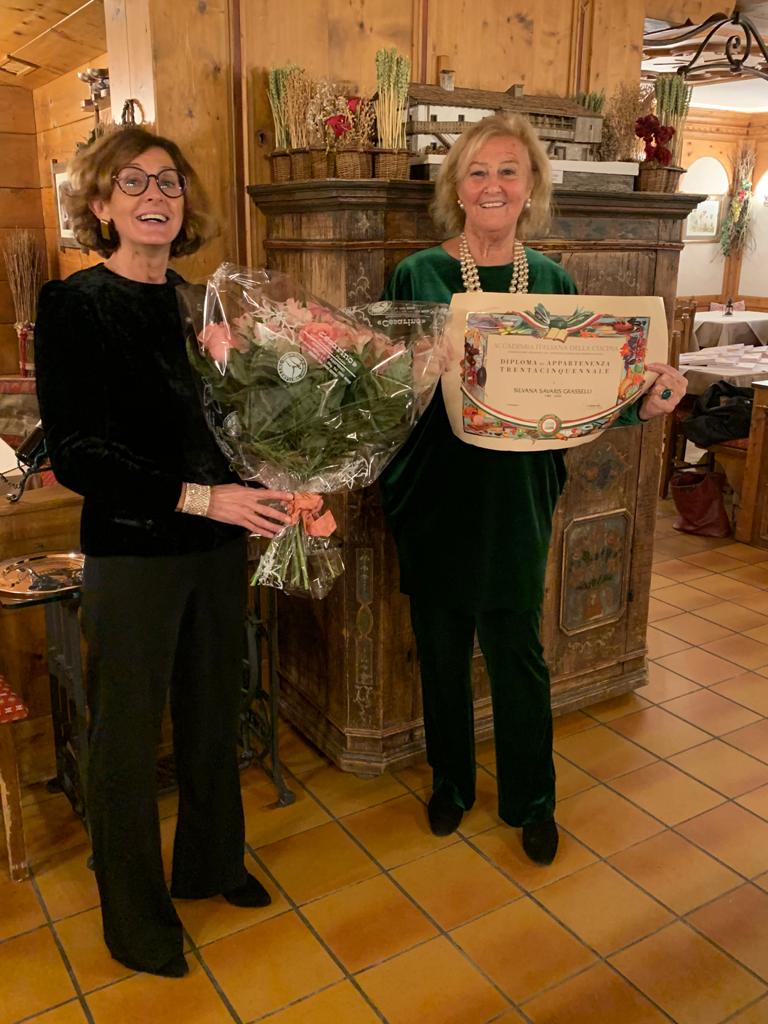 Giunto l’atteso momento della tradizionale Cena Ecumenica, la Delegazione di Cortina d’Ampezzo si è ritrovata presso il Ristorante Rio Gere per celebrare il goloso tema “Fritti, rrittate e frittelle”. Mentre al di fuori cadeva la prima neve, all’interno si è potuto godere di un menu particolarmente stuzzicante, curato dai Simposiarchi Silvana Savaris Grasselli e Paolo Bardin. In un clima di festosa allegria la Delegata Monica De Mattia ha consegnato a Silvana Savaris Grasselli (membro del CST Veneto) il diploma dei trentacinque anni di appartenenza all'Accademia (Foto 1). Foto 2 (da sinistra). Il Vice Delegato Diego Dipol, la Delegata Monica De Mattia, il Simposiarca Paolo Bardin e il Delegato Onorario Luigino Grasselli. Foto 3. Tempura di peperoni, funghi, cipolle e cavolfiori. Foto 4. Frittata Artusi con cipolla su misticanza, zucchine e formaggio su cappuccio e Carafoi di patate su letto di crauti.