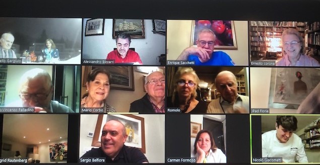 Il 15 ottobre alle ore 20, la Delegazione di Santiago del Cile attraverso un incontro via zoom, ha celebrato come ogni anno la tradizionale Cena Ecumenica. Presenti il Delegato Alessandro Bizzarri, la Vice Delegata Floria Orsini e la Segretaria Patricia Angelini accompagnati da un folto numero di Accademici con i propri famigliari (foto 1). Per l'occasione è stata organizzata una lezione di cucina diretta dallo chef milanese Nicolò Giacometti (foto 2) in Cile dal 2014 e proprietario del ristorante “Buona Forchetta”. Giacometti ha preparato i piatti in diretta spiegandone dettagliatamente l'esecuzione. Aderendo al tema dell'anno sui fritti, frittate e frittele lo chef ha proposto la panissa ligure (foto 3) e, in preparazione del Natale, gli struffoli (foto 4). Gli Accademici hanno successivamente condiviso i piatti preparati in casa per l’occasione fra i quali calamari fritti, polpette di pesce, crocchette di patatate, fritelle di zucchine e i mondeghili (polpettine di carne tipiche della cucina milanese). Malgrado la situazione imposta dal COVID, la Delegazione è riuscita a condividere un momento di convivialità, seppur non in presenza, in una modalità simpatica e anche costruttiva.