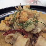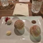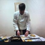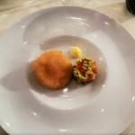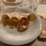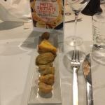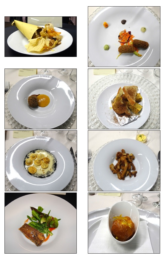In occasione della Cena Ecumenica della Delegazione di Genova, lo chef Luca Collami del ristorante "La Veranda" del Grand Hotel di Arenzano (GE), ha tradotto i piatti della tradizione sul tema dell'anno "Fritti, frittate e frittelle". La sua proposta: frisceu di ceci, una "innovativa e scomposta" frittata di carciofi con piccolo assaggio di quella tradizionale accanto; un cavallo di battaglia dello chef: la sua triglia fritta in forno, croccante e leggerissima. Confronto attento tra gli Accademici sul primo piatto, con un particolare accostamento, non semplice, di un tortello di crostacei su salsa di lattuga e salicornia. Gradito il dessert, con una delicata traduzione del tradizionale latte dolce fritto genovese, abbinato a tre declinazioni di mela. Il servizio si è dimostrato puntuale e attento. In foto 1. Una prospettiva della sala con Accademici e ospiti. Foto 2. Il dottor Marco Benvenuto. Foto 3. L'Accademico Lorenzo Ball. Foto 4. I piatti.