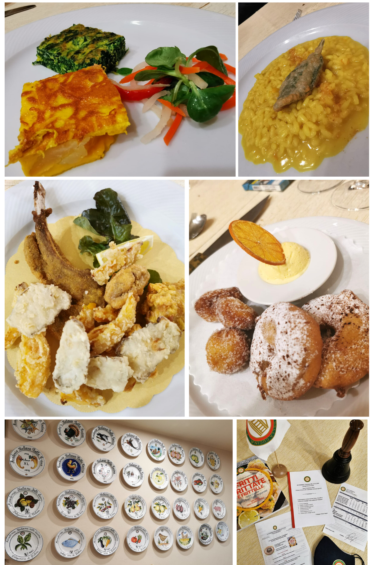 La Delegazione di Pisotia si è ritrovata per la Cena Ecumenica 2020 presso l'osteria "La Limonaia", uno storico locale pistoiese con una conduzione familiare che a maggio 2021 compirà 57 anni nel campo della ristorazione. Ampiamente trattato nei piatti il tema dell'anno 2020 "Fritti, Frittate e Frittelle" con un risultato eccellente su tutta la linea fra tradizione e innovazione. Foto 1. Accademici. Foto 2. Consegna del piatto dell'Accademia alla famiglia Taccioli. Foto 3. Le portate servite: uno degli antipasti con frittatine di pancetta, patate, verdure e spinaci; risotto allo zafferano con mandarino, amaretti e salvia fritta; uno dei due piatti di secondo fritti; frittelle di riso e mele con gelato alla vaniglia.