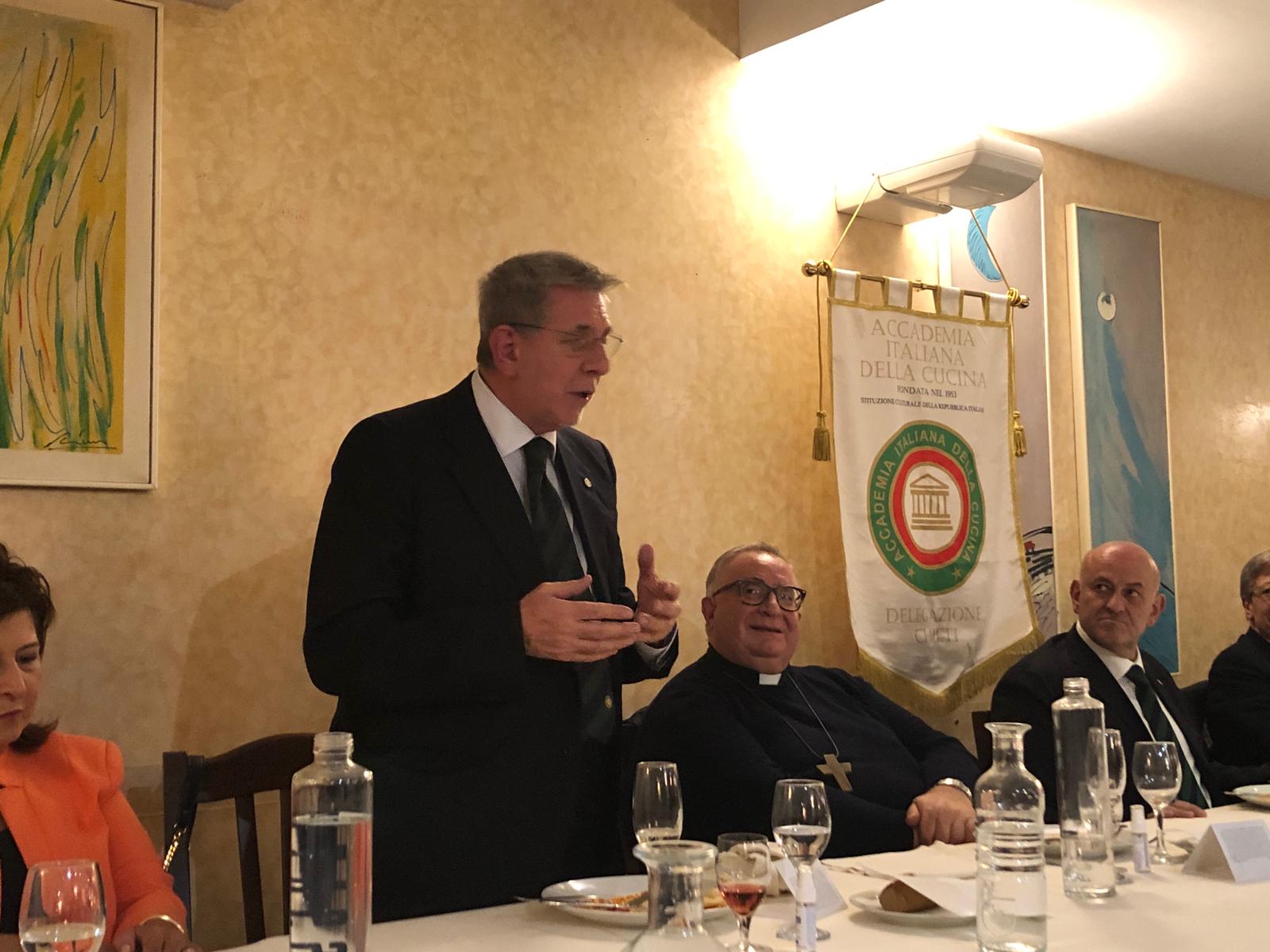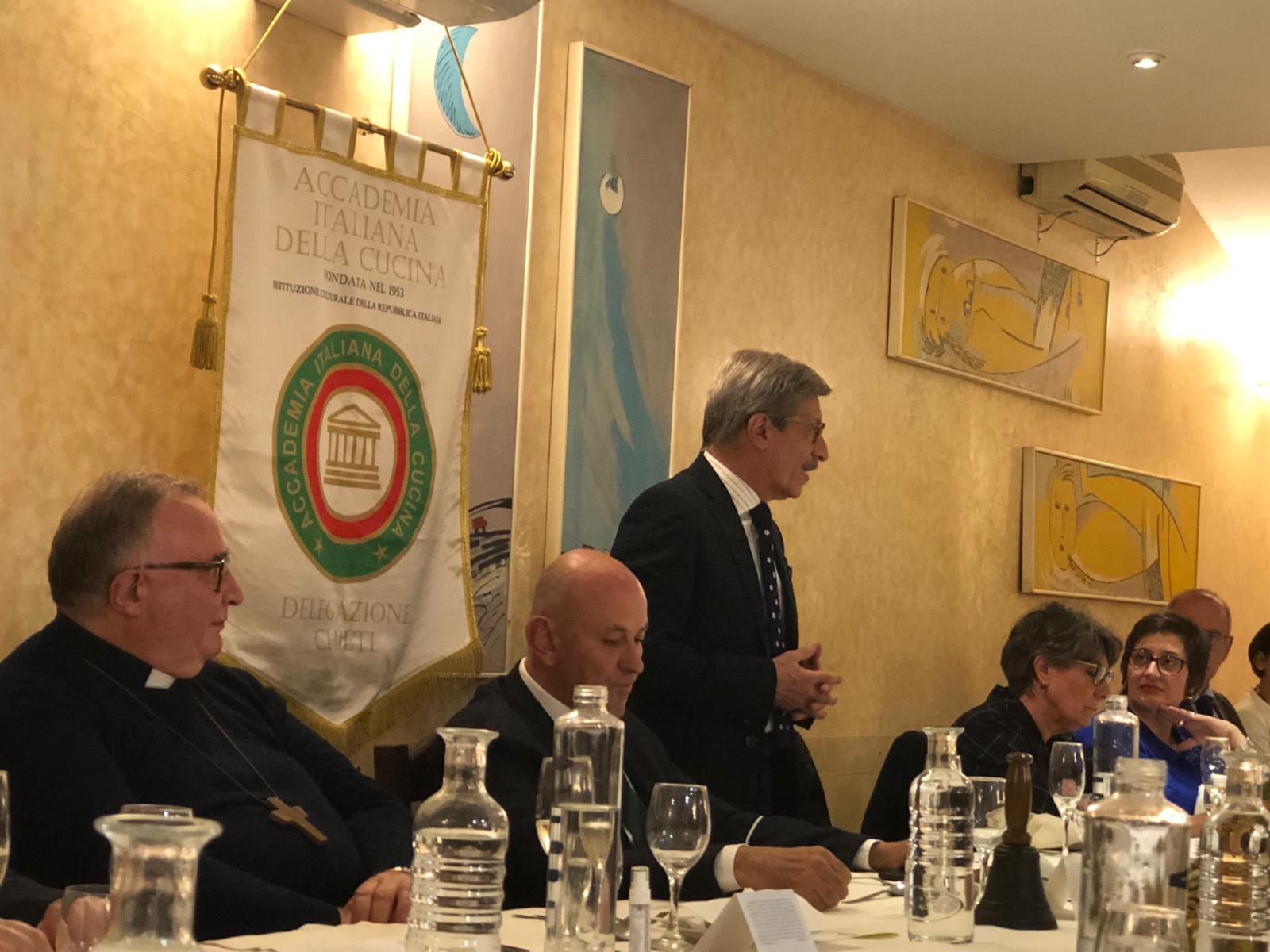 La delegazione di Chieti ha celebrato la Cena Ecumenica 2020 presso il ristorante “Canadese” in Caldari Stazione di Ortona. La riunione conviviale, organizzata brillantemente dal Simposiarca Orlando Damiani, e con la presenza e la benedizione di S.E. Monsignor Emidio Cipollone vescovo di Lanciano-Ortona, è stata preceduta da una edotta e brillante relazione da parte del nutrizionista dottor Corrado Pierantoni (in foto 1 durante il suo intervento). La cuoca del locale, Carmelina Catena, insieme alla sua brigata ha emozionato Accademici e ospiti con una degustazione di piatti a tema. Foto 2. L’intervento del Vice Presidente Vicario Mimmo D’Alessio. Foto 3. Il Delegato Nicola d'Auria consegna il guidoncini dell'Accademia ai gestori del locale.