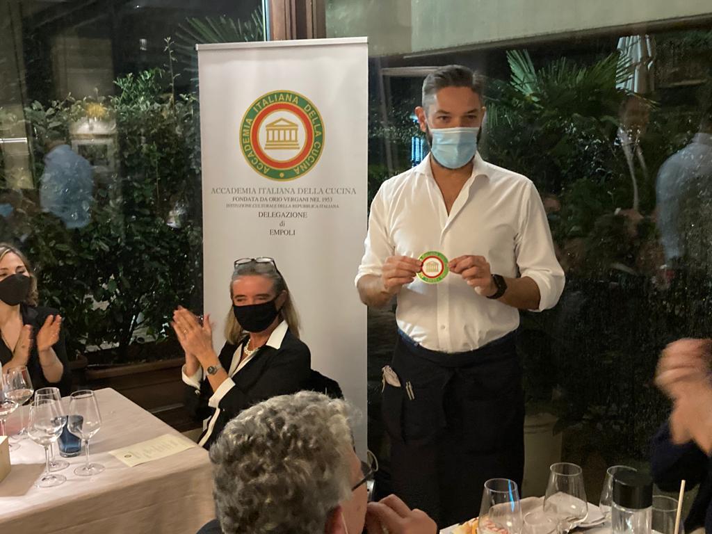 La Delegazione di Empoli ha celebrato la Cena Ecumenica presso il ristorante “Molo 73” di Empoli. Il Delegato Massimo Vincenzini (in foto 1) ha aperto la conviviale ricordando ai presenti e ai numerosi ospiti il significato e i valori dell’Accademia nonché della stessa Cena Ecumenica. La serata, ben organizzata dalla Simposiarca Carla Giovannelli, ha avuto il suo momento culturale con la nutrizionista dott.ssa Luisa de Risi che ha parlato del fritto illustrandone le caratteristiche nutrizionali e gli accorgimenti per renderlo meno dannoso per la nostra salute (in foto 2). Le pietanze a base di pesce dello chef Emanule Sabatini sono state molto apprezzate e ben servite dallo staff; altrettanto apprezzato l’ottimo abbinamento di vini curato dal sommelier e responsabile di sala Riccardo Agresti. La serata si è svolta nel rispetto delle vigenti normative anticovid. Foto 3. Consegna della vetrofania al responsabile di sala Riccardo Agresti. Foto 4. Menu.