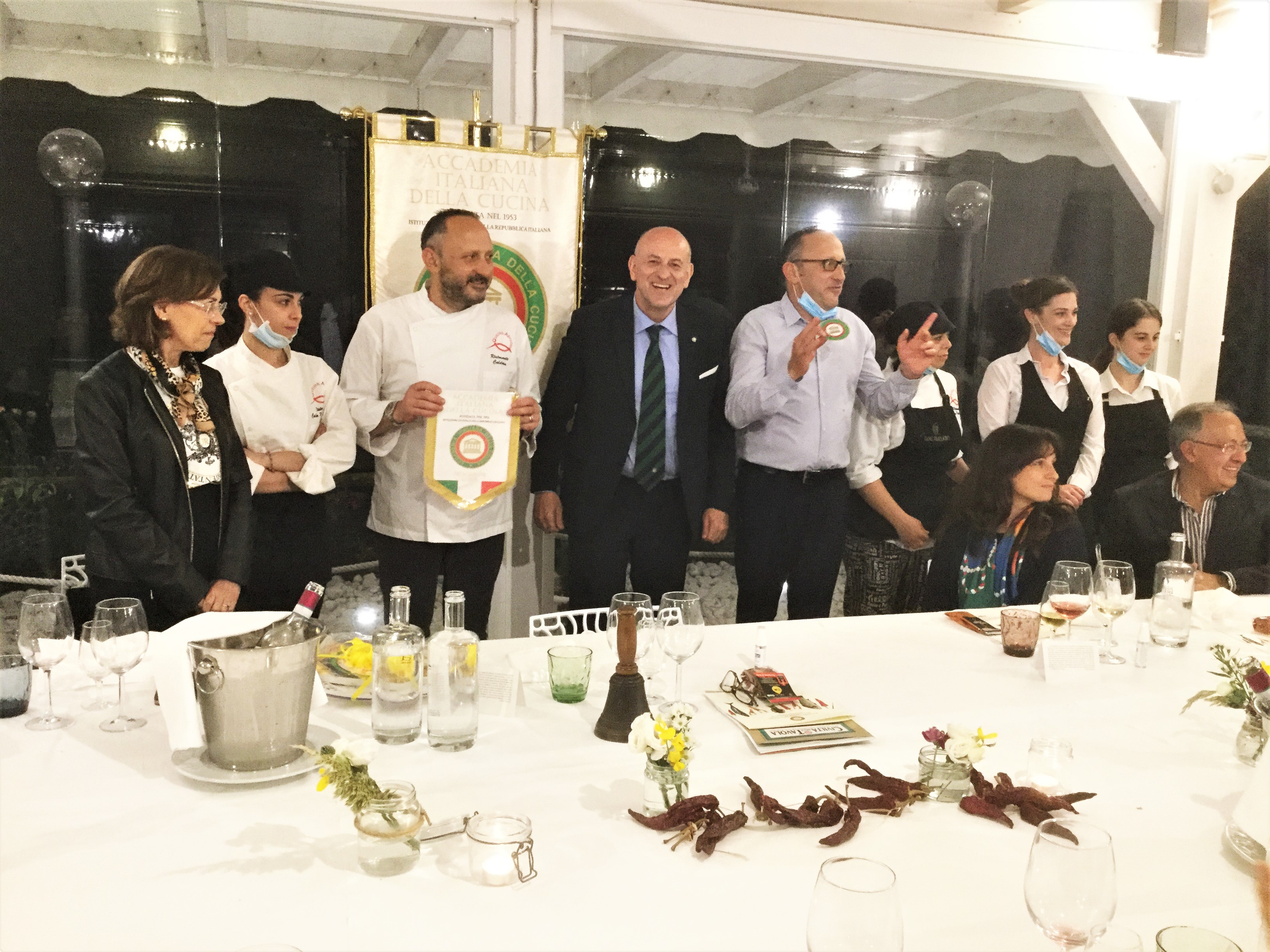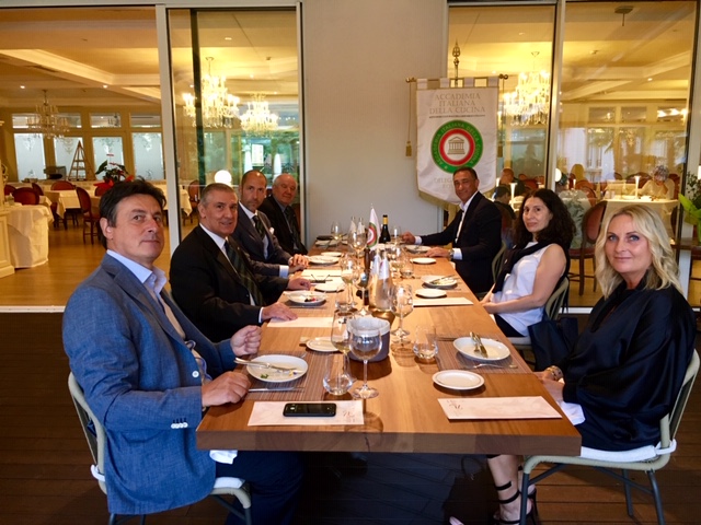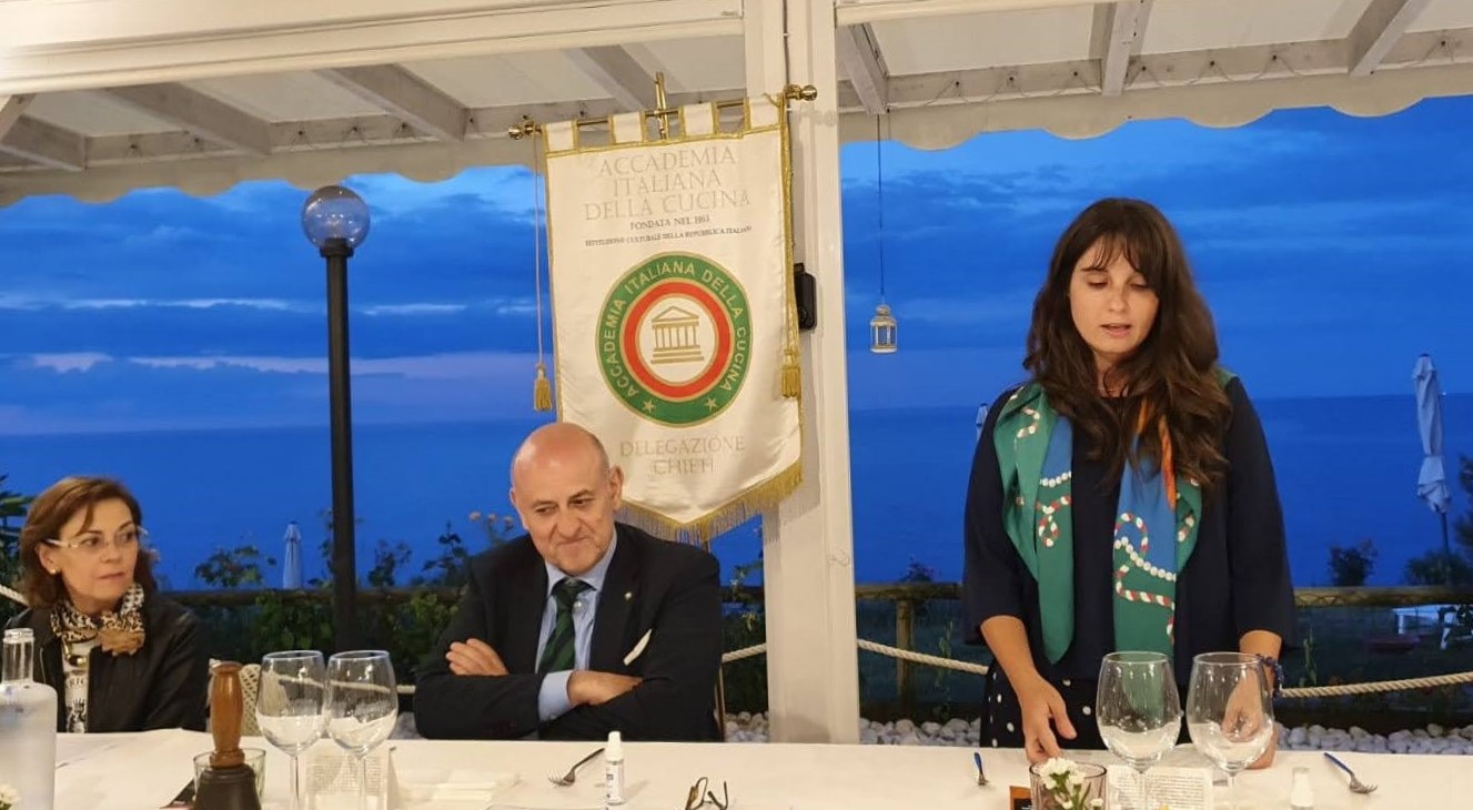 La prima riunione conviviale in presenza della Delegazione di Chieti dopo questi mesi di chiusura forzata si è svolta mercoledì 17 giugno al ristorante Caldora Punta Vallevò, nello scenario unico della Costa dei Trabocchi al tramonto. Ospite della serata è stata la prof.ssa Mariella Di Lallo, presidentessa dell'Associazione Il Peperone Dolce di Altino, che dal 2009 promuove e tutela questo importante prodotto del territorio teatino. Foto 1. Prof.ssa Mariella Di Lallo durante la sua relazione agli Accademici. Foto 2 (da sinistra). La relatrice prof.ssa Mariella Di Lallo, il Delegato Nicola D'Auria, la Simposiarca Maura Amoroso. Foto 3. La brigata di cucina con Marco e Luca Caldora. Foto 4. Il menu della serata.