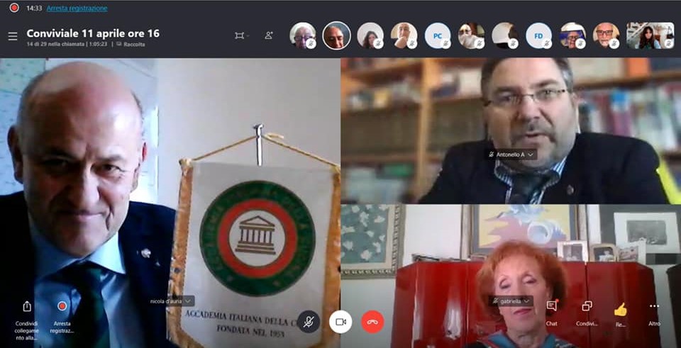 Sabato 11 aprile in occasione delle festività pasquali e dopo circa un mese di forzata inattività, la Delegazione di Chieti si è data appuntamento in una "video-Conviviale" per rivedere gli Accademici, fare il punto della situazione e scambiarsi gli auguri di Pasqua. Sono stati numerosi gli interventi di preoccupazione da parte degli Accademici, ma molti anche quelli propositivi, volti a riempire questo periodo di allontamento sociale con videoconferenze tematiche insieme ad esperti e illustri ospiti che permetteranno a tutti di mantenersi in contatto e aggiornati, discutendo delle innumerevoli tematiche che riguardano il mondo della ristorazione e della gastronomia italiana.