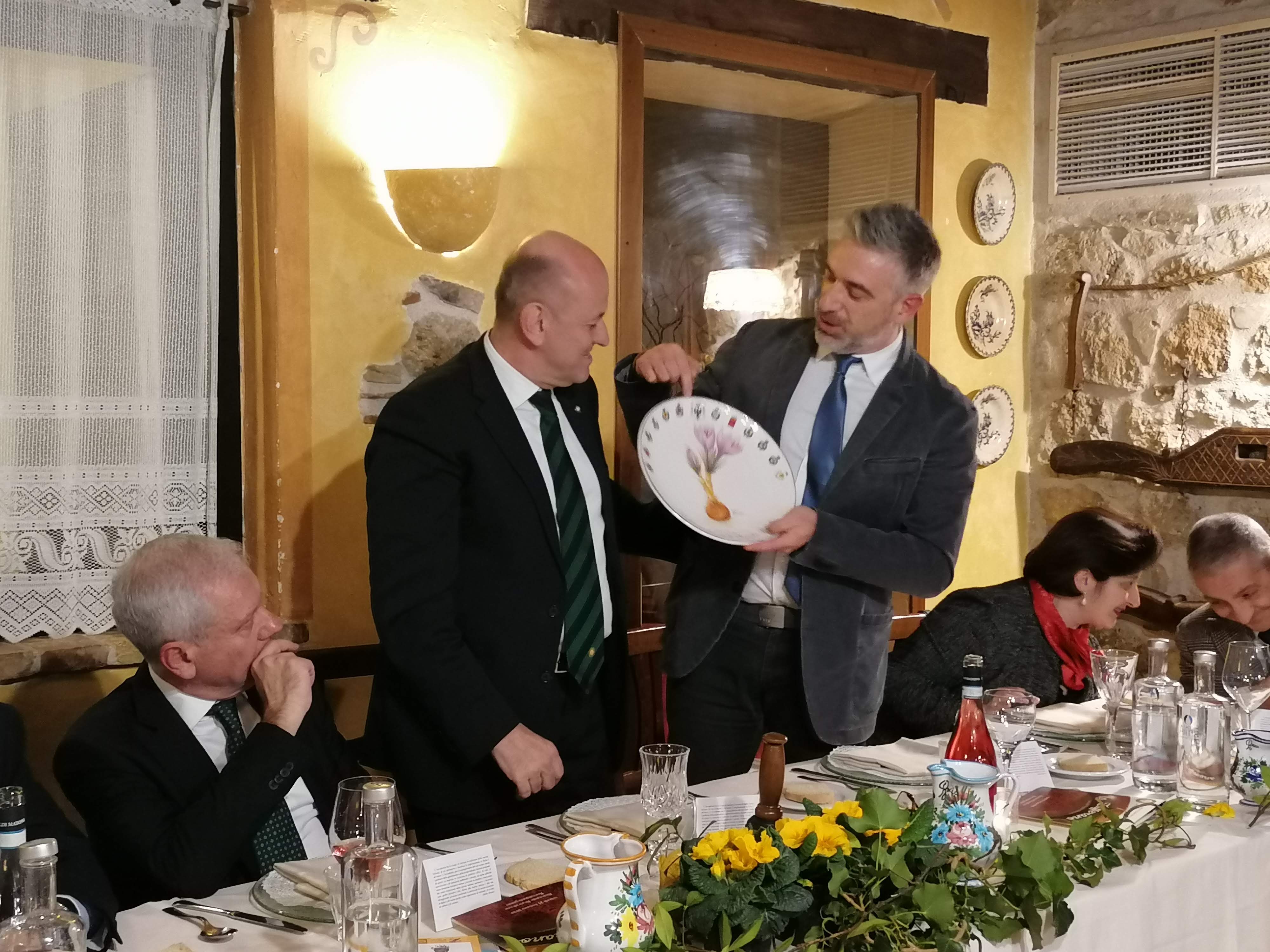 Il ristorante Brancaleone di Roccamontepiano ha ospitato la Delegazione di Chieti per una particolare riunione conviviale a tema sullo zafferano, nata da un'idea del Coordinamento Territoriale di dedicare a uno dei prodotti territoriali più noti e apprezzati una serata speciale. Sette le sfumature di zafferano presentate nei piatti che lo hanno esaltato senza stancare. Ospiti degli Accademici teatini sono stati il presidente del Consorzio per la Tutela dello Zafferano dell'Aquila DOP, Massimiliano D'Innocenzo e il Prefetto di Chieti Giacomo Barbato. Foto 1. Il Delegato Nicola D'Auria (in piedi) introduce la serata. Foto 2. Il Delegato e Massimiliano D'Innocenzo. Foto 3. In piedi il Consultore Antonello Antonelli, Accademici e ospiti. Foto 4. Tacchino alla canzanese con gelatina di zafferano.