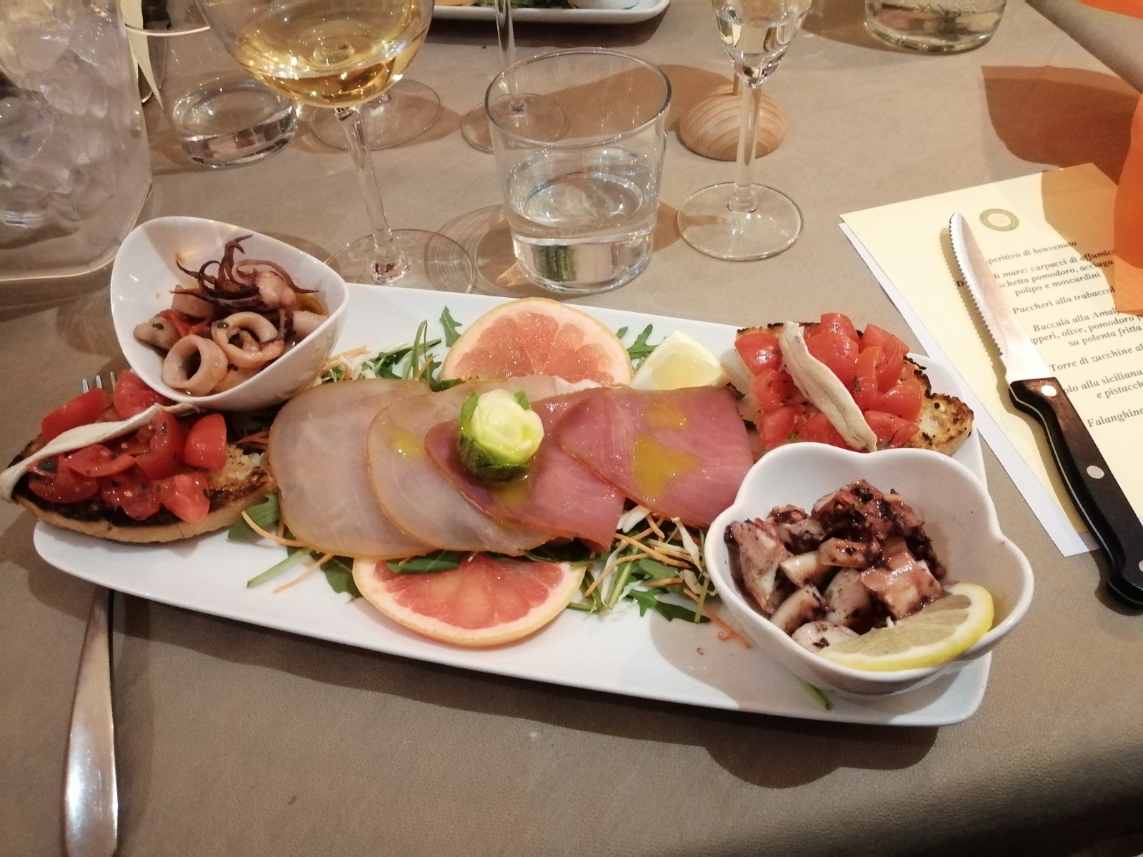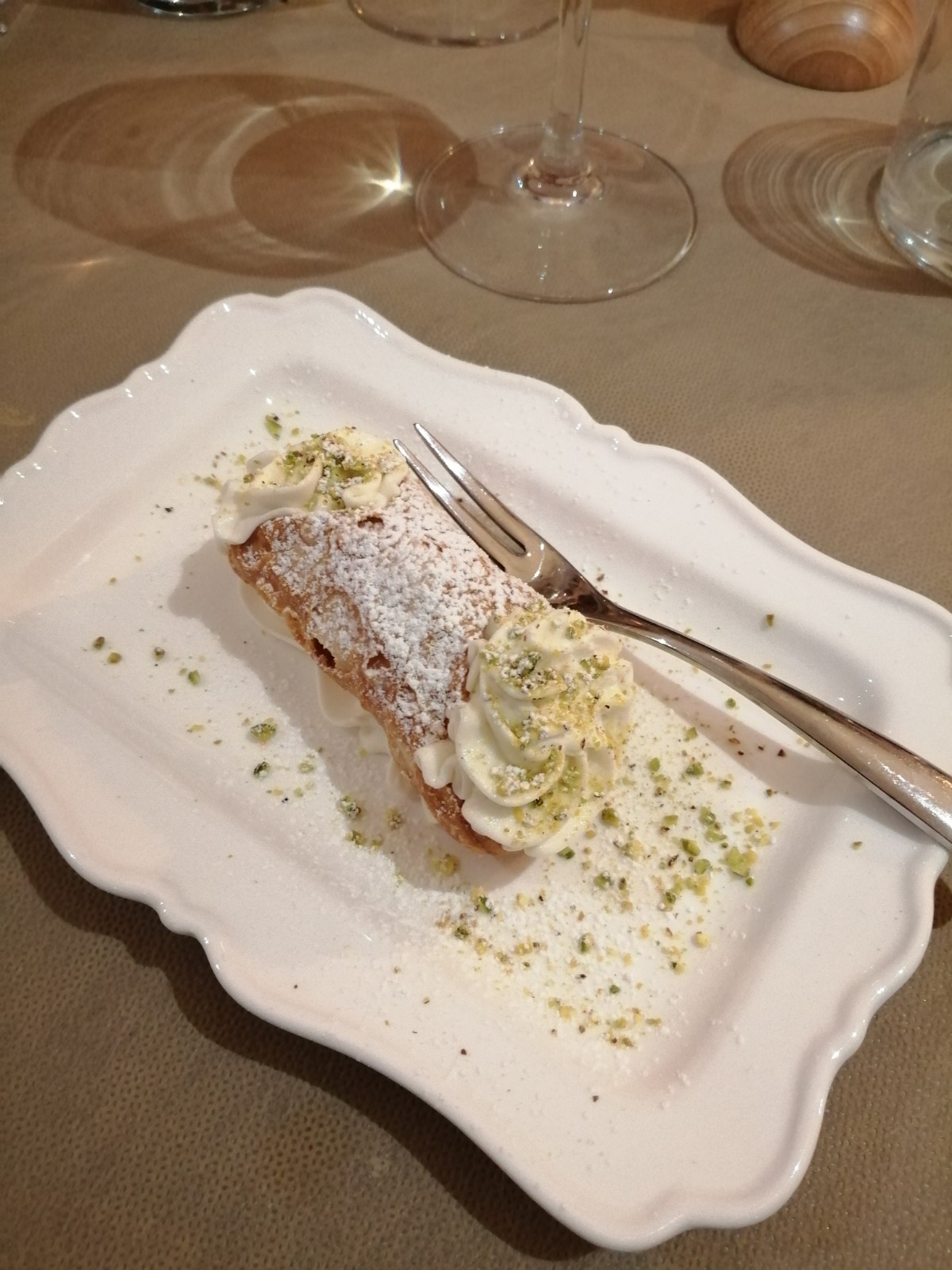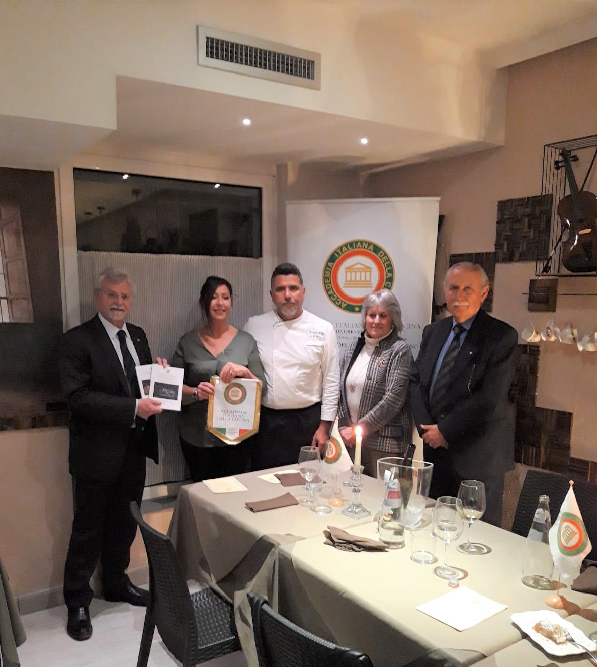 Si è tenuta presso il ristorante "L'imperfetto" di Figline Valdarno, la riunione conviviale organizzata dalla Delegazione del Valdarno Fiorentino. In foto 1 (da sinistra). Il Delegato Ruggero Larco, i proprietari Isabella Bini e Attilio D'Avanzo con i Simposiarchi Antonella Bizzarri e Francesco Corsico. Foto 2. Aperitivo di benvenuto. Foto 3. Dubbio di mare, antipasto. Foto 4. Cannolo alla siciliana.