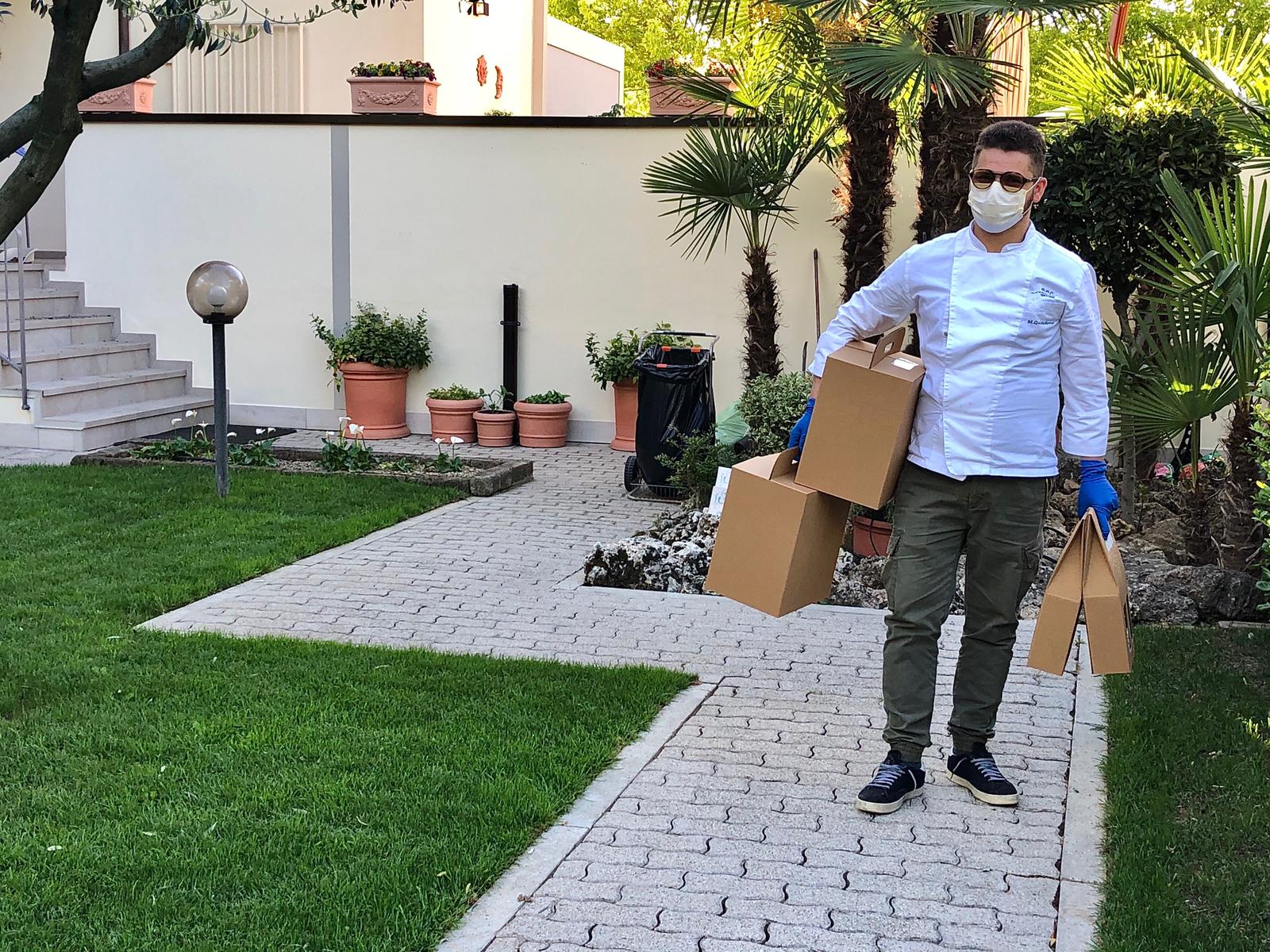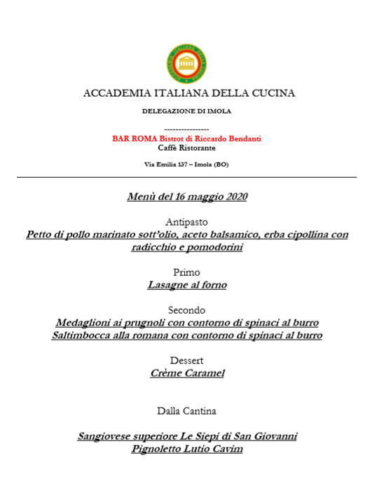 E' stato un locale storico del centro cittadino, il Bar Roma Bistrot, a consegnare a casa degli Accademici i pasti dedicati a piatti con un mix di territorio e stagionalità e abbinati ai vini di due cantine della zona imolese. I riscontri ed i commenti espressi durante la conviviale in videochiamata hanno privilegiato il petto di pollo marinato, le lasagne al forno, i medaglioni ai prugnoli e il crème caramel. Non è mancato il plauso finale allo storico gestore Riccardo. Foto 1. Riccardo Bendanti consegna i pasti. Foto 2. I piatti del menu. Foto 3. Un momento della Conviviale. Foto 4. Lasagne al forno.