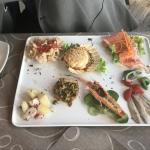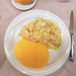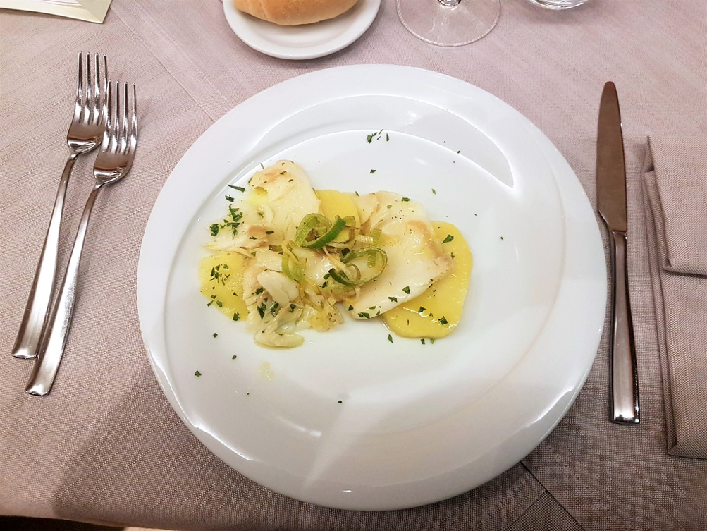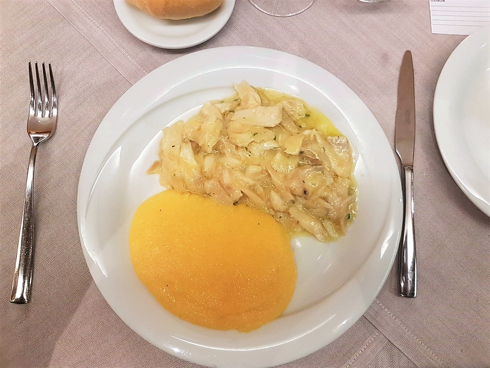 La Delegazione di Belluno-Feltre-Cadore si è ritrovata al ristorante Croce d’Aune sull’omonimo passo per gustare il baccalà. La cena è stata preceduta, dopo i saluti e le comunicazioni del Delegato Brenno Dal Pont, da una interessante relazione storica del simposiarca Bruno Calamina che ha tratteggiato la figura del nobiluomo e comandante Pietro Querini, degno interprete del commercio mercantile del 1400 da parte della Serenissima Repubblica di Venezia, noto per aver scoperto e successivamente favorito la diffusione nei territori veneti dello stoccafisso. Foto 1. Il Delegato con la titolare del ristorante. Foto 2. L'elegante allestimento della tavola. Foto 3. Baccalà bollito. Foto 4. Baccalà alla vicentina.