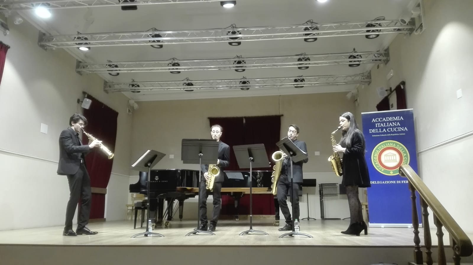 In occasione della riunione conviviale per gli auguri di Natale, la Delegazione ha promosso un concerto di sax aperto al pubblico presso il locale Conservatorio (foto 1) per poi riunirsi a tavola presso il ristorante dell'Hotel Astoria. L'evento è stato patrocinato dal Comune di Fermo e dal Conservatorio G.B. Pergolesi. Alla cena, impeccabilmente organizzata dalle Simposiarche Michela Ciciretti e Mara Palmieri, hanno partecipato il Sindaco di Fermo avv. Paolo Calcinaro e numerosi ospiti. Un intervento del prof. Tommaso Lucchetti ha edotto i convenuti sulle tradizioni del Natale nelle Marche. A suggello del clima di festa l'ingresso di due nuovi Accademici Giuseppe Corvari (foto 2) e Francesco Ercoli (foto 3). Agli Accademici è stata donata la riedizione de "Il cuoco delle Marche"del 1864 (foto 4) dalla quale il menu della serata aveva tratto ispirazione.