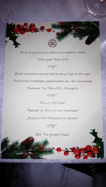 Pranzo di Natale della Delegazione di Novara al ristorante Arianna di Cavaglietto, ispirato ai menu degli anni ’60, anno di nascita della Delegazione. Grande partecipazione di Accademici, legati da sincera amicizia. Presente la Direttrice del Centro Studi Territoriale Piemonte Elisabetta Cocito omaggiata con un panettone artistico di buon augurio. Lo chef Pier Giuseppe Viazzi con il Delegato Piero Spaini. 2. Elisabetta Cocito riceve il panettone artistico degli auguri. 3.Il menu anni ’60, in francese come allora. 4. La pera “ Belle Helene “.