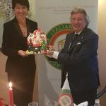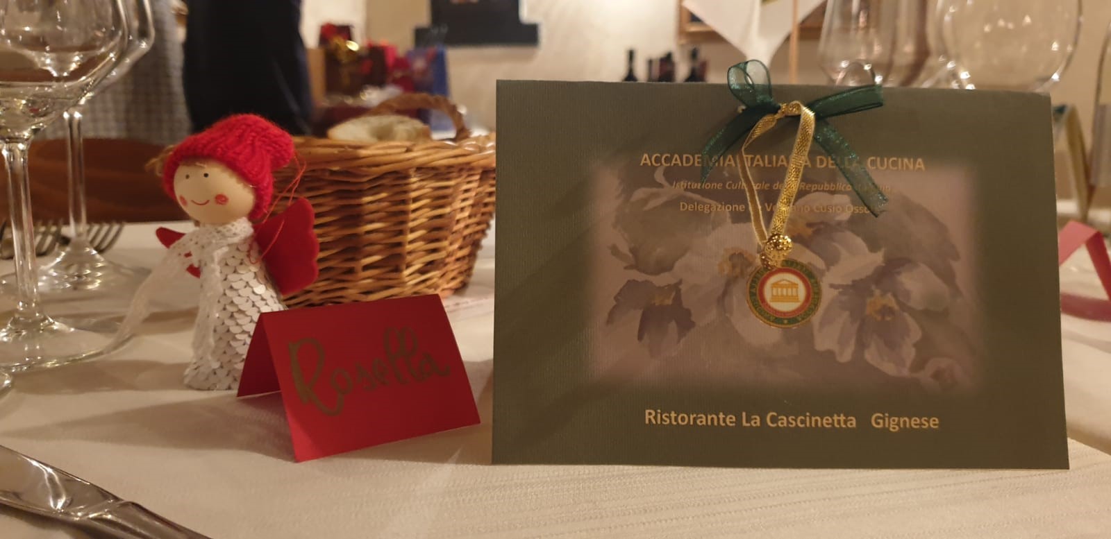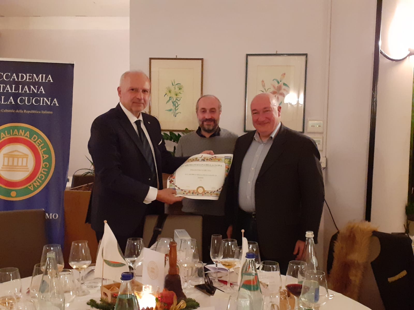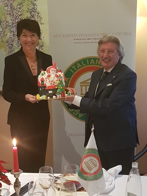 La Delegazione del Verbano-Cusio-Ossola ha organizzato la cena degli auguri di Natale presso "La Cascinetta" a Gignese (VB) in un paesaggio quasi fiabesco, ai piedi del Mottarone innevato, per trascorrere una piacevole serata tra Accademici e ospiti (foto 1) nelle accoglienti salette del ristorante. Foto 2. Il Delegato Pier Carlo Lincio consegna il piatto dell'Accademia ai fratelli Malerba, Federico (chef) e Giancarlo (sommelier). Foto 3. La torta realizzata per la Delegazione.