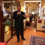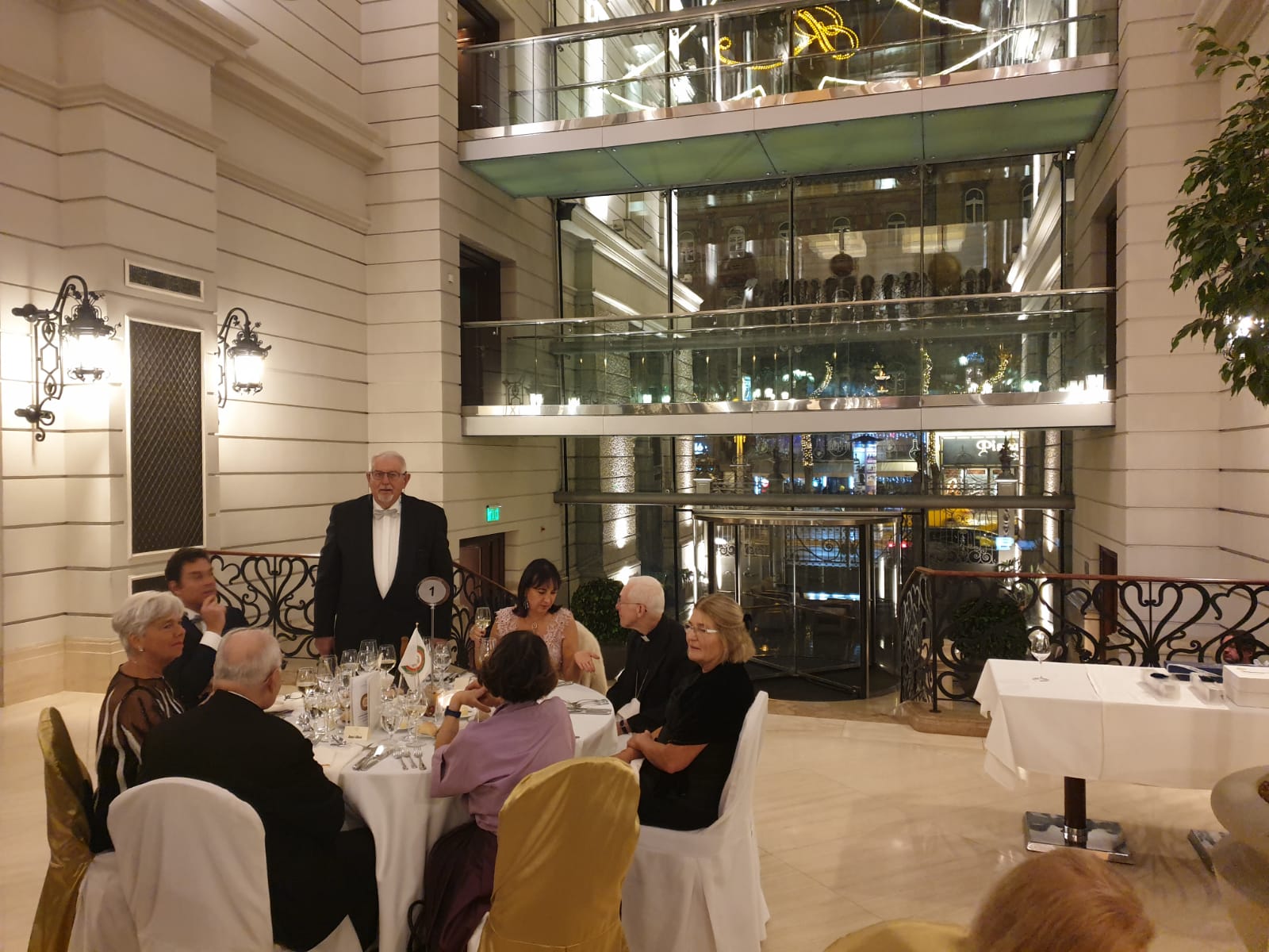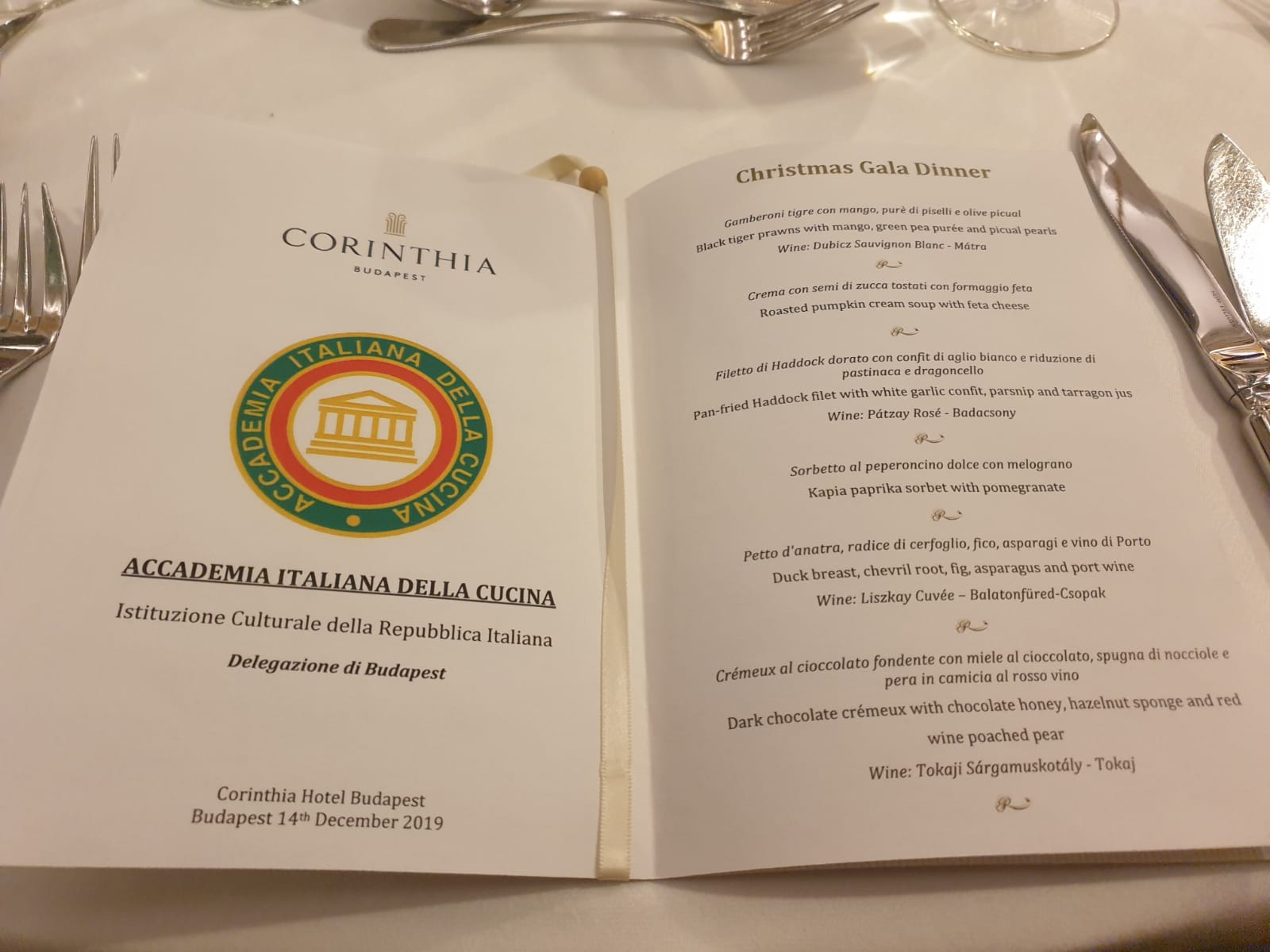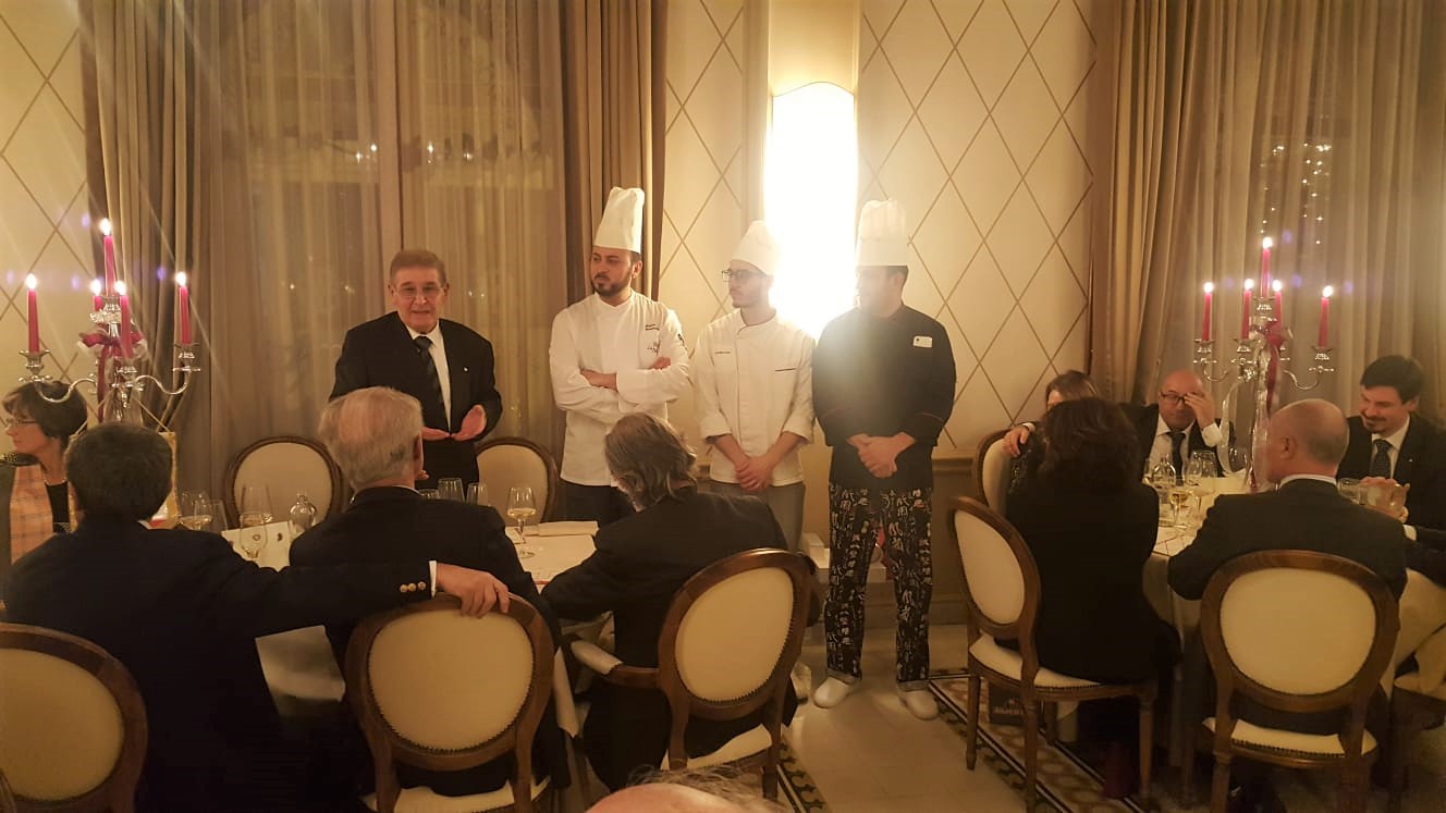 Anche quest'anno la Delegazione di Budapest ha organizzato il “Gala degli Auguri” presso il prestigioso Grand Hotel Royal Corinthia. Oltre alla presenza di numerosi Accademici e ospiti, hanno partecipato S.E. Massimo Rustico Ambasciatore d’Italia accompagnato dalla consorte Monica che ha rimarcato l’importanza della presenza dell’Accademia nel contesto ungherese, S.E. Pacsay Orsolya Segretario di Stato agli Esteri del governo ungherese, S.E. Blume Michael Nunzio apostolico, S.E. Samia Ilhem Ammar Ambasciatore di Tunisia (Accademica onoraria), nonché l'Accademico onorario S.E. Alberto Bottari de Castello Nunzio apostolico che ha impartito la sua apostolica benedizione. Durante la serata sono stati ufficialmente introdotti due nuovi Accademici: Eva Maria Gemné Merenyi e Omar Balducci (foto 1). Il menu di pesce e di carne (foto 4), molto raffinato, l’eccellenza nella preparazione e presentazione dei piatti, i vini abbinati e l’efficiente servizio sono stati un degno coronamento all'ottima riuscita della serata, conclusasi in un clima di grande allegria e amicizia. Foto 2. il Delegato Alberto Tibaldi. Foto 3. Accademici e ospiti.