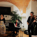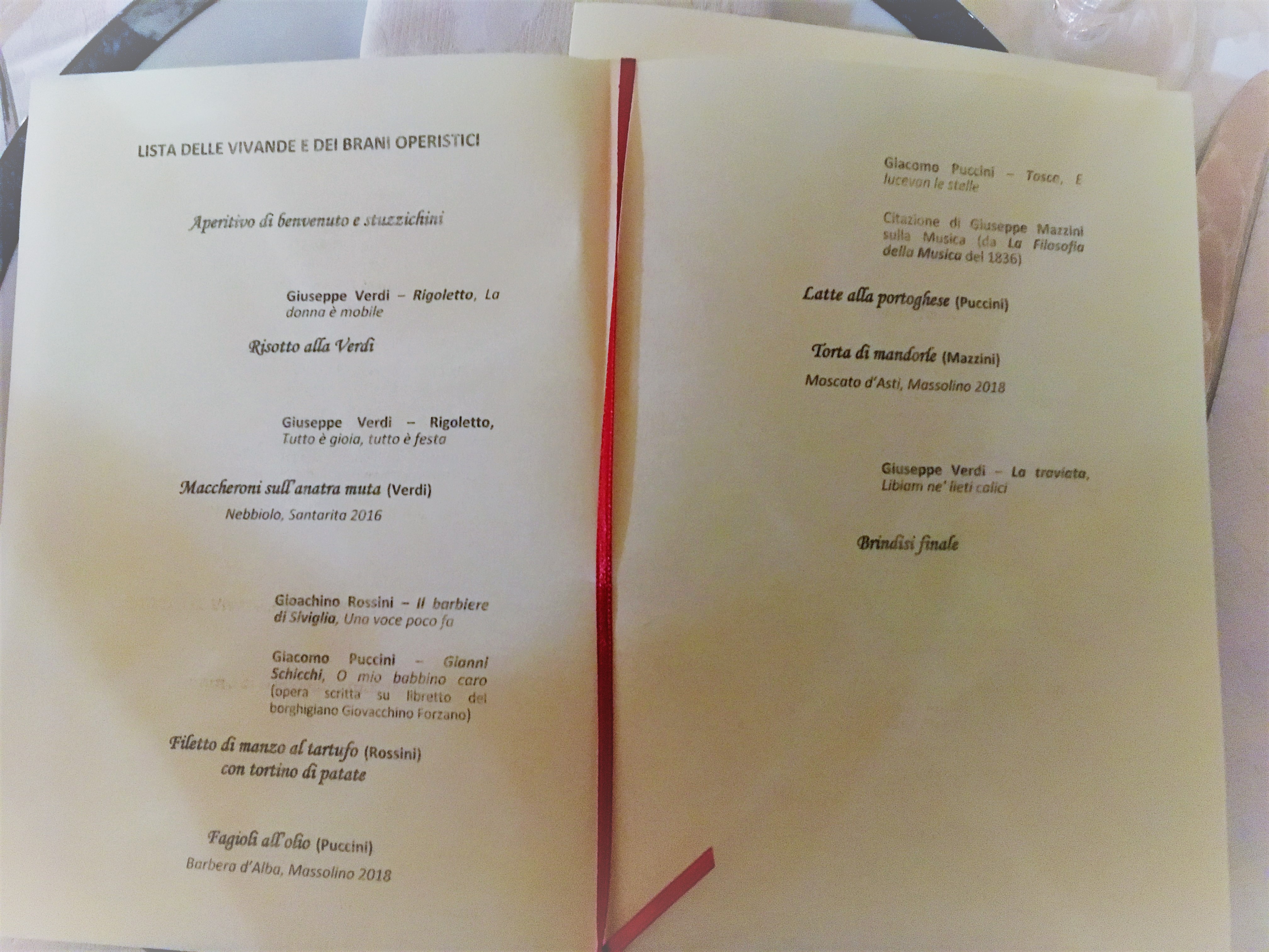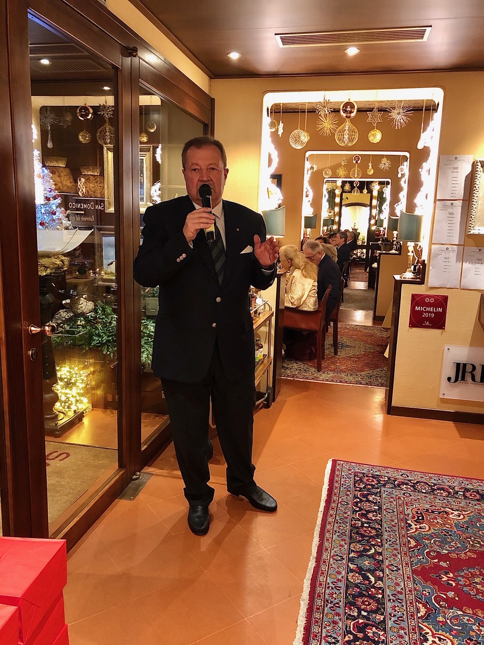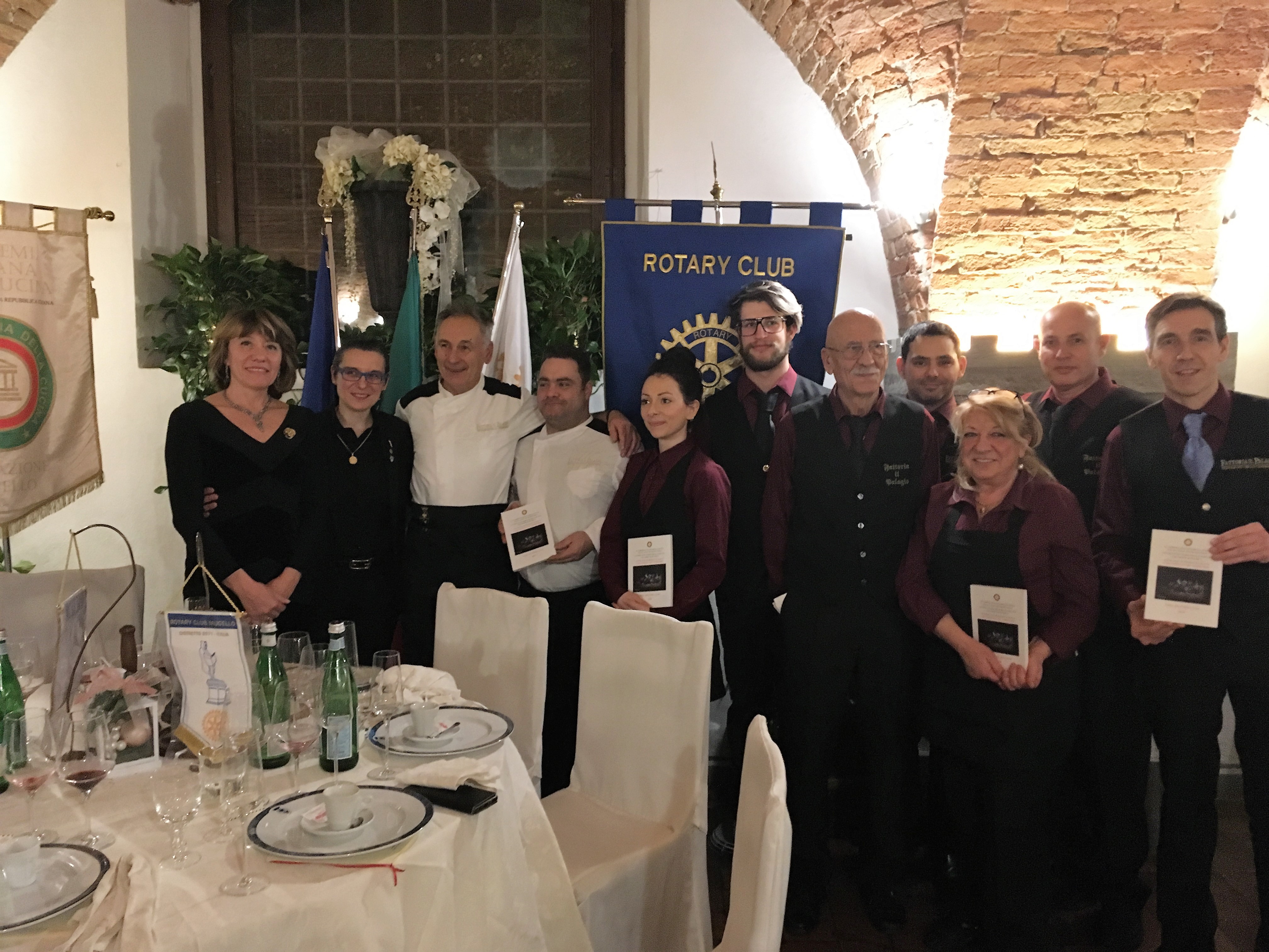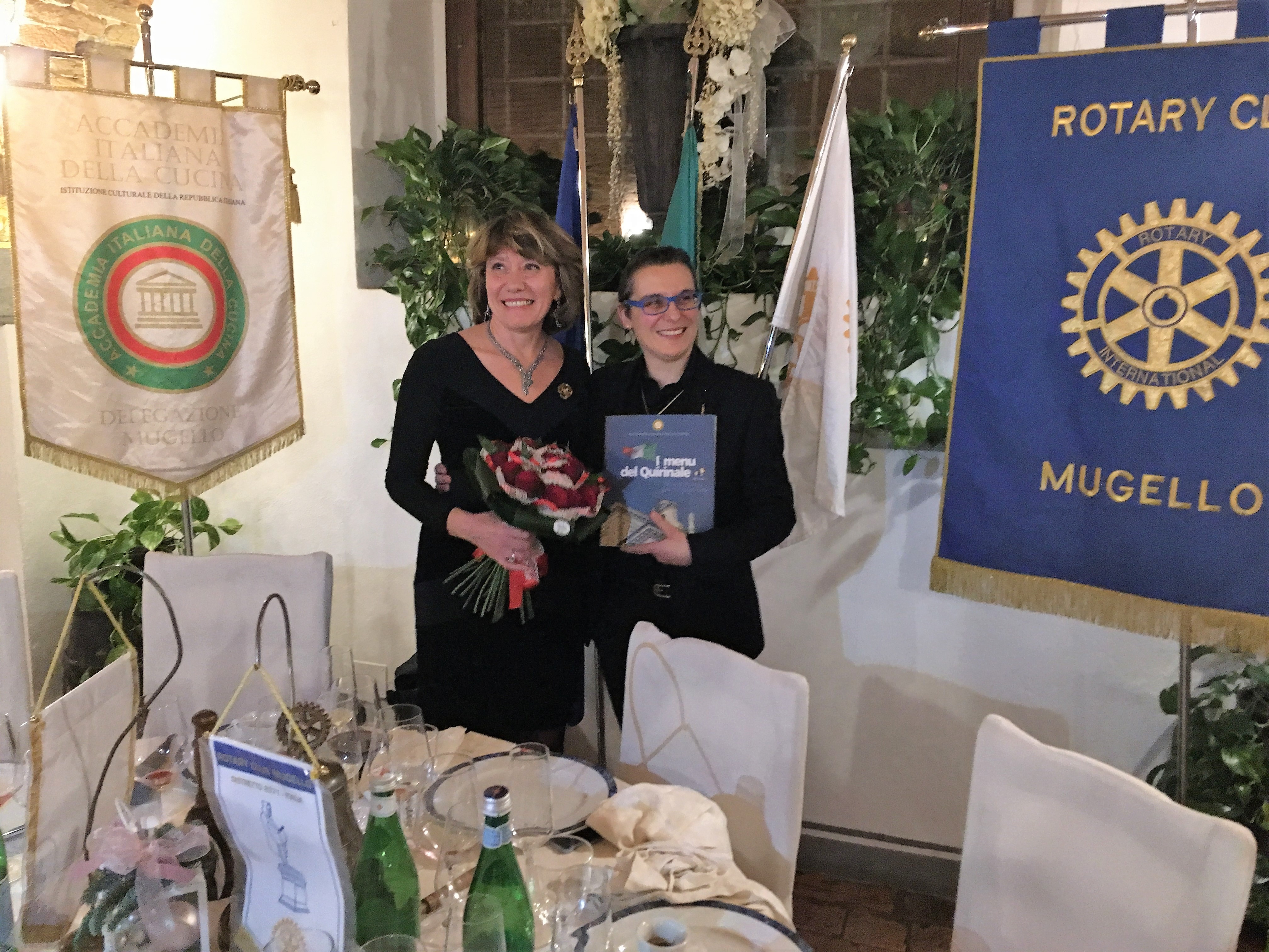La Delegazione del Mugello, in collaborazione con il Rotary Club Mugello, ha organizzato la riunione conviviale degli auguri sul tema "Sinfonie di gusti" nei locali della Fattoria Il Palagio (Scarperia). Per l'occasione il menu è stato composto con le ricette di alcuni piatti amati dai tre grandi compositori italiani Verdi, Rossini e Puccini. Ogni piatto è stato introdotto da suggestive arie tratte da alcune celebri opere dei grandi Maestri, eseguite dal Quintetto "Camerata de' Bardi" con due voci soliste, in un emozionante alternarsi di musica e cibo. Foto 1. La Delegata Monica Sforzini e la Presidente Rotary Sabrina Landi Malavolti. Foto 2. La Delegata con la Presidente Rotary, la brigata di cucina e il personale di sala del Palagio. Foto 3. La Camerata de' Bardi. Foto 4. Il menu.