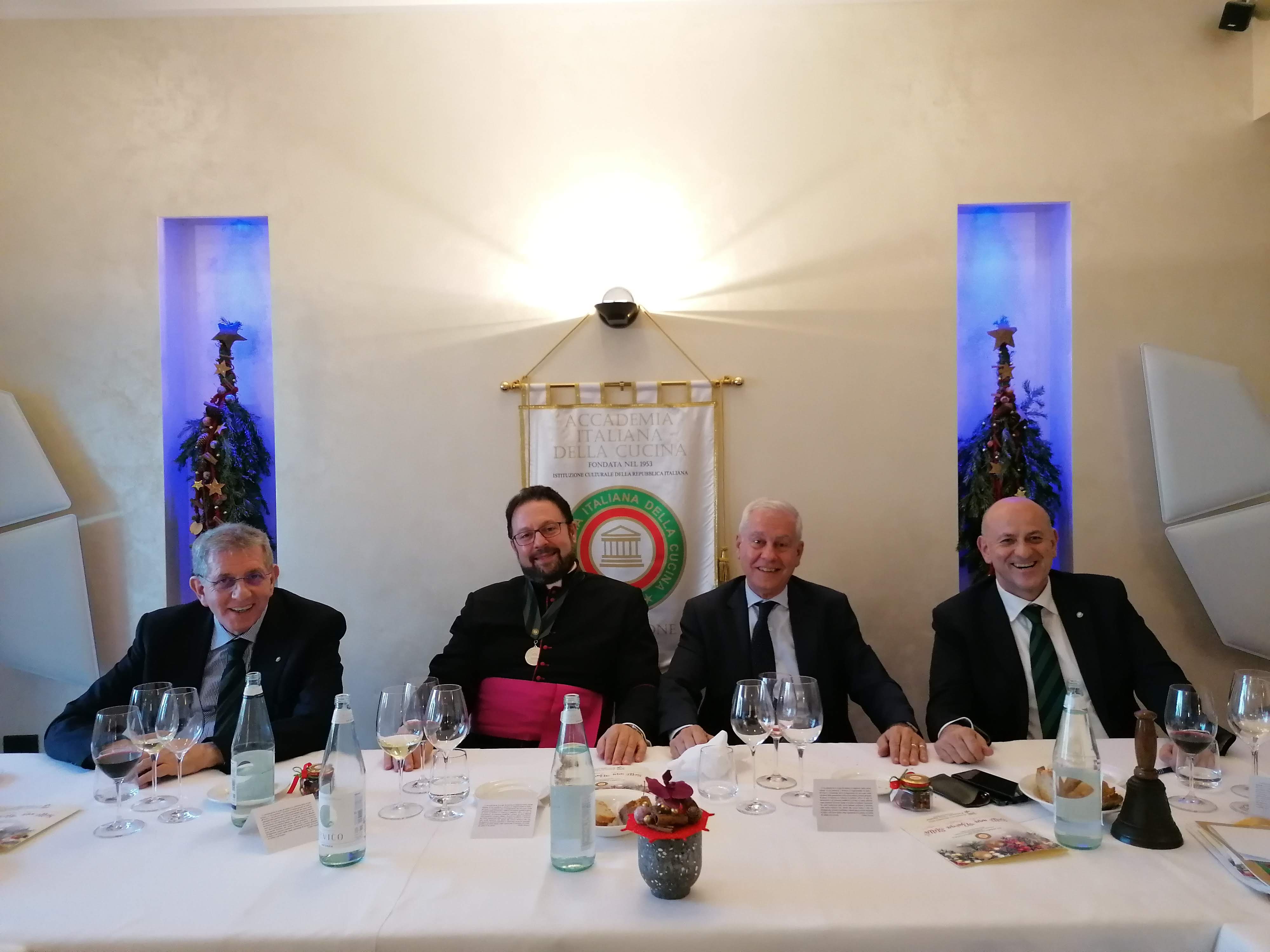 Riunione conviviale degli auguri per le feste imminenti molto sentita e partecipata da parte degli Accademici di Cosenza (foto 1) che si sono riuniti presso il ristorante "La Tavernetta" di Camigliatello Silano. La serata è stata concepita insieme al giovane chef Emanuele Lecce (foto 2), tra i piatti della tradizione della sera della vigilia che guardano al pesce (foto 3) e quelli del pranzo di Natale dedicati alla carne (foto 4), con la conclusione della varietà dei dolci del periodo. La relazione del Simposiarca Eugenio Rogano ha contestualizzato la circostanza con aneddoti e citazioni colte; l'accompagnamento di un pianoforte, i cori natalizi e un bellissimo caminetto hanno reso l'atmosfera particolarmente coinvolgente.